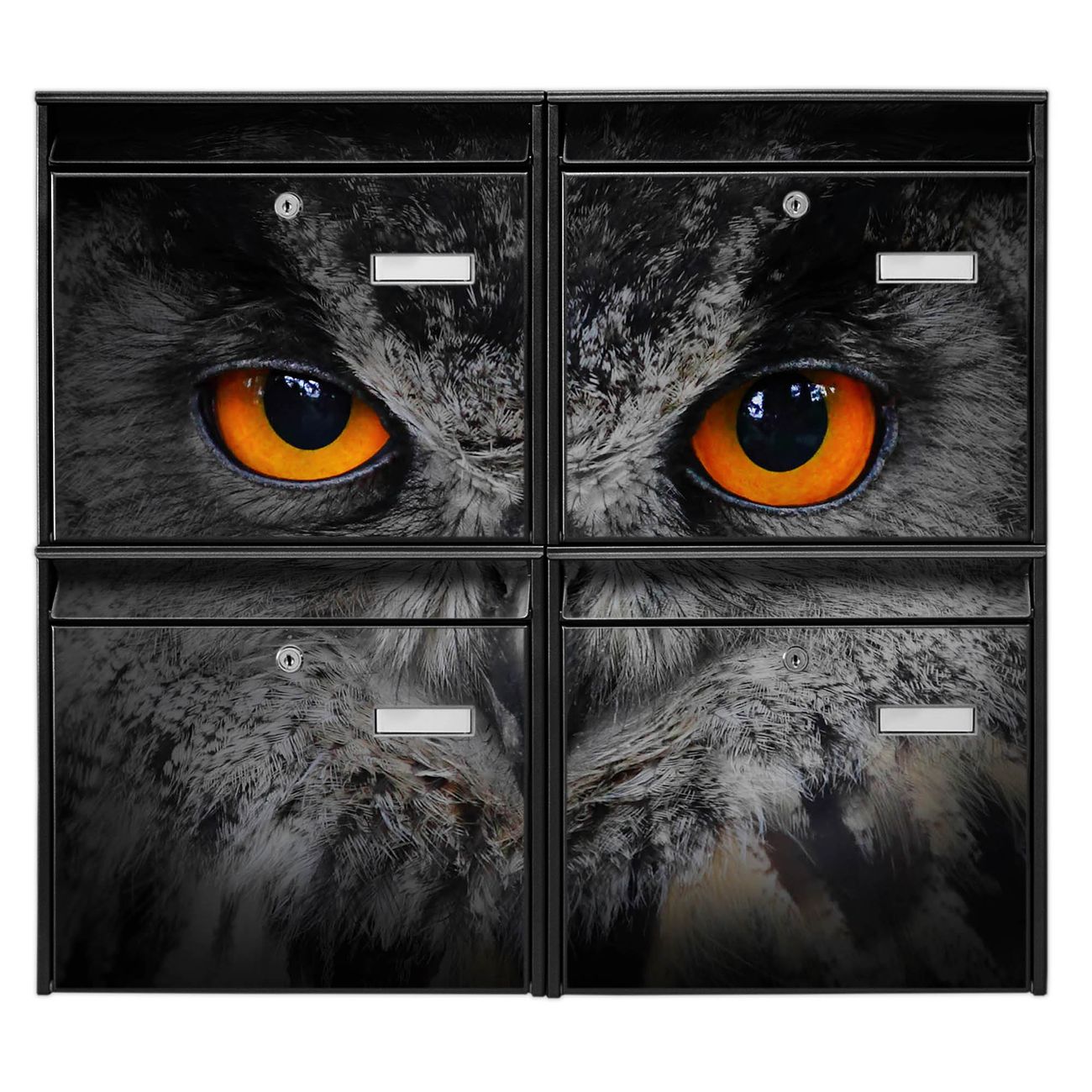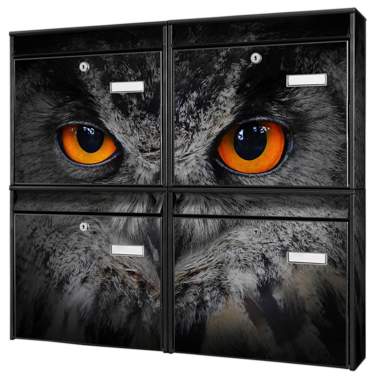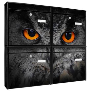 FUNKTION: Die Burg-Wächter Briefkastenanlage mit Motiv Uhu bietet Ihnen ausreichend Fassungsvermögen um auch A4 und C4 Sendungen zu empfangen. Das integrierte Namensschild lässt sich individuell beschriften. Wählen Sie aus den Grundfarben weiß, silber und schwarz. DESIGN: Die 4 Briefkästen haben ein ansprechendes und zeitloses Design, ohne dabei auf Funktionalität zu verzichten. Das Material ist sehr stabil, wetterfest und rostfrei. Durch das Motiv Uhu werden die Postkästen zu einem Blickfang. DETAILS: Die Postkästen bestehen aus verzinktem Stahl der zusätzlich mit Klarlack versiegelt wurde. Die Kästen sind gesamt 64,5cm hoch, 72,5cm breit und 10cm tief. Das Motiv besteht aus einer wetter- und UV-festen Folie, die Ihren Briefkasten zusätzlich vor Kratzern schützt. Die Postkästen werden mit Montagematerial, je einem Namensschild und je zwei Schlüsseln geliefert. NUTZEN: Das Briefkastenset eignet sich für die Wandmontage, die Größe bietet genügend Platz für Sendungen aller Art. Das zeitlose Design sowie die stabile Bauart bieten Ihnen einen treuen Begleiter für Ihre Post. BANJADO: