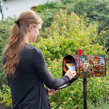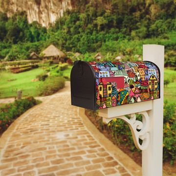 Der amerikanische Briefkasten von banjado mit Funky Town Motiv bietet Ihnen ausreichend Fassungsvermögen, um große A4 Sendungen und Zeitschriften zu empfangen. Die typisch amerikanische rote Fahne zeigt Ihnen an, wenn Sie Post erhalten haben. Die US-Mailbox besteht aus verzinktem Stahlblech welches lackiert wurde und ist 48 x 22 x 16 CM (BxHxT) groß. Die Folie mit Motiv Funky Town besteht aus einer wetter- und UV-resistenten Folie, die mit einem Schutzlaminat überzogen ist, sodass die US Mailbox zusätzlich vor Kratzern geschützt ist. An der Unterkante sind 4 Löcher je Seite um die Mailbox, typisch amerikanisch, an einem Holzpfahl oder einem Zaun zu befestigen. Auf Wunsch können Sie bei uns den passenden Standfuß oder die passende Wandhalterung kaufen um die US-Mailbox sicher zu befestigen. Wir bieten Ihnen ebenfalls Namensschilder, bereits beschriftet oder frei zu beschriften, und verschiedene selbst gestaltete Bitte-Keine-Werbung-Aufkleber.