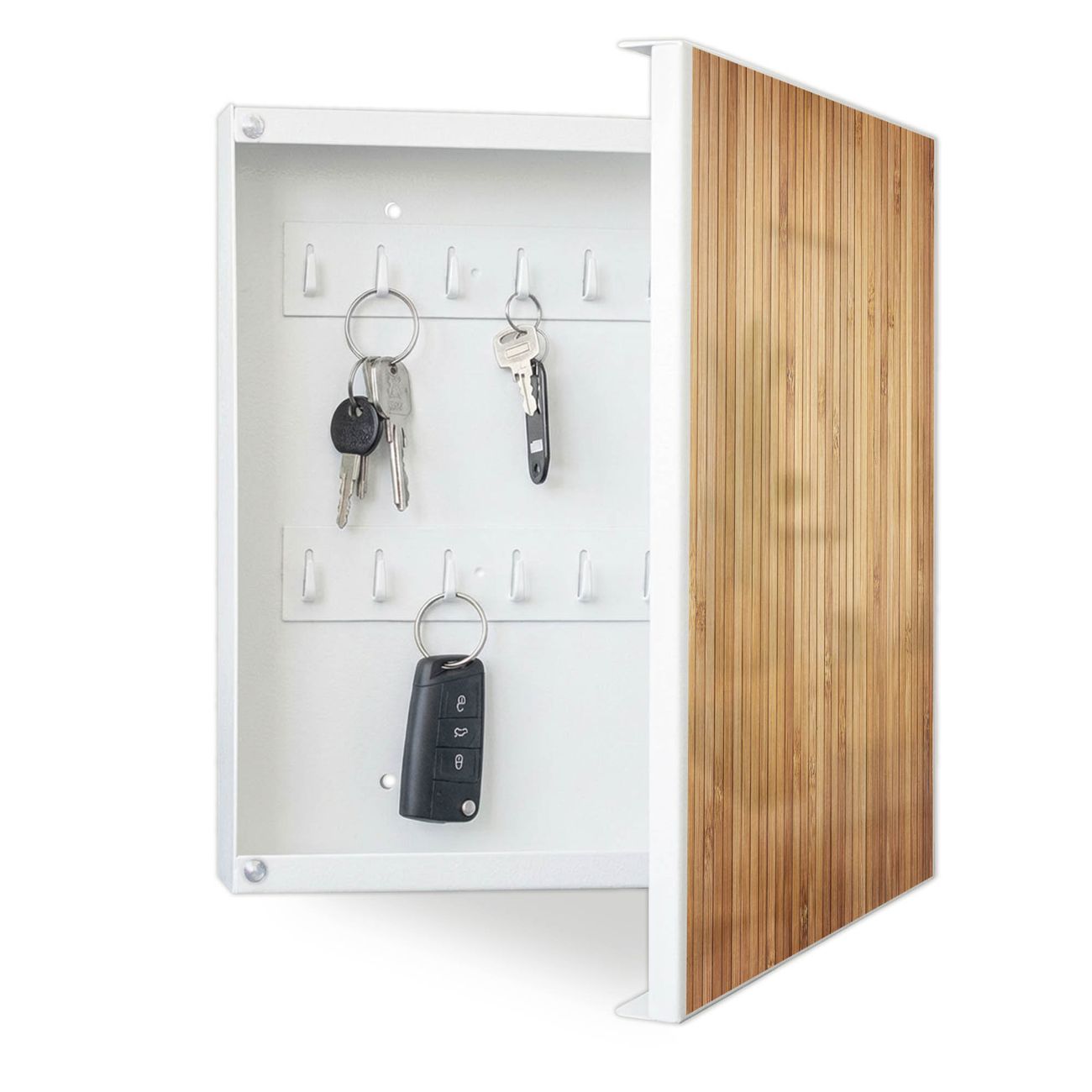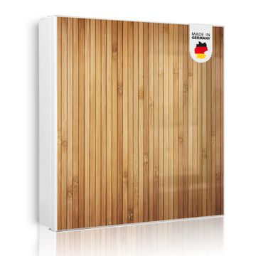 Der Design-Schlüsselkasten Motiv Motiv Bambusholz bietet Platz für bis zu 32 Schlüssel, die auf 4 stabilen Reihen mit je 8 Haken übersichtlich verstaut werden. Mit seinen kompakten Maßen von 30 x 30 x 5 cm passt die Schlüsselbox perfekt auch in kleinere Räume. Der weiß lackierte Stahlkorpus mit rechts angeschlagenem Türscharnier harmoniert mit gedruckten Folie auf der Front und fügt sich nahtlos in jedes Wohnambiente ein.