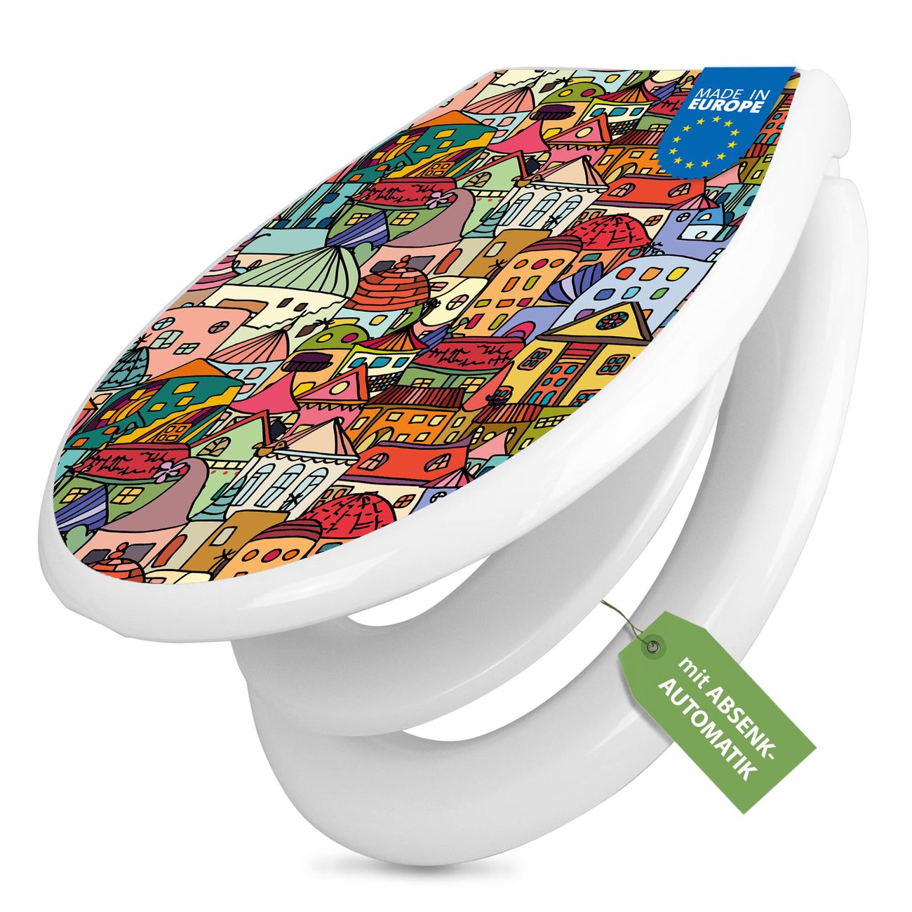 FUNKTION:Mit dem banjado Familien WC Sitz mit Absenkautomatik und dem Motiv Motiv Funky Town verbinden Sie Design mit Funktionalität. Sie erhalten den Toilettendeckel in bewährt guter Qualität mit Montagematerial passend auf alle Euro-WC-Becken. Die Gesamtgröße beträgt 37,1cm x 44,9cm x 5cm, die Grundfarbe ist weiß.</p> DESIGN:Der Klodeckel in weiß mit Motiv Motiv Funky Town hat eine ansprechende Optik, eine besondere Form und ist sehr stabil. Das Motiv besteht aus einer farbbrillianten Motivfolie, die durch ein Schutzlaminat zusätzlich vor Kratzern schützt. Der integrierte Kindersitz fügt sich harmonisch ein. DETAILS:Der Toilettensitz mit Soft Close besteht aus hochwertigem Polypropylen, ist geruchlos, ungiftig und kann mit handelsüblicher Seife gereinigt werden. Die Montage kann von von oben oder von unten erfolgen und ist kinderleicht. NUTZEN:Mit Hilfe der detaillierten Aufbauanleitung ermöglichen wir eine schnelle und unkomplizierte Montage. Die banjado Klobrille ist universell geeignet für alle Euro-WC-Schüsseln. Der Kindersitz kann unkompliziert entfernt werden. BANJADO:Ihr WC-Deckel wird in Sachsen in einer kleinen Manufaktur von Hand veredelt. Die Motivfolie ist lösungsmittelfrei und schutzlaminiert für einen langen Halt. Wir wünschen viel Freude bei der Auswahl eines schönen Motivs.