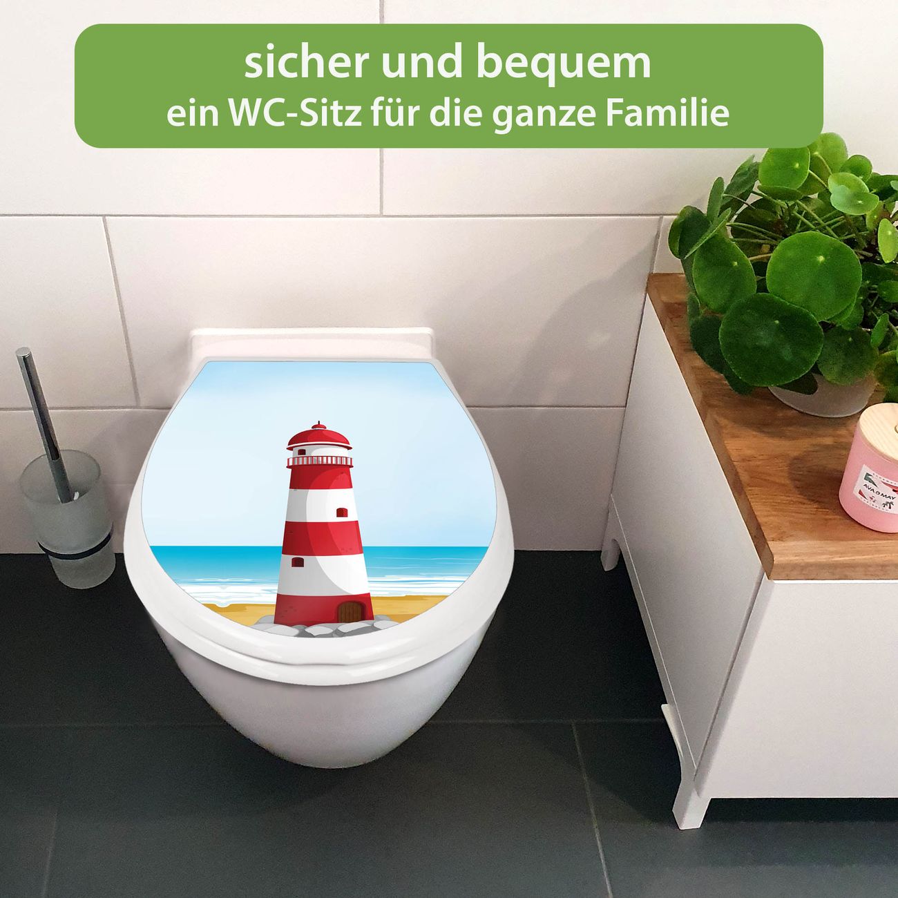 DESIGN:Der Klodeckel in weiß mit Motiv Motiv Leuchtturm Illustration hat eine ansprechende Optik, eine besondere Form und ist sehr stabil. Das Motiv besteht aus einer farbbrillianten Motivfolie, die durch ein Schutzlaminat zusätzlich vor Kratzern schützt. Der integrierte Kindersitz fügt sich harmonisch ein.