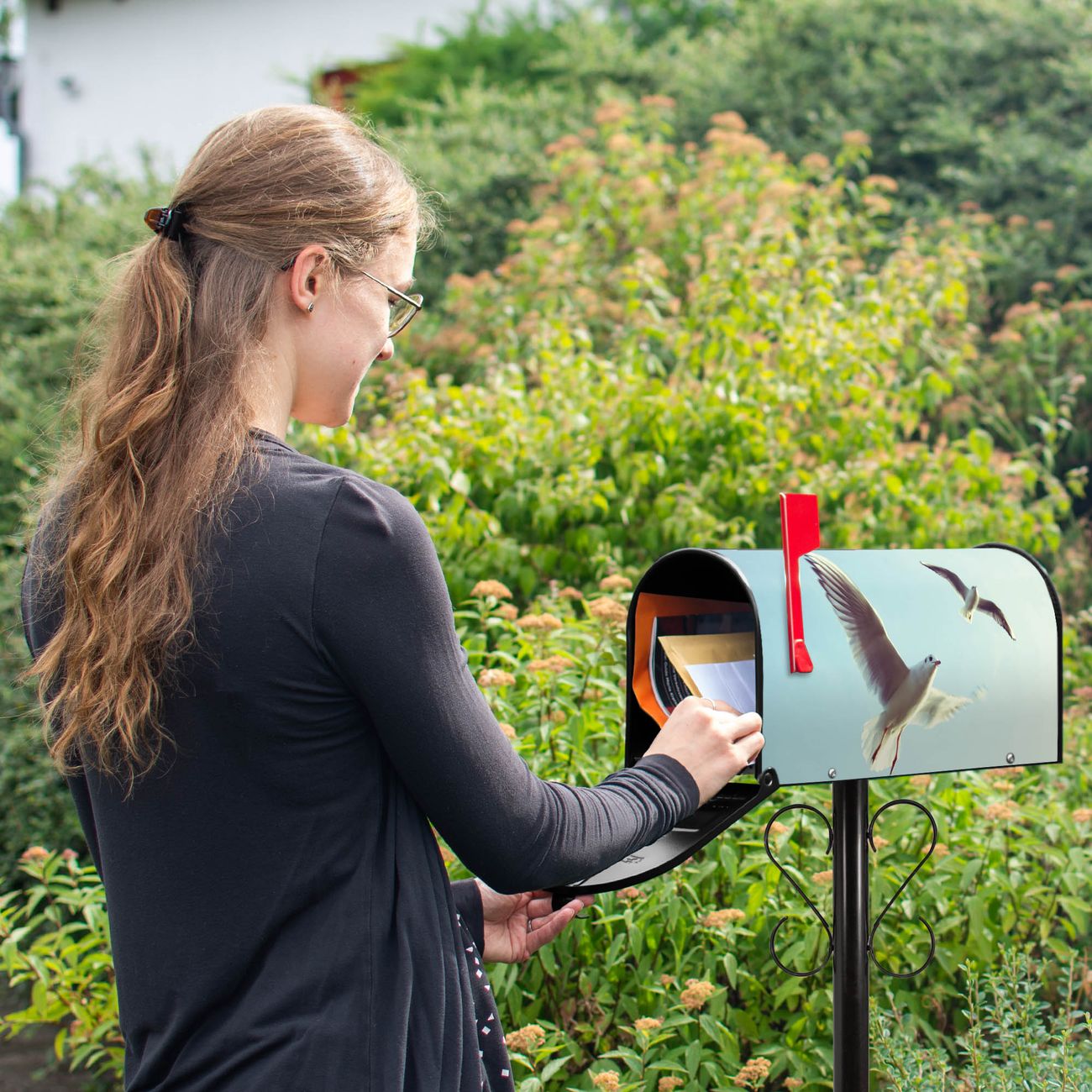 Der amerikanische Briefkasten von banjado mit 2 Möwen Motiv bietet Ihnen ausreichend Fassungsvermögen, um große A4 Sendungen und Zeitschriften zu empfangen. Die typisch amerikanische rote Fahne zeigt Ihnen an, wenn Sie Post erhalten haben. Die US-Mailbox besteht aus verzinktem Stahlblech welches lackiert wurde und ist 48 x 22 x 16 CM (BxHxT) groß. Die Folie mit Motiv 2 Möwen besteht aus einer wetter- und UV-resistenten Folie, die mit einem Schutzlaminat überzogen ist, sodass die US Mailbox zusätzlich vor Kratzern geschützt ist. An der Unterkante sind 4 Löcher je Seite um die Mailbox, typisch amerikanisch, an einem Holzpfahl oder einem Zaun zu befestigen. Auf Wunsch können Sie bei uns den passenden Standfuß oder die passende Wandhalterung kaufen um die US-Mailbox sicher zu befestigen. Wir bieten Ihnen ebenfalls Namensschilder, bereits beschriftet oder frei zu beschriften, und verschiedene selbst gestaltete Bitte-Keine-Werbung-Aufkleber.