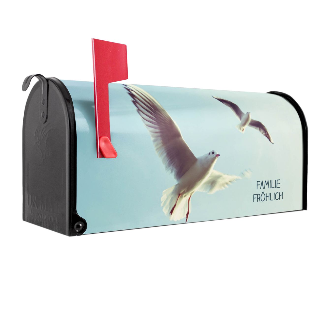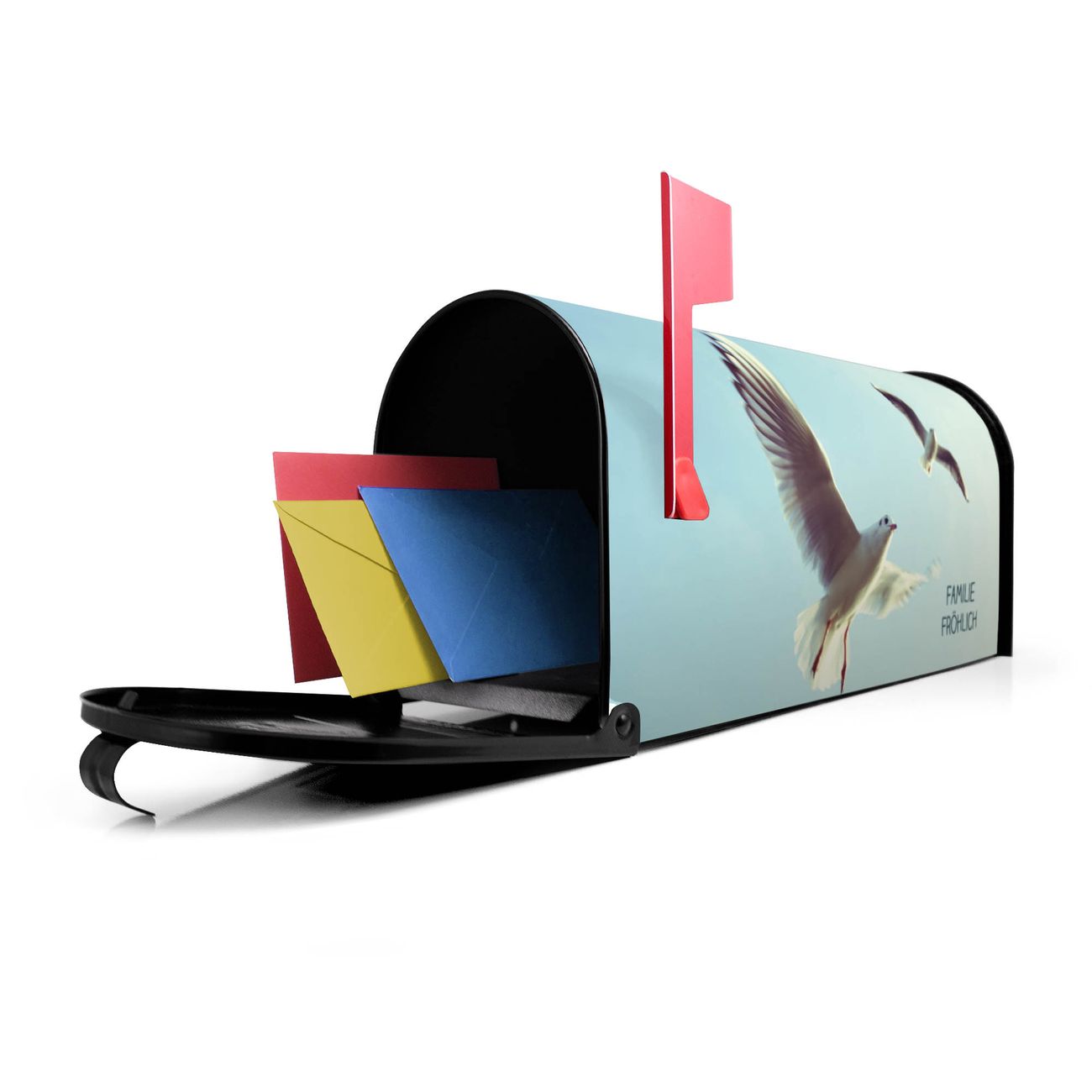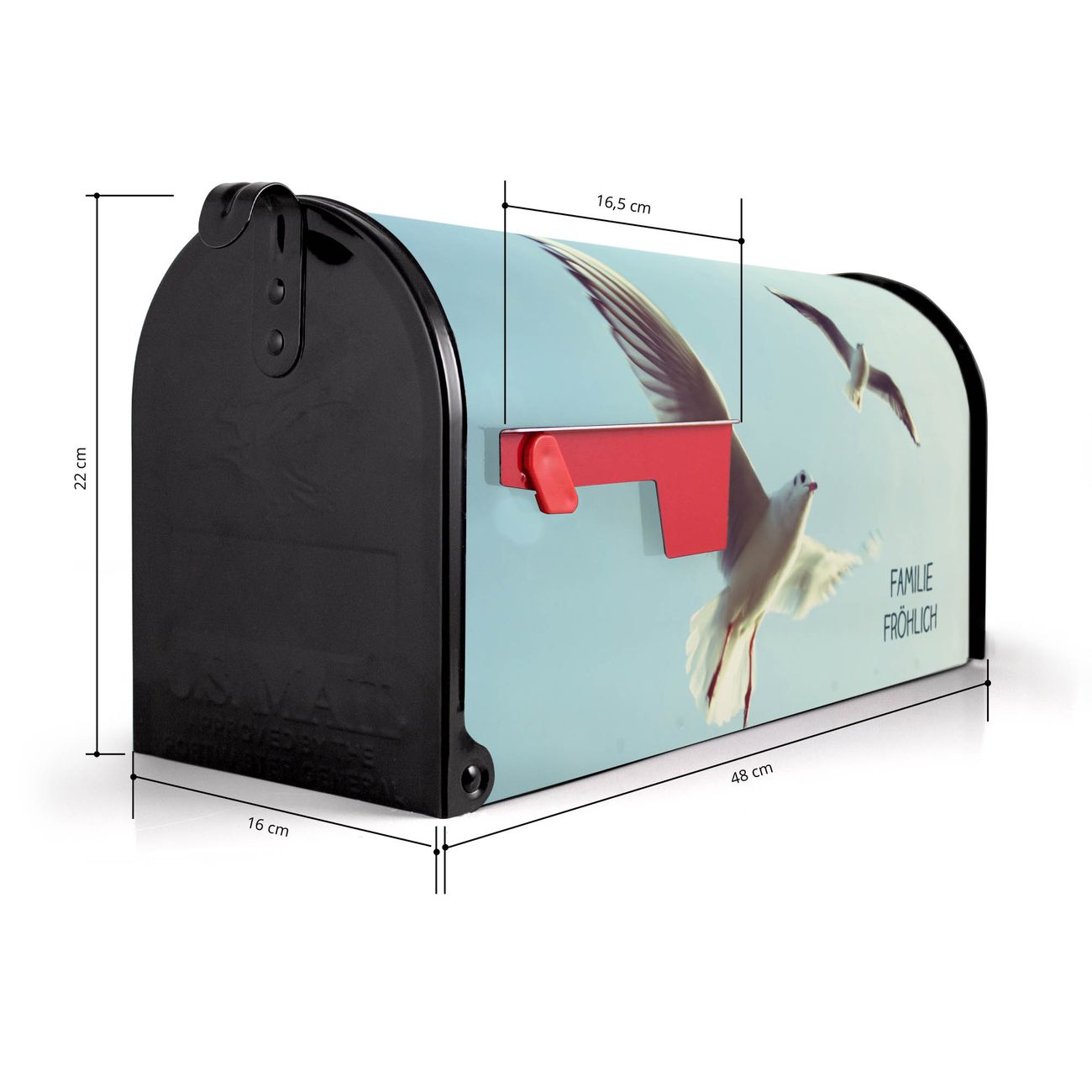 Der amerikanische Briefkasten von banjado mit 2 Möwen Motiv bietet Ihnen ausreichend Fassungsvermögen, um große A4 Sendungen und Zeitschriften zu empfangen. Die typisch amerikanische rote Fahne zeigt Ihnen an, wenn Sie Post erhalten haben. Die US-Mailbox besteht aus verzinktem Stahlblech welches lackiert wurde und ist 48 x 22 x 16 CM (BxHxT) groß. Die Folie mit Motiv 2 Möwen besteht aus einer wetter- und UV-resistenten Folie, die mit einem Schutzlaminat überzogen ist, sodass die US Mailbox zusätzlich vor Kratzern geschützt ist. An der Unterkante sind 4 Löcher je Seite um die Mailbox, typisch amerikanisch, an einem Holzpfahl oder einem Zaun zu befestigen. Auf Wunsch können Sie bei uns den passenden Standfuß oder die passende Wandhalterung kaufen um die US-Mailbox sicher zu befestigen. Wir bieten Ihnen ebenfalls Namensschilder, bereits beschriftet oder frei zu beschriften, und verschiedene selbst gestaltete Bitte-Keine-Werbung-Aufkleber.
