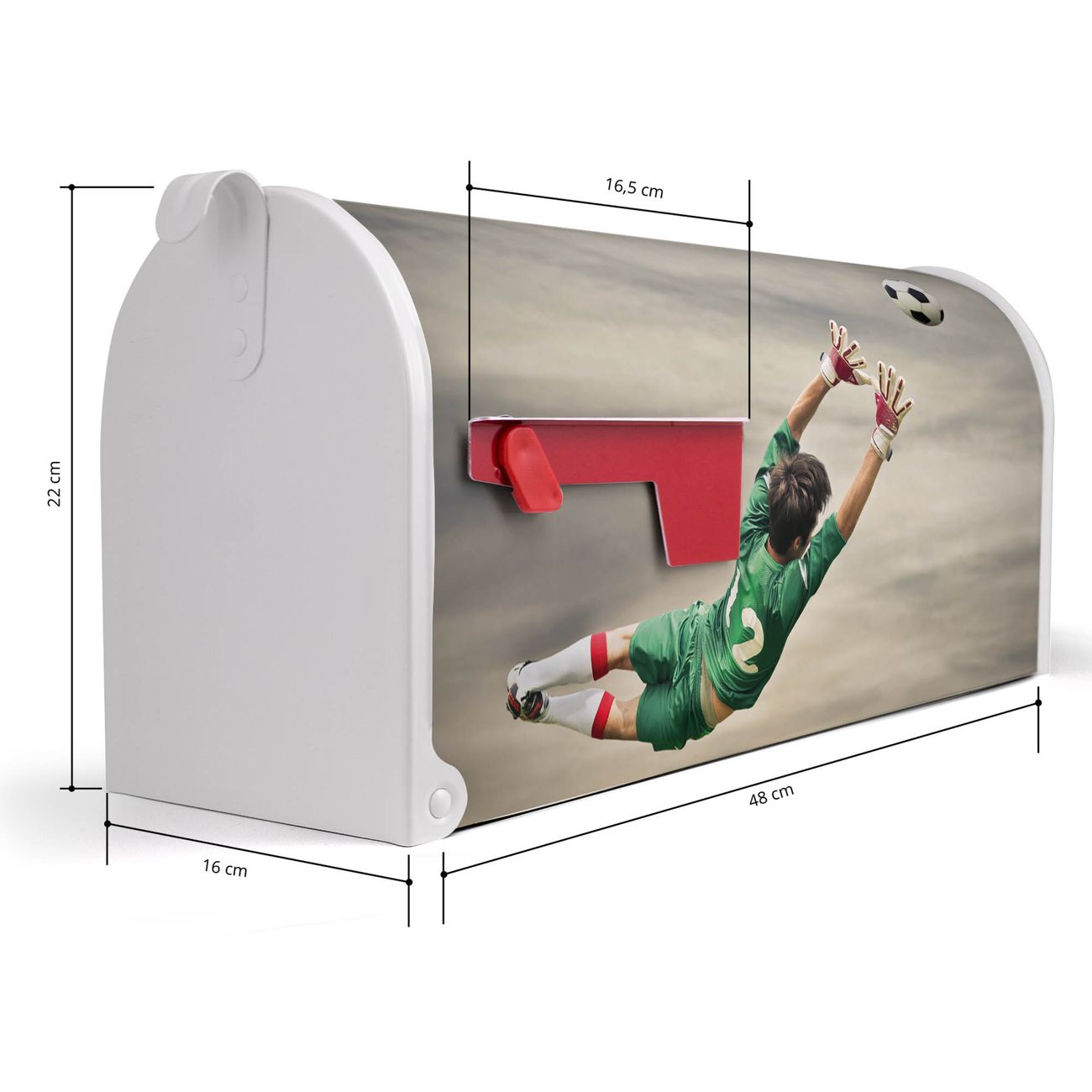 Der amerikanische Briefkasten von banjado mit Abgewehrt Motiv bietet Ihnen ausreichend Fassungsvermögen, um große A4 Sendungen und Zeitschriften zu empfangen. Die typisch amerikanische rote Fahne zeigt Ihnen an, wenn Sie Post erhalten haben. Die US-Mailbox besteht aus verzinktem Stahlblech welches lackiert wurde und ist 48 x 22 x 16 CM (BxHxT) groß. Die Folie mit Motiv Abgewehrt besteht aus einer wetter- und UV-resistenten Folie, die mit einem Schutzlaminat überzogen ist, sodass die US Mailbox zusätzlich vor Kratzern geschützt ist. An der Unterkante sind 4 Löcher je Seite um die Mailbox, typisch amerikanisch, an einem Holzpfahl oder einem Zaun zu befestigen. Auf Wunsch können Sie bei uns den passenden Standfuß oder die passende Wandhalterung kaufen um die US-Mailbox sicher zu befestigen. Wir bieten Ihnen ebenfalls Namensschilder, bereits beschriftet oder frei zu beschriften, und verschiedene selbst gestaltete Bitte-Keine-Werbung-Aufkleber.