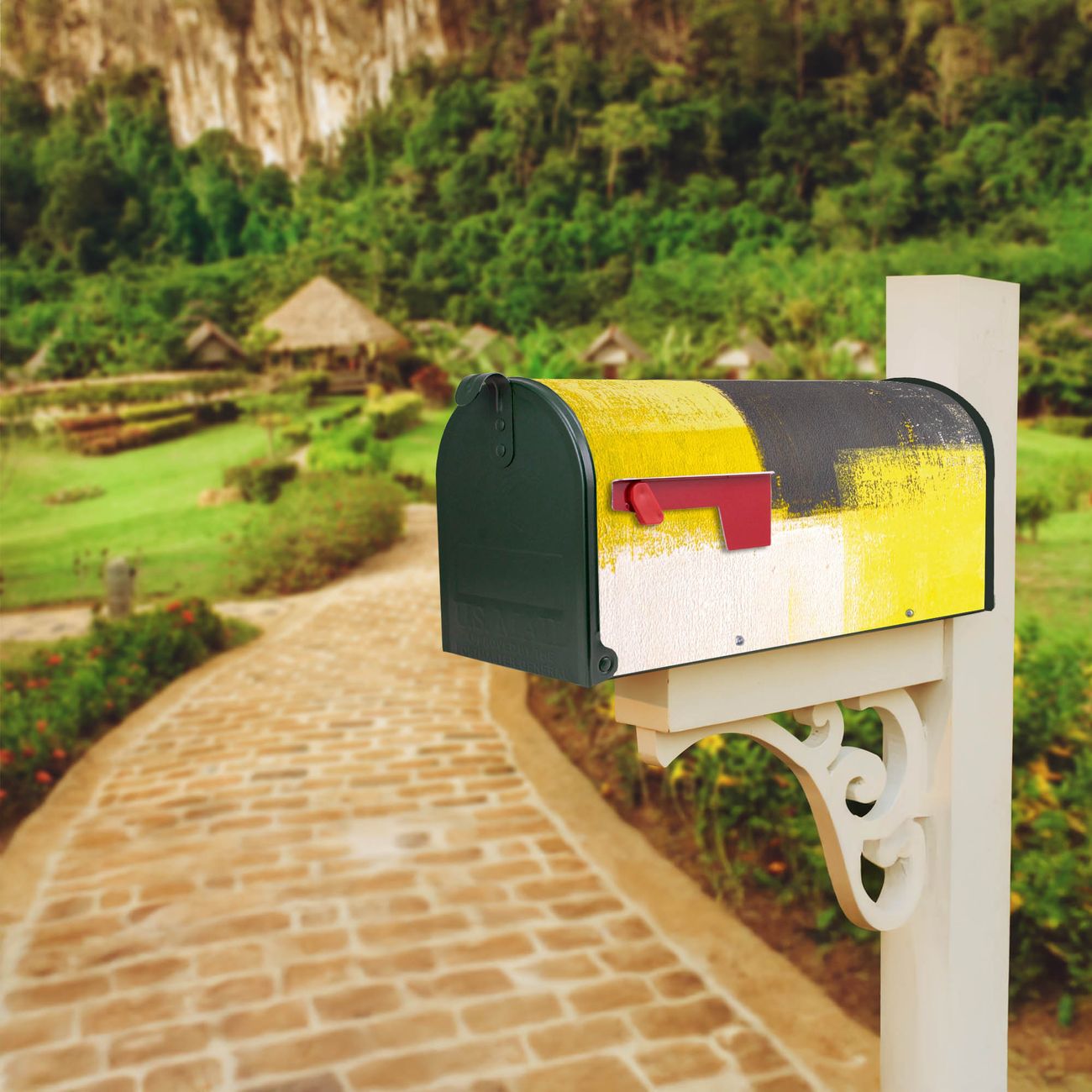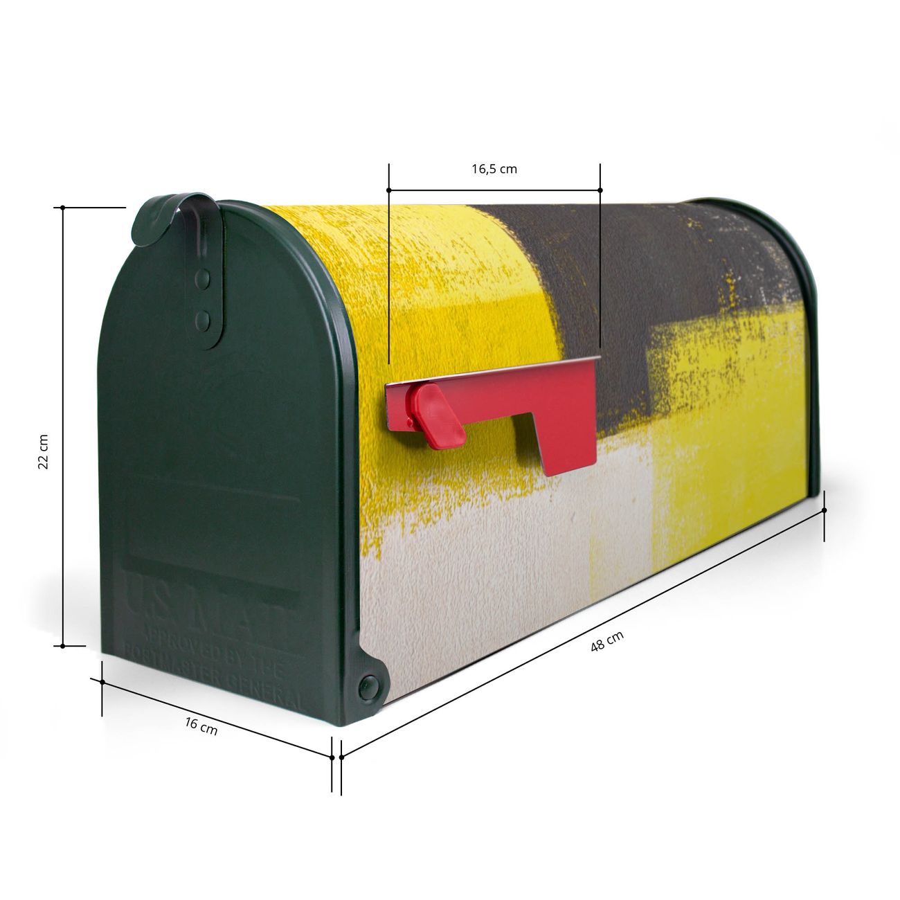 Der amerikanische Briefkasten von banjado mit Abstrakt Gelb Motiv bietet Ihnen ausreichend Fassungsvermögen, um große A4 Sendungen und Zeitschriften zu empfangen. Die typisch amerikanische rote Fahne zeigt Ihnen an, wenn Sie Post erhalten haben. Die US-Mailbox besteht aus verzinktem Stahlblech welches lackiert wurde und ist 48 x 22 x 16 CM (BxHxT) groß. Die Folie mit Motiv Abstrakt Gelb besteht aus einer wetter- und UV-resistenten Folie, die mit einem Schutzlaminat überzogen ist, sodass die US Mailbox zusätzlich vor Kratzern geschützt ist. An der Unterkante sind 4 Löcher je Seite um die Mailbox, typisch amerikanisch, an einem Holzpfahl oder einem Zaun zu befestigen. Auf Wunsch können Sie bei uns den passenden Standfuß oder die passende Wandhalterung kaufen um die US-Mailbox sicher zu befestigen. Wir bieten Ihnen ebenfalls Namensschilder, bereits beschriftet oder frei zu beschriften, und verschiedene selbst gestaltete Bitte-Keine-Werbung-Aufkleber.