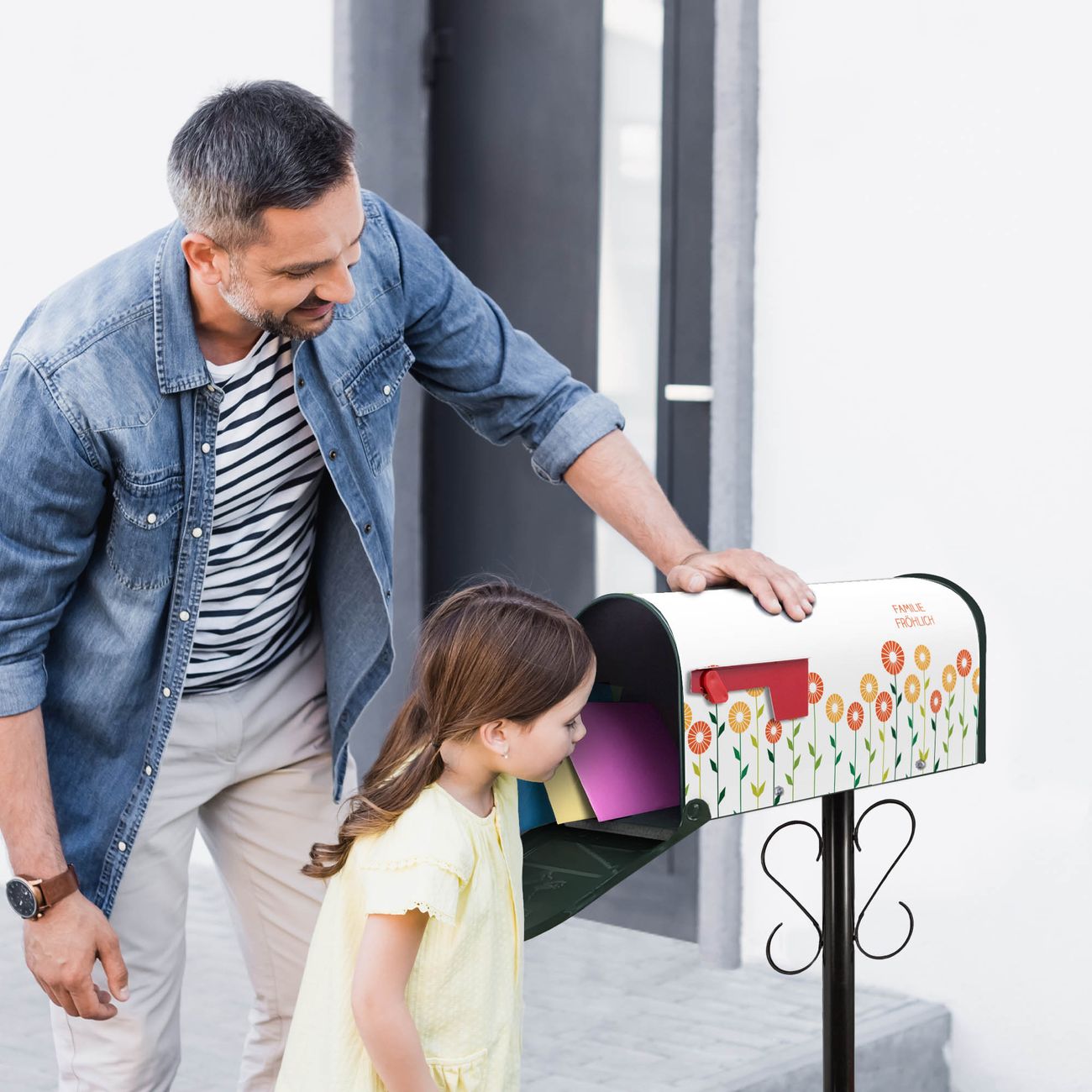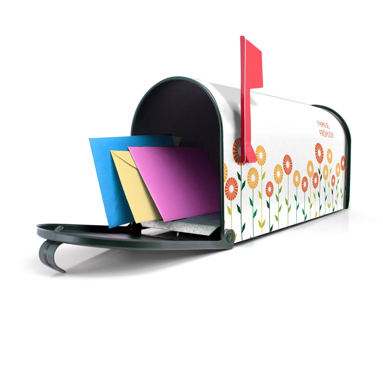 Unser amerikanischer Briefkasten mit dem Motiv WT Abstrakte Margeriten hat ein sehr ansprechendes und ausgefallenes Design, ist in der Grundfarbe weiß, grün oder schwarz erhältlich. Damit entlocken Sie Ihren Nachbarn und dem Postboten immer wieder ein Lächeln. Die Mailbox ist ein Original Import aus Mississippi USA und wird von unserer kleinen Manufaktur in Sachsen von Hand veredelt. Die US-Mailbox bietet ausreichend Platz auch für große Sendungen, eine Fahne die Ihnen Post anzeigt, wetterfestes und äußerst stabiles Material - so macht Post empfangen Freude.