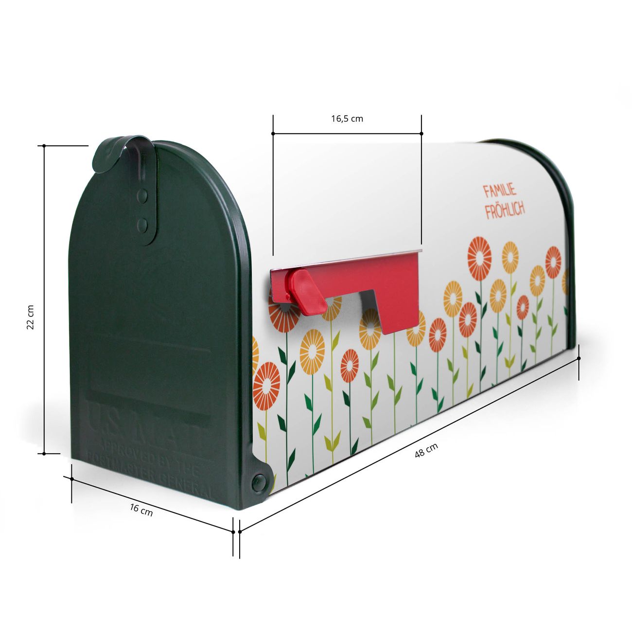 Der amerikanische Briefkasten von banjado mit WT Abstrakte Margeriten Motiv bietet Ihnen ausreichend Fassungsvermögen, um große A4 Sendungen und Zeitschriften zu empfangen. Die typisch amerikanische rote Fahne zeigt Ihnen an, wenn Sie Post erhalten haben. Die US-Mailbox besteht aus verzinktem Stahlblech welches lackiert wurde und ist 48 x 22 x 16 CM (BxHxT) groß. Die Folie mit Motiv WT Abstrakte Margeriten besteht aus einer wetter- und UV-resistenten Folie, die mit einem Schutzlaminat überzogen ist, sodass die US Mailbox zusätzlich vor Kratzern geschützt ist. An der Unterkante sind 4 Löcher je Seite um die Mailbox, typisch amerikanisch, an einem Holzpfahl oder einem Zaun zu befestigen. Auf Wunsch können Sie bei uns den passenden Standfuß oder die passende Wandhalterung kaufen um die US-Mailbox sicher zu befestigen. Wir bieten Ihnen ebenfalls Namensschilder, bereits beschriftet oder frei zu beschriften, und verschiedene selbst gestaltete Bitte-Keine-Werbung-Aufkleber.