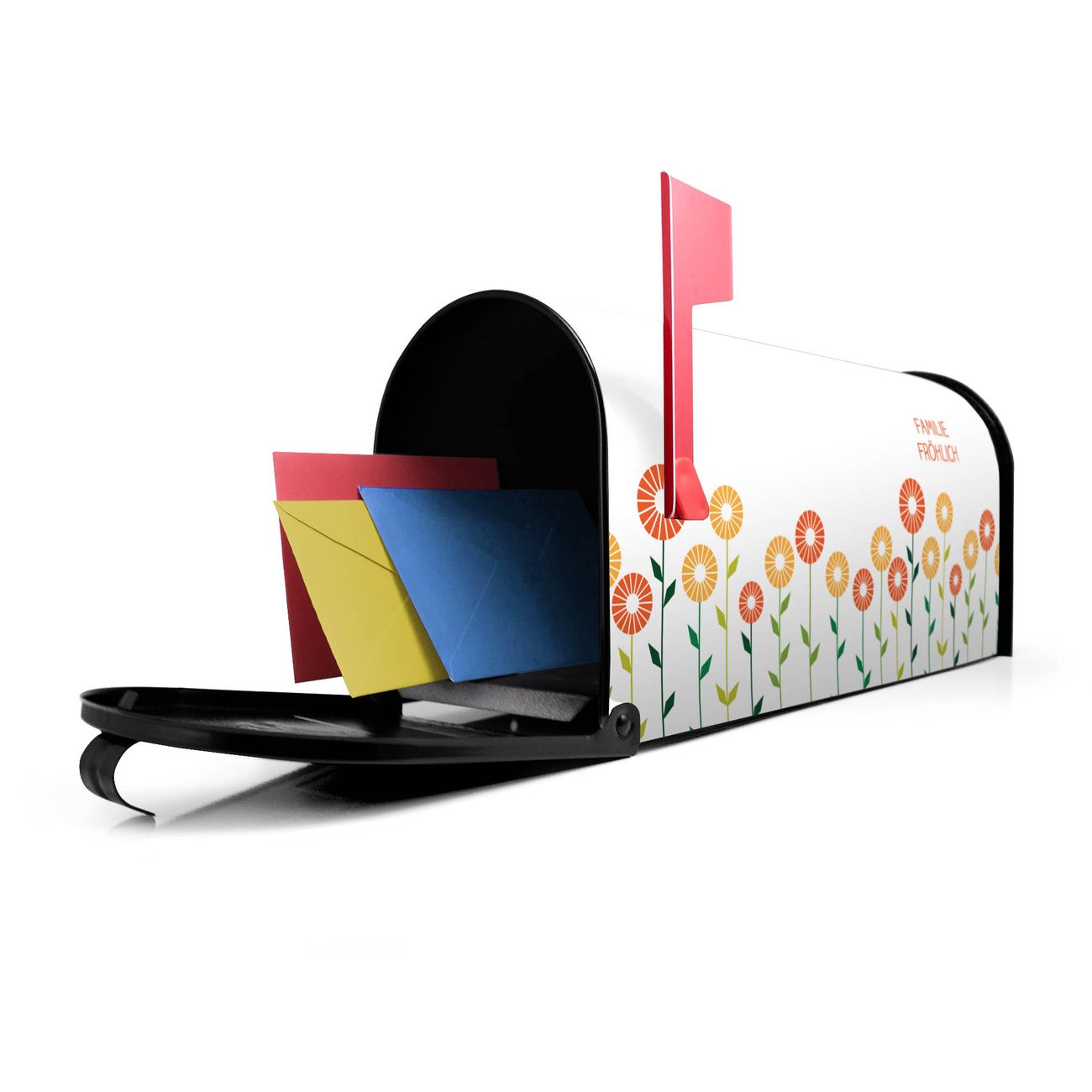 Unser amerikanischer Briefkasten mit dem Motiv Abstrakte Margeriten hat ein sehr ansprechendes und ausgefallenes Design, ist in der Grundfarbe weiß, grün oder schwarz erhältlich. Damit entlocken Sie Ihren Nachbarn und dem Postboten immer wieder ein Lächeln. Die Mailbox ist ein Original Import aus Mississippi USA und wird von unserer kleinen Manufaktur in Sachsen von Hand veredelt. Die US-Mailbox bietet ausreichend Platz auch für große Sendungen, eine Fahne die Ihnen Post anzeigt, wetterfestes und äußerst stabiles Material - so macht Post empfangen Freude.