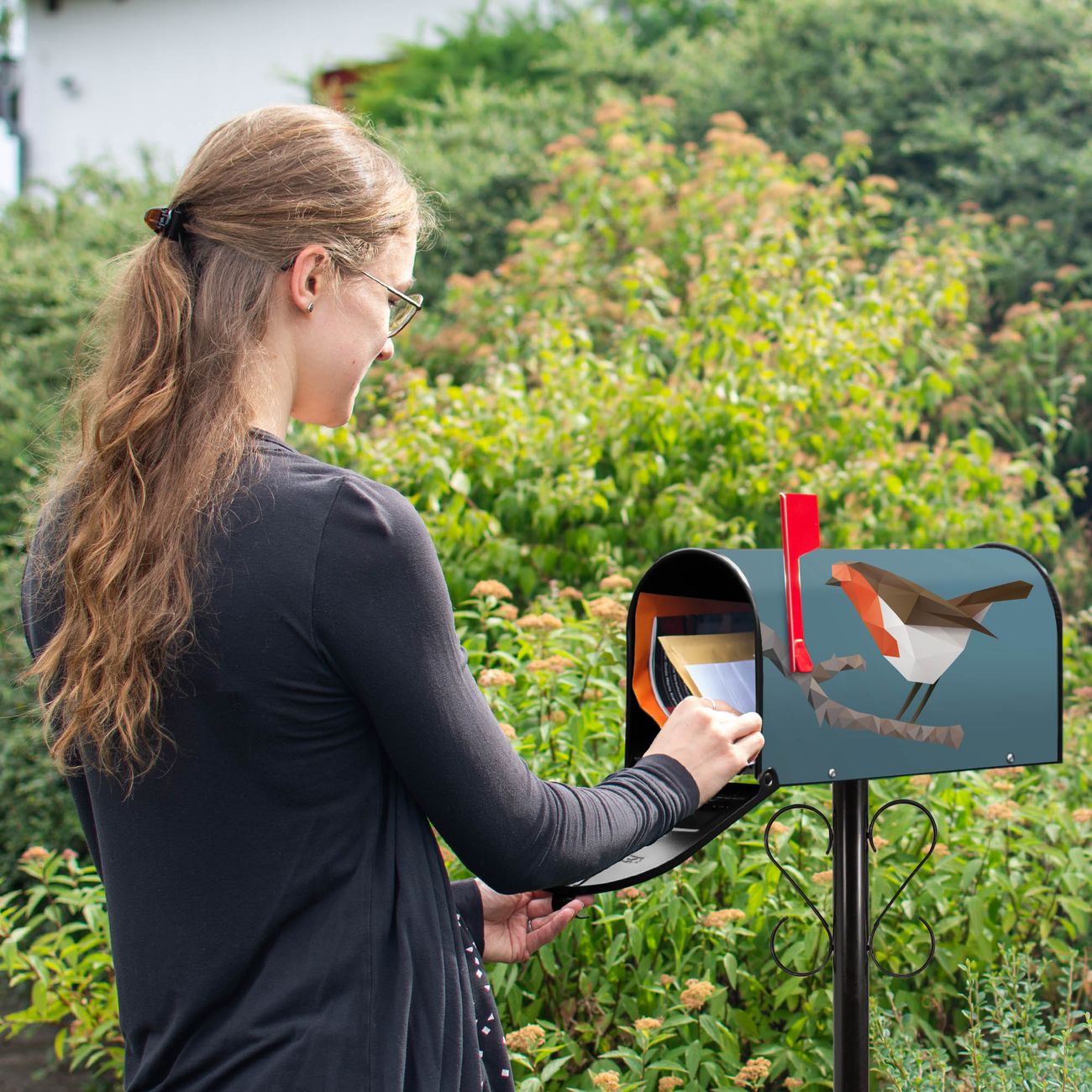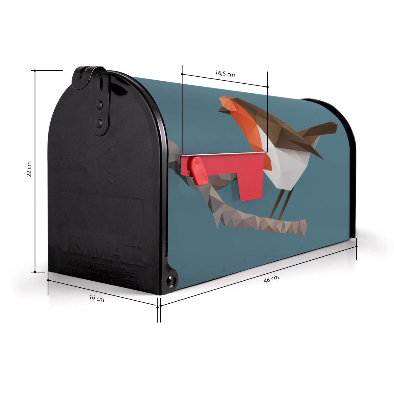 Der amerikanische Briefkasten von banjado mit abstrakter Vogel Motiv bietet Ihnen ausreichend Fassungsvermögen, um große A4 Sendungen und Zeitschriften zu empfangen. Die typisch amerikanische rote Fahne zeigt Ihnen an, wenn Sie Post erhalten haben. Die US-Mailbox besteht aus verzinktem Stahlblech welches lackiert wurde und ist 48 x 22 x 16 CM (BxHxT) groß. Die Folie mit Motiv abstrakter Vogel besteht aus einer wetter- und UV-resistenten Folie, die mit einem Schutzlaminat überzogen ist, sodass die US Mailbox zusätzlich vor Kratzern geschützt ist. An der Unterkante sind 4 Löcher je Seite um die Mailbox, typisch amerikanisch, an einem Holzpfahl oder einem Zaun zu befestigen. Auf Wunsch können Sie bei uns den passenden Standfuß oder die passende Wandhalterung kaufen um die US-Mailbox sicher zu befestigen. Wir bieten Ihnen ebenfalls Namensschilder, bereits beschriftet oder frei zu beschriften, und verschiedene selbst gestaltete Bitte-Keine-Werbung-Aufkleber.