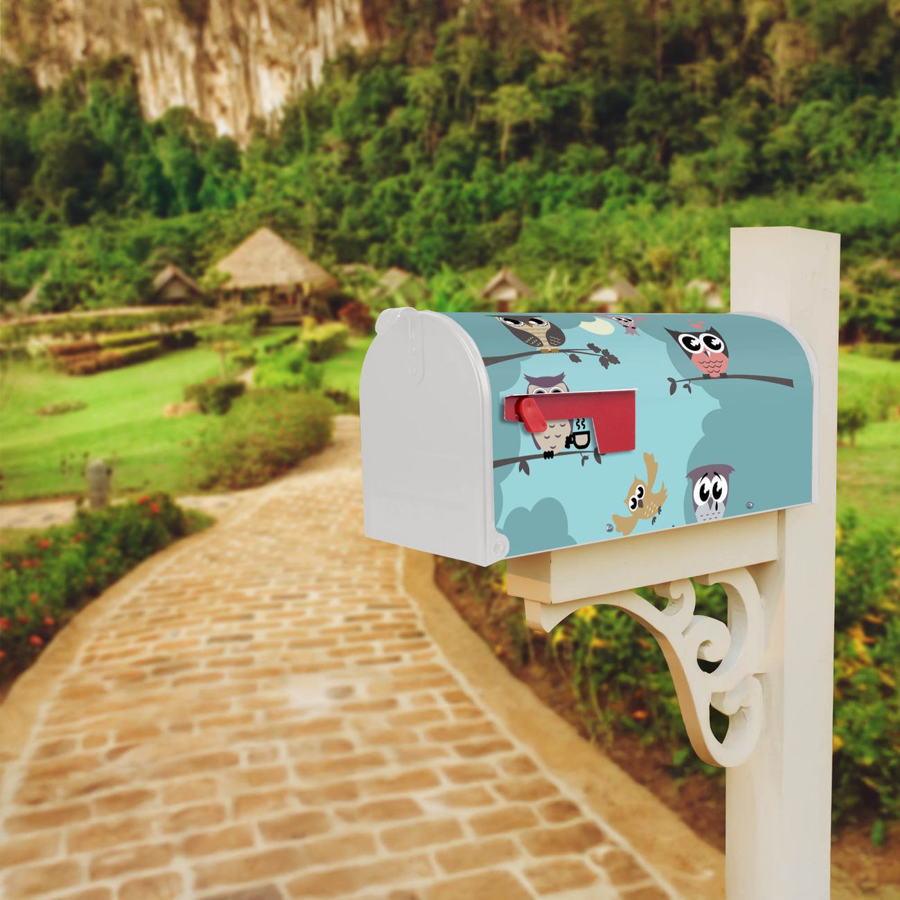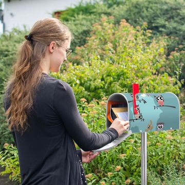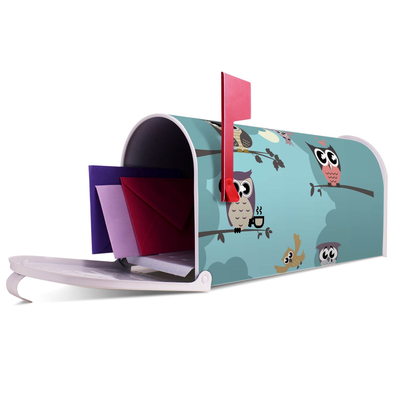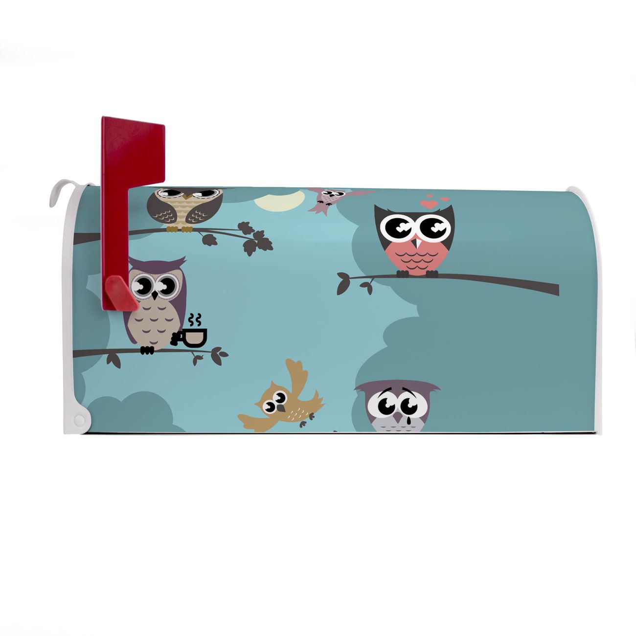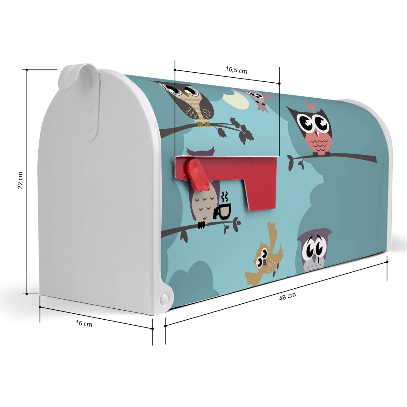 Der amerikanische Briefkasten von banjado mit Acht Eulen Motiv bietet Ihnen ausreichend Fassungsvermögen, um große A4 Sendungen und Zeitschriften zu empfangen. Die typisch amerikanische rote Fahne zeigt Ihnen an, wenn Sie Post erhalten haben. Die US-Mailbox besteht aus verzinktem Stahlblech welches lackiert wurde und ist 48 x 22 x 16 CM (BxHxT) groß. Die Folie mit Motiv Acht Eulen besteht aus einer wetter- und UV-resistenten Folie, die mit einem Schutzlaminat überzogen ist, sodass die US Mailbox zusätzlich vor Kratzern geschützt ist. An der Unterkante sind 4 Löcher je Seite um die Mailbox, typisch amerikanisch, an einem Holzpfahl oder einem Zaun zu befestigen. Auf Wunsch können Sie bei uns den passenden Standfuß oder die passende Wandhalterung kaufen um die US-Mailbox sicher zu befestigen. Wir bieten Ihnen ebenfalls Namensschilder, bereits beschriftet oder frei zu beschriften, und verschiedene selbst gestaltete Bitte-Keine-Werbung-Aufkleber.