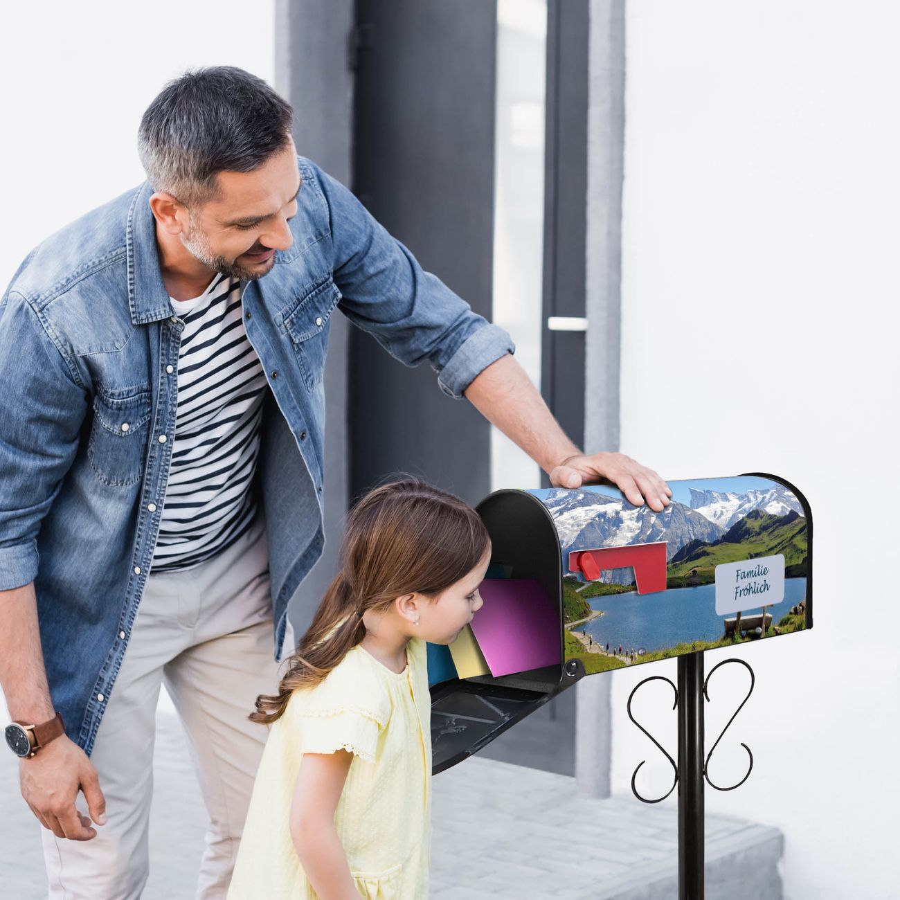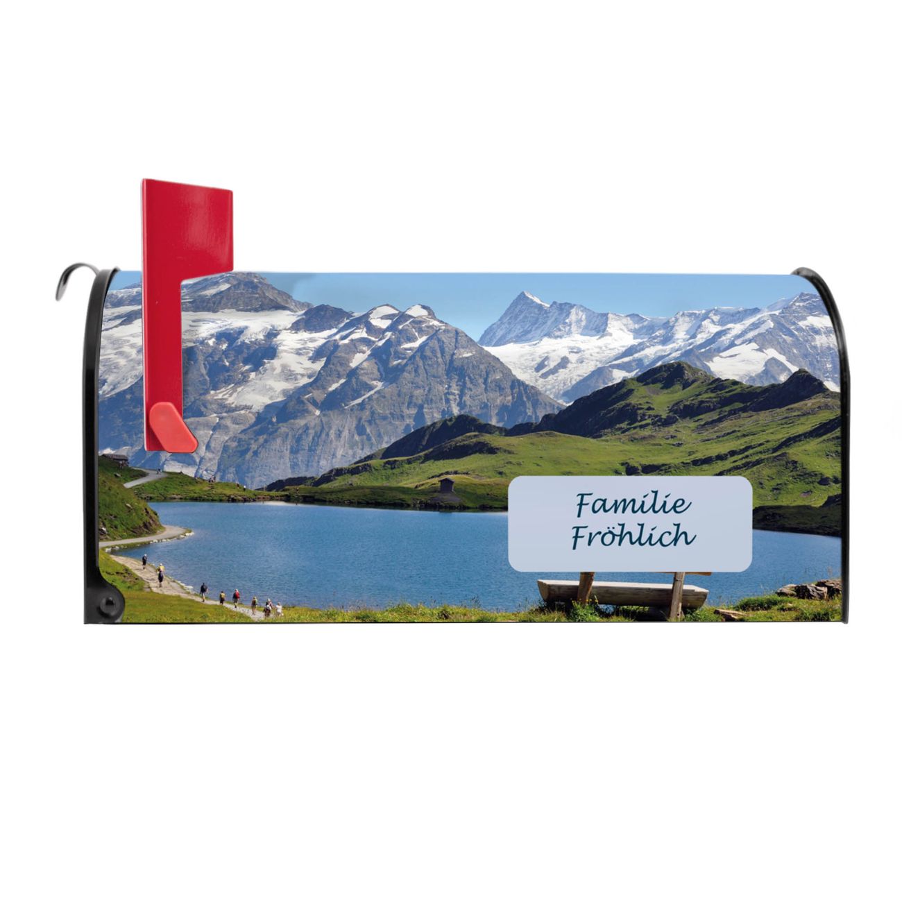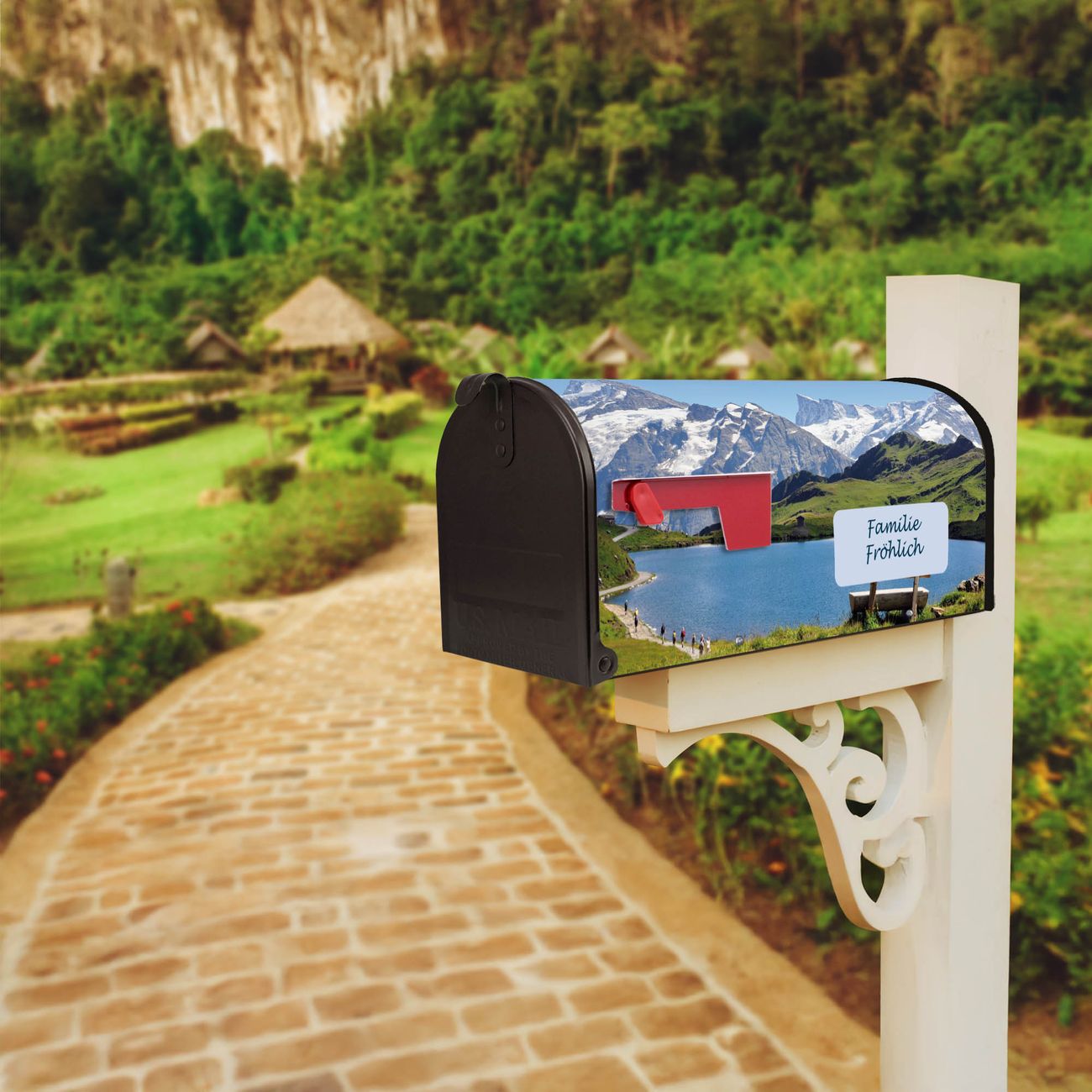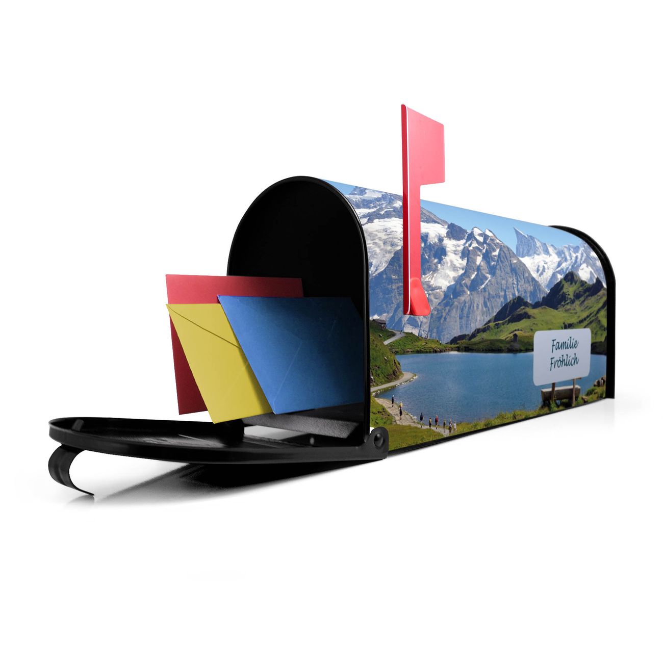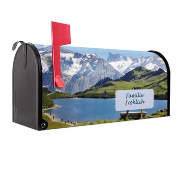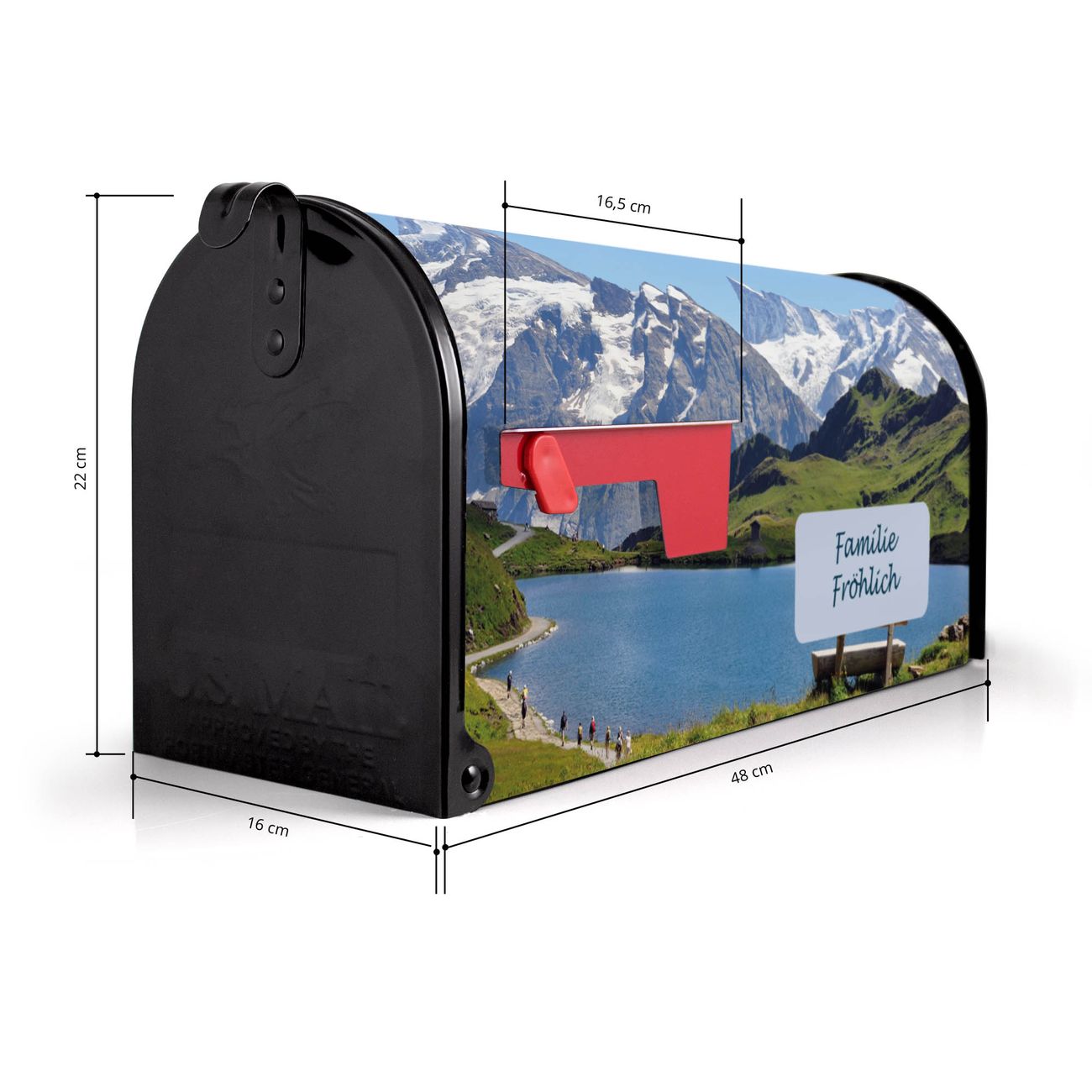 Der amerikanische Briefkasten von banjado mit Alpen Motiv bietet Ihnen ausreichend Fassungsvermögen, um große A4 Sendungen und Zeitschriften zu empfangen. Die typisch amerikanische rote Fahne zeigt Ihnen an, wenn Sie Post erhalten haben. Die US-Mailbox besteht aus verzinktem Stahlblech welches lackiert wurde und ist 48 x 22 x 16 CM (BxHxT) groß. Die Folie mit Motiv Alpen besteht aus einer wetter- und UV-resistenten Folie, die mit einem Schutzlaminat überzogen ist, sodass die US Mailbox zusätzlich vor Kratzern geschützt ist. An der Unterkante sind 4 Löcher je Seite um die Mailbox, typisch amerikanisch, an einem Holzpfahl oder einem Zaun zu befestigen. Auf Wunsch können Sie bei uns den passenden Standfuß oder die passende Wandhalterung kaufen um die US-Mailbox sicher zu befestigen. Wir bieten Ihnen ebenfalls Namensschilder, bereits beschriftet oder frei zu beschriften, und verschiedene selbst gestaltete Bitte-Keine-Werbung-Aufkleber.