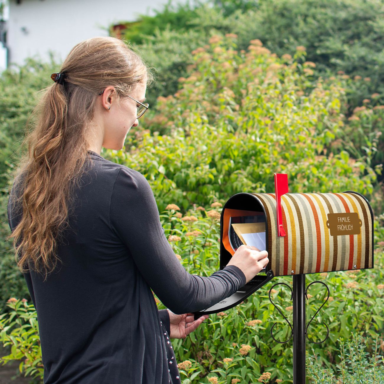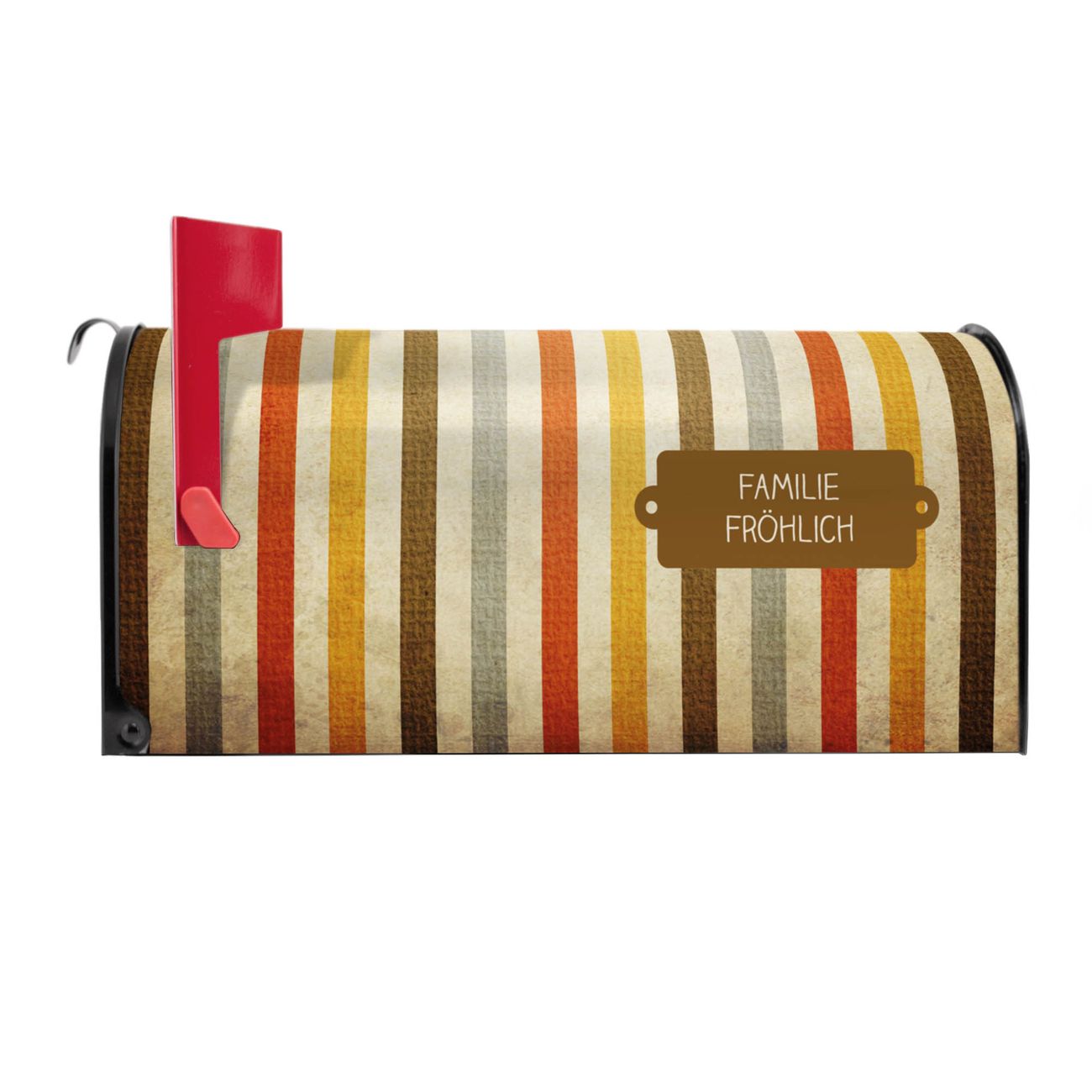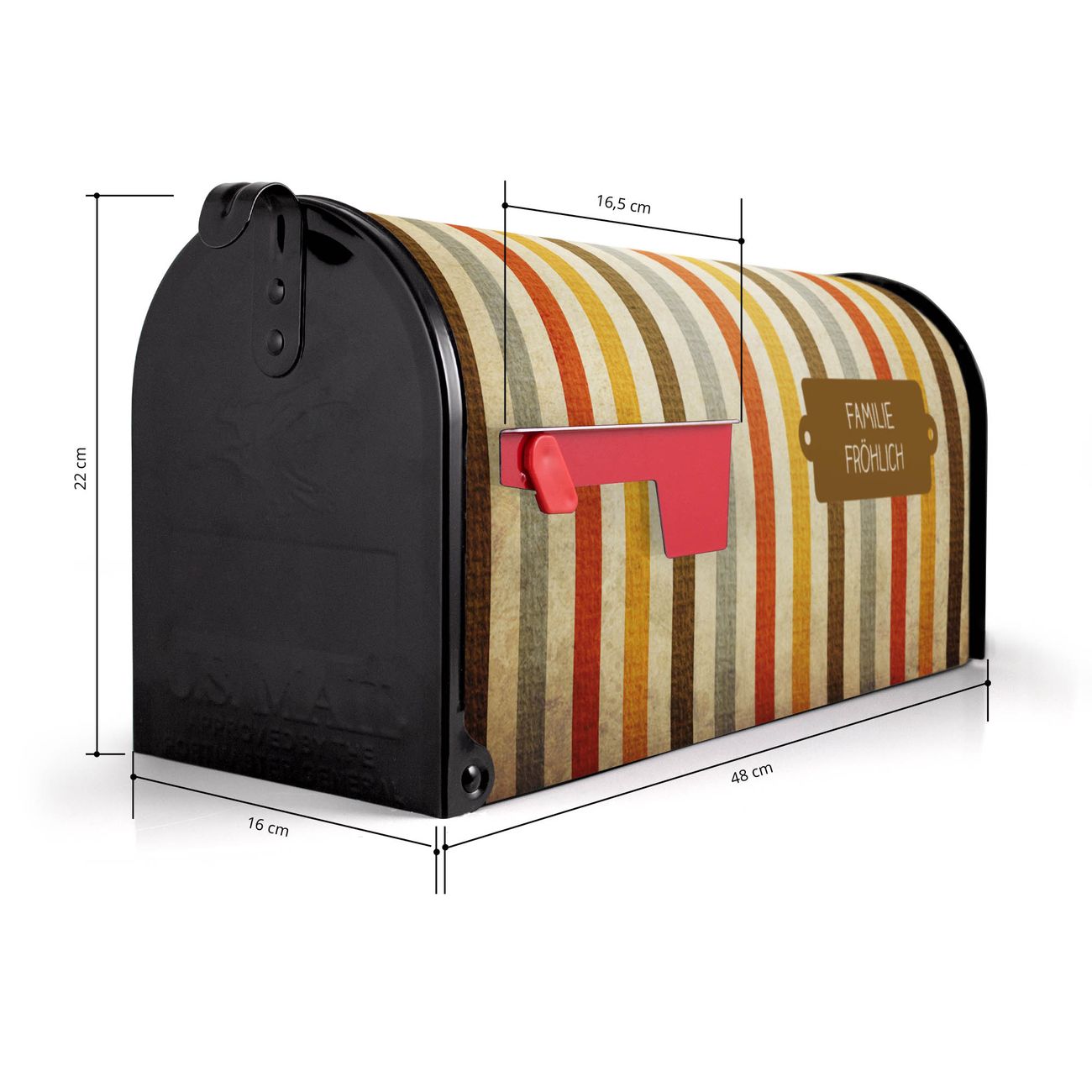 Der amerikanische Briefkasten von banjado mit Alte Streifen Motiv bietet Ihnen ausreichend Fassungsvermögen, um große A4 Sendungen und Zeitschriften zu empfangen. Die typisch amerikanische rote Fahne zeigt Ihnen an, wenn Sie Post erhalten haben. Die US-Mailbox besteht aus verzinktem Stahlblech welches lackiert wurde und ist 48 x 22 x 16 CM (BxHxT) groß. Die Folie mit Motiv Alte Streifen besteht aus einer wetter- und UV-resistenten Folie, die mit einem Schutzlaminat überzogen ist, sodass die US Mailbox zusätzlich vor Kratzern geschützt ist. An der Unterkante sind 4 Löcher je Seite um die Mailbox, typisch amerikanisch, an einem Holzpfahl oder einem Zaun zu befestigen. Auf Wunsch können Sie bei uns den passenden Standfuß oder die passende Wandhalterung kaufen um die US-Mailbox sicher zu befestigen. Wir bieten Ihnen ebenfalls Namensschilder, bereits beschriftet oder frei zu beschriften, und verschiedene selbst gestaltete Bitte-Keine-Werbung-Aufkleber.