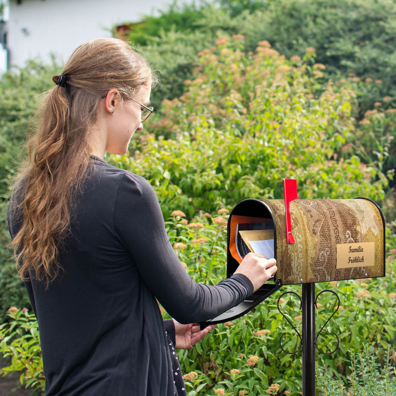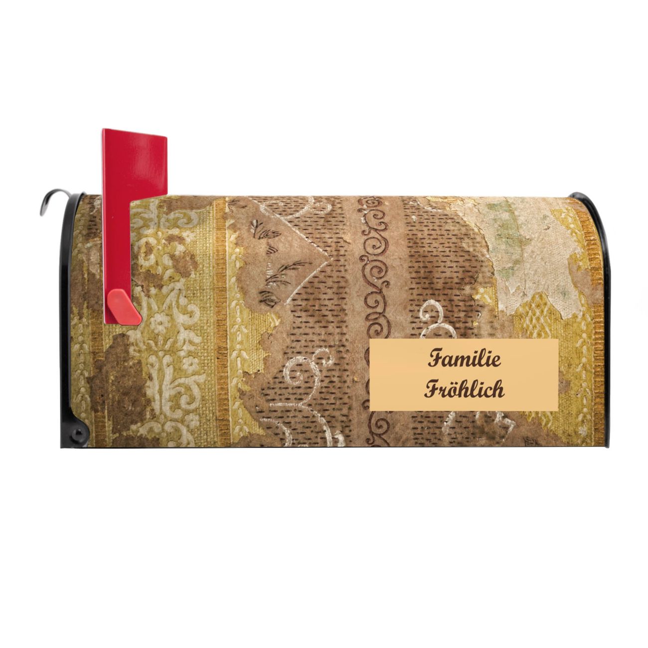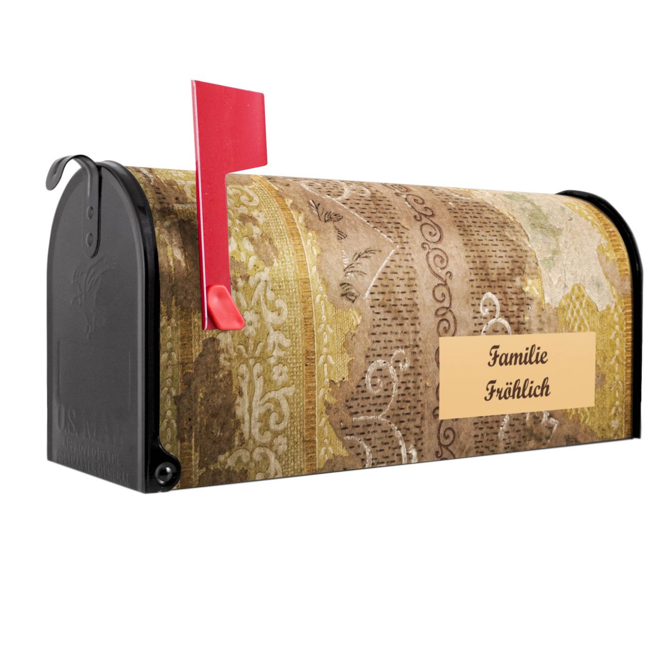 Der amerikanische Briefkasten von banjado mit Alte Tapeten Motiv bietet Ihnen ausreichend Fassungsvermögen, um große A4 Sendungen und Zeitschriften zu empfangen. Die typisch amerikanische rote Fahne zeigt Ihnen an, wenn Sie Post erhalten haben. Die US-Mailbox besteht aus verzinktem Stahlblech welches lackiert wurde und ist 48 x 22 x 16 CM (BxHxT) groß. Die Folie mit Motiv Alte Tapeten besteht aus einer wetter- und UV-resistenten Folie, die mit einem Schutzlaminat überzogen ist, sodass die US Mailbox zusätzlich vor Kratzern geschützt ist. An der Unterkante sind 4 Löcher je Seite um die Mailbox, typisch amerikanisch, an einem Holzpfahl oder einem Zaun zu befestigen. Auf Wunsch können Sie bei uns den passenden Standfuß oder die passende Wandhalterung kaufen um die US-Mailbox sicher zu befestigen. Wir bieten Ihnen ebenfalls Namensschilder, bereits beschriftet oder frei zu beschriften, und verschiedene selbst gestaltete Bitte-Keine-Werbung-Aufkleber.