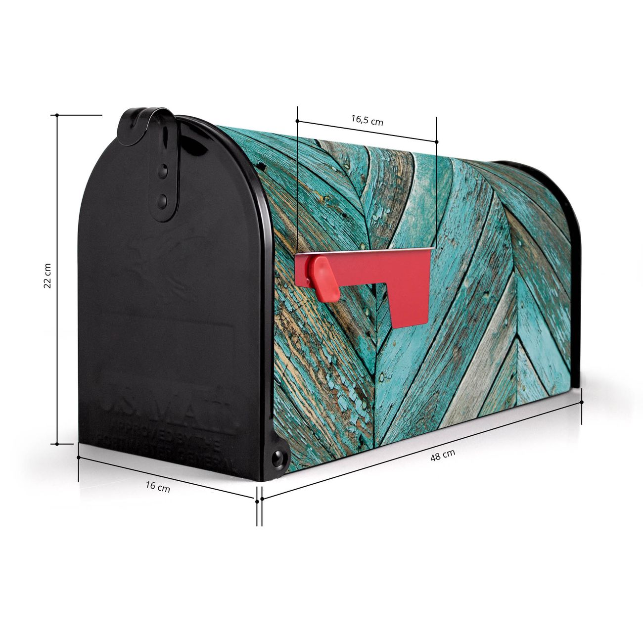 Der amerikanische Briefkasten von banjado mit Altes Holz Blau Motiv bietet Ihnen ausreichend Fassungsvermögen, um große A4 Sendungen und Zeitschriften zu empfangen. Die typisch amerikanische rote Fahne zeigt Ihnen an, wenn Sie Post erhalten haben. Die US-Mailbox besteht aus verzinktem Stahlblech welches lackiert wurde und ist 48 x 22 x 16 CM (BxHxT) groß. Die Folie mit Motiv Altes Holz Blau besteht aus einer wetter- und UV-resistenten Folie, die mit einem Schutzlaminat überzogen ist, sodass die US Mailbox zusätzlich vor Kratzern geschützt ist. An der Unterkante sind 4 Löcher je Seite um die Mailbox, typisch amerikanisch, an einem Holzpfahl oder einem Zaun zu befestigen. Auf Wunsch können Sie bei uns den passenden Standfuß oder die passende Wandhalterung kaufen um die US-Mailbox sicher zu befestigen. Wir bieten Ihnen ebenfalls Namensschilder, bereits beschriftet oder frei zu beschriften, und verschiedene selbst gestaltete Bitte-Keine-Werbung-Aufkleber.