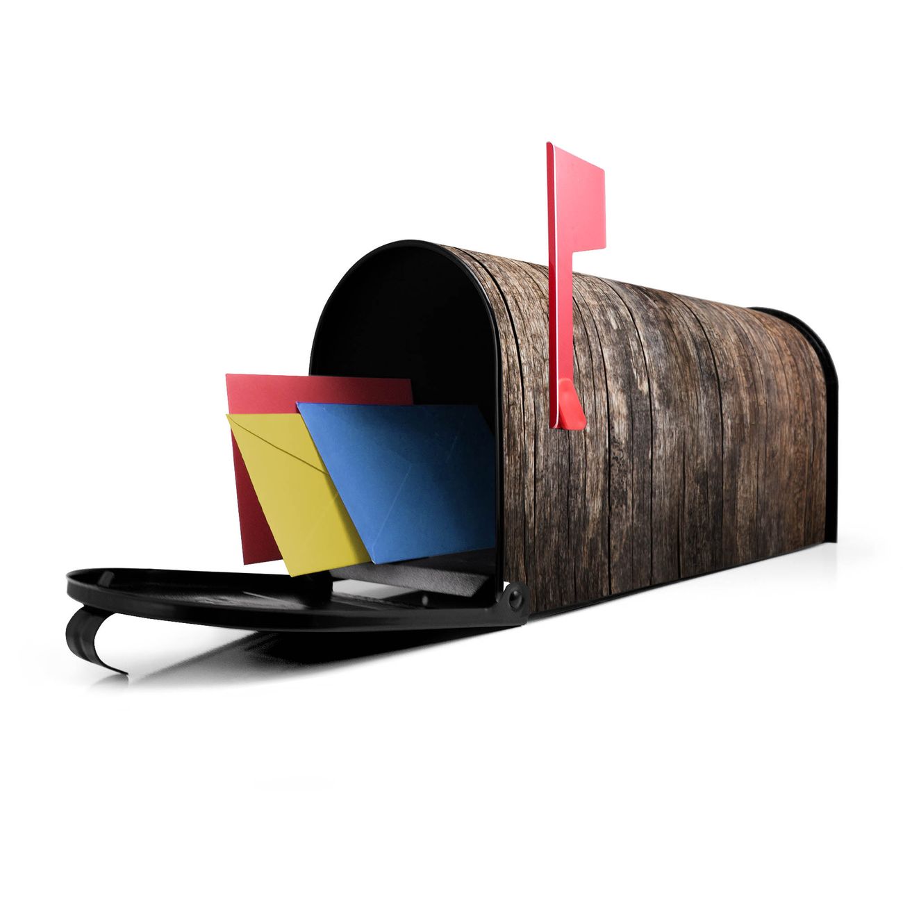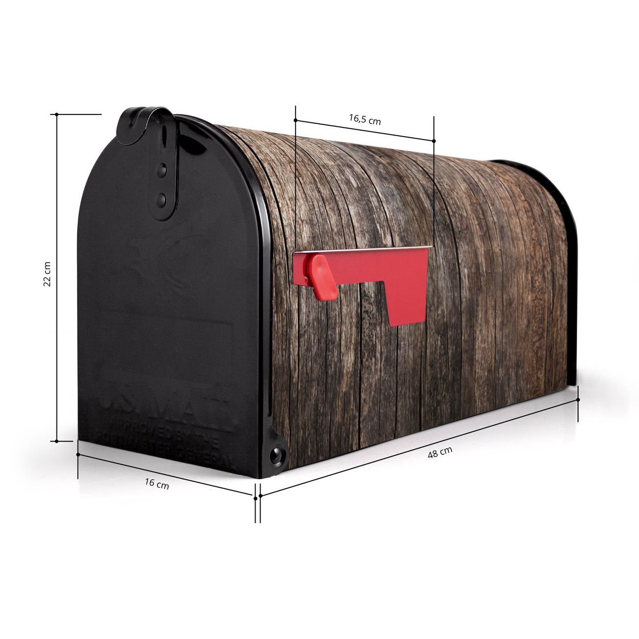 Der amerikanische Briefkasten von banjado mit Altes Holz Motiv bietet Ihnen ausreichend Fassungsvermögen, um große A4 Sendungen und Zeitschriften zu empfangen. Die typisch amerikanische rote Fahne zeigt Ihnen an, wenn Sie Post erhalten haben. Die US-Mailbox besteht aus verzinktem Stahlblech welches lackiert wurde und ist 48 x 22 x 16 CM (BxHxT) groß. Die Folie mit Motiv Altes Holz besteht aus einer wetter- und UV-resistenten Folie, die mit einem Schutzlaminat überzogen ist, sodass die US Mailbox zusätzlich vor Kratzern geschützt ist. An der Unterkante sind 4 Löcher je Seite um die Mailbox, typisch amerikanisch, an einem Holzpfahl oder einem Zaun zu befestigen. Auf Wunsch können Sie bei uns den passenden Standfuß oder die passende Wandhalterung kaufen um die US-Mailbox sicher zu befestigen. Wir bieten Ihnen ebenfalls Namensschilder, bereits beschriftet oder frei zu beschriften, und verschiedene selbst gestaltete Bitte-Keine-Werbung-Aufkleber.
