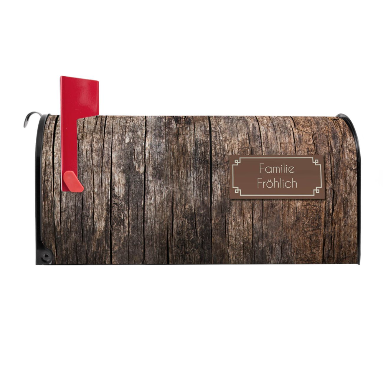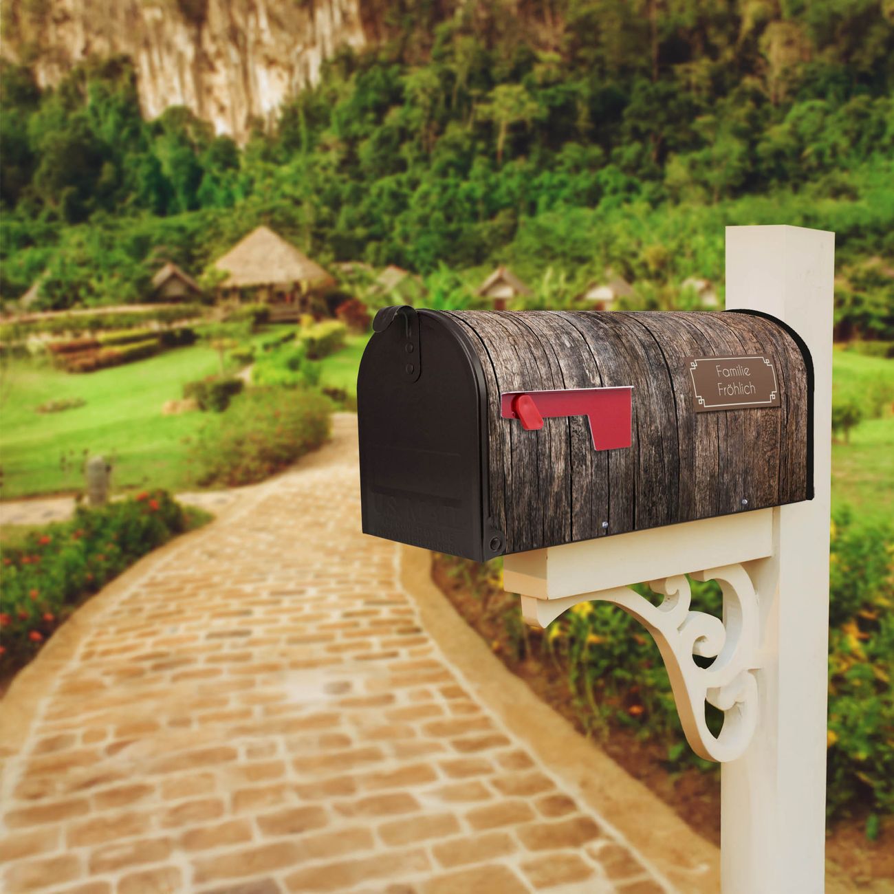 Der amerikanische Briefkasten von banjado mit Altes Holz Motiv bietet Ihnen ausreichend Fassungsvermögen, um große A4 Sendungen und Zeitschriften zu empfangen. Die typisch amerikanische rote Fahne zeigt Ihnen an, wenn Sie Post erhalten haben. Die US-Mailbox besteht aus verzinktem Stahlblech welches lackiert wurde und ist 48 x 22 x 16 CM (BxHxT) groß. Die Folie mit Motiv Altes Holz besteht aus einer wetter- und UV-resistenten Folie, die mit einem Schutzlaminat überzogen ist, sodass die US Mailbox zusätzlich vor Kratzern geschützt ist. An der Unterkante sind 4 Löcher je Seite um die Mailbox, typisch amerikanisch, an einem Holzpfahl oder einem Zaun zu befestigen. Auf Wunsch können Sie bei uns den passenden Standfuß oder die passende Wandhalterung kaufen um die US-Mailbox sicher zu befestigen. Wir bieten Ihnen ebenfalls Namensschilder, bereits beschriftet oder frei zu beschriften, und verschiedene selbst gestaltete Bitte-Keine-Werbung-Aufkleber.