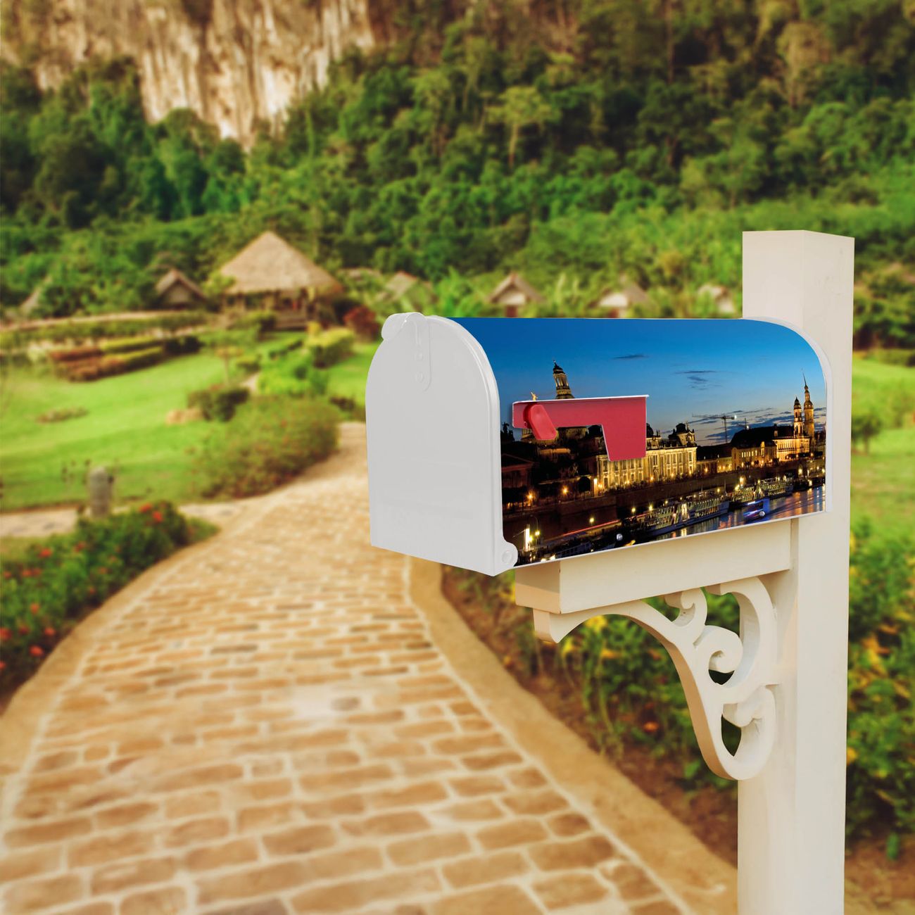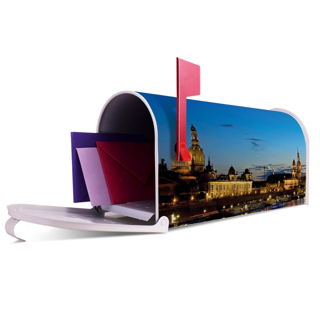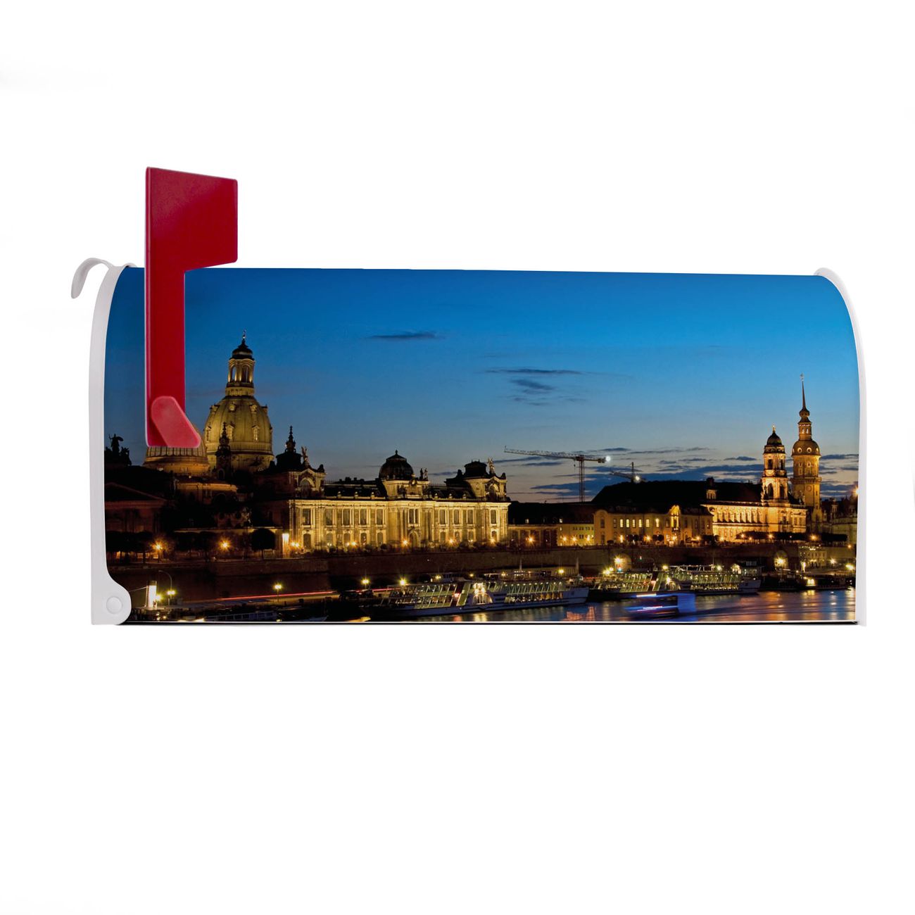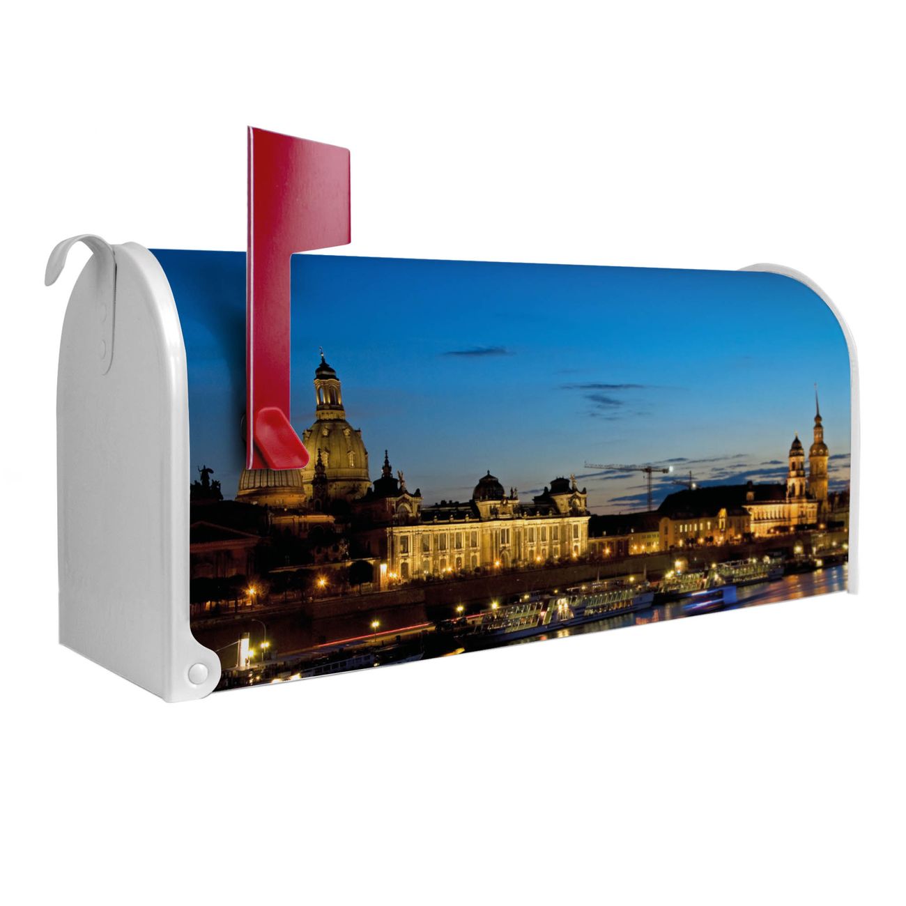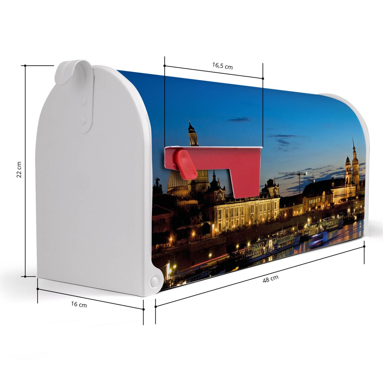 Der amerikanische Briefkasten von banjado mit Altstadt Dresden Motiv bietet Ihnen ausreichend Fassungsvermögen, um große A4 Sendungen und Zeitschriften zu empfangen. Die typisch amerikanische rote Fahne zeigt Ihnen an, wenn Sie Post erhalten haben. Die US-Mailbox besteht aus verzinktem Stahlblech welches lackiert wurde und ist 48 x 22 x 16 CM (BxHxT) groß. Die Folie mit Motiv Altstadt Dresden besteht aus einer wetter- und UV-resistenten Folie, die mit einem Schutzlaminat überzogen ist, sodass die US Mailbox zusätzlich vor Kratzern geschützt ist. An der Unterkante sind 4 Löcher je Seite um die Mailbox, typisch amerikanisch, an einem Holzpfahl oder einem Zaun zu befestigen. Auf Wunsch können Sie bei uns den passenden Standfuß oder die passende Wandhalterung kaufen um die US-Mailbox sicher zu befestigen. Wir bieten Ihnen ebenfalls Namensschilder, bereits beschriftet oder frei zu beschriften, und verschiedene selbst gestaltete Bitte-Keine-Werbung-Aufkleber.