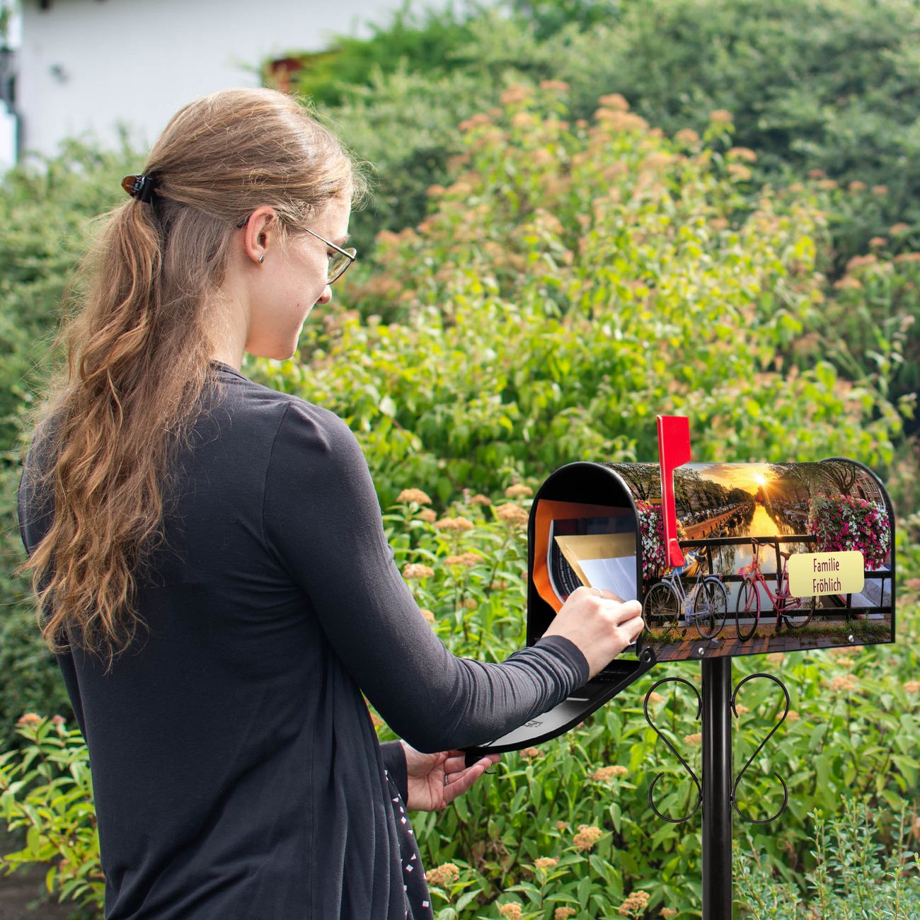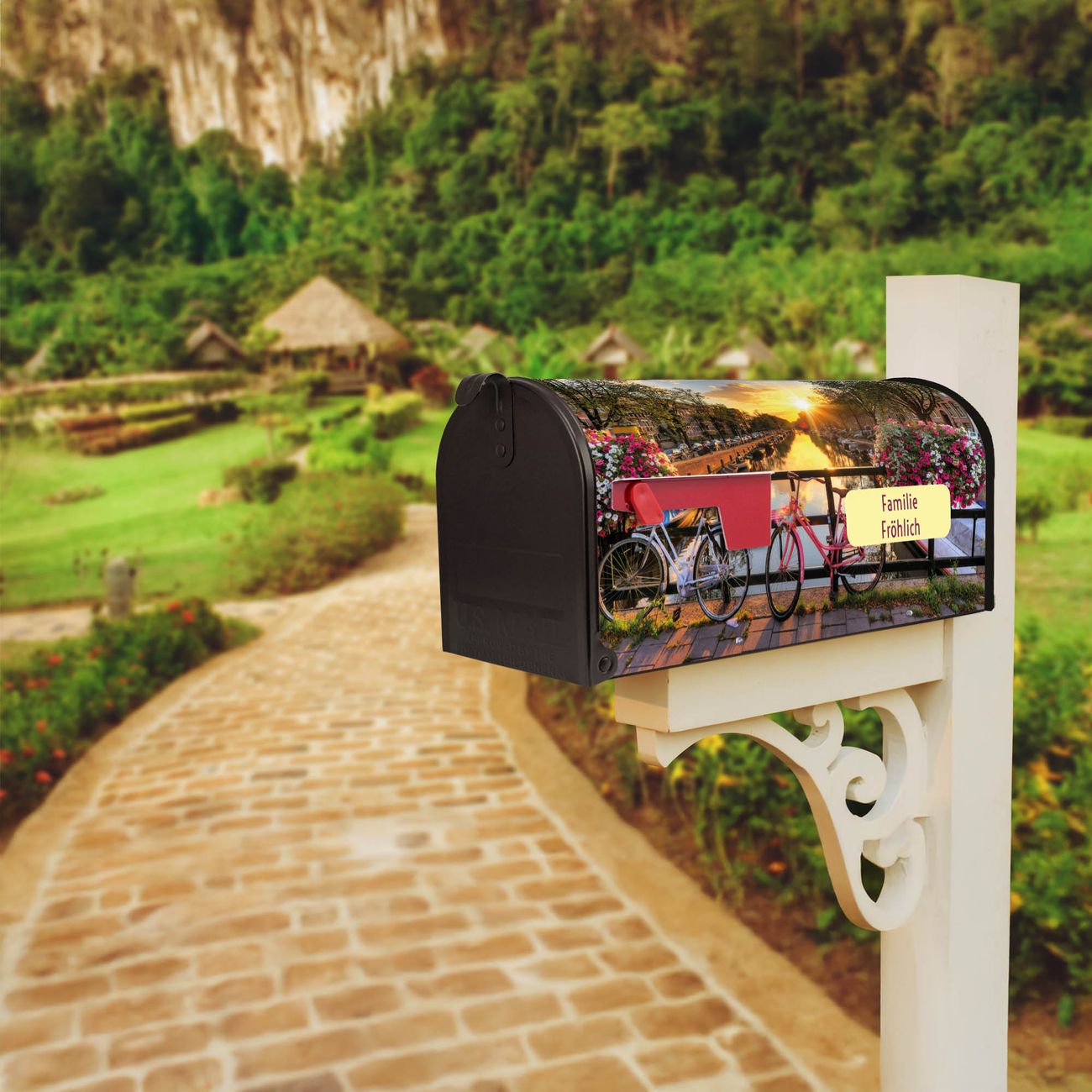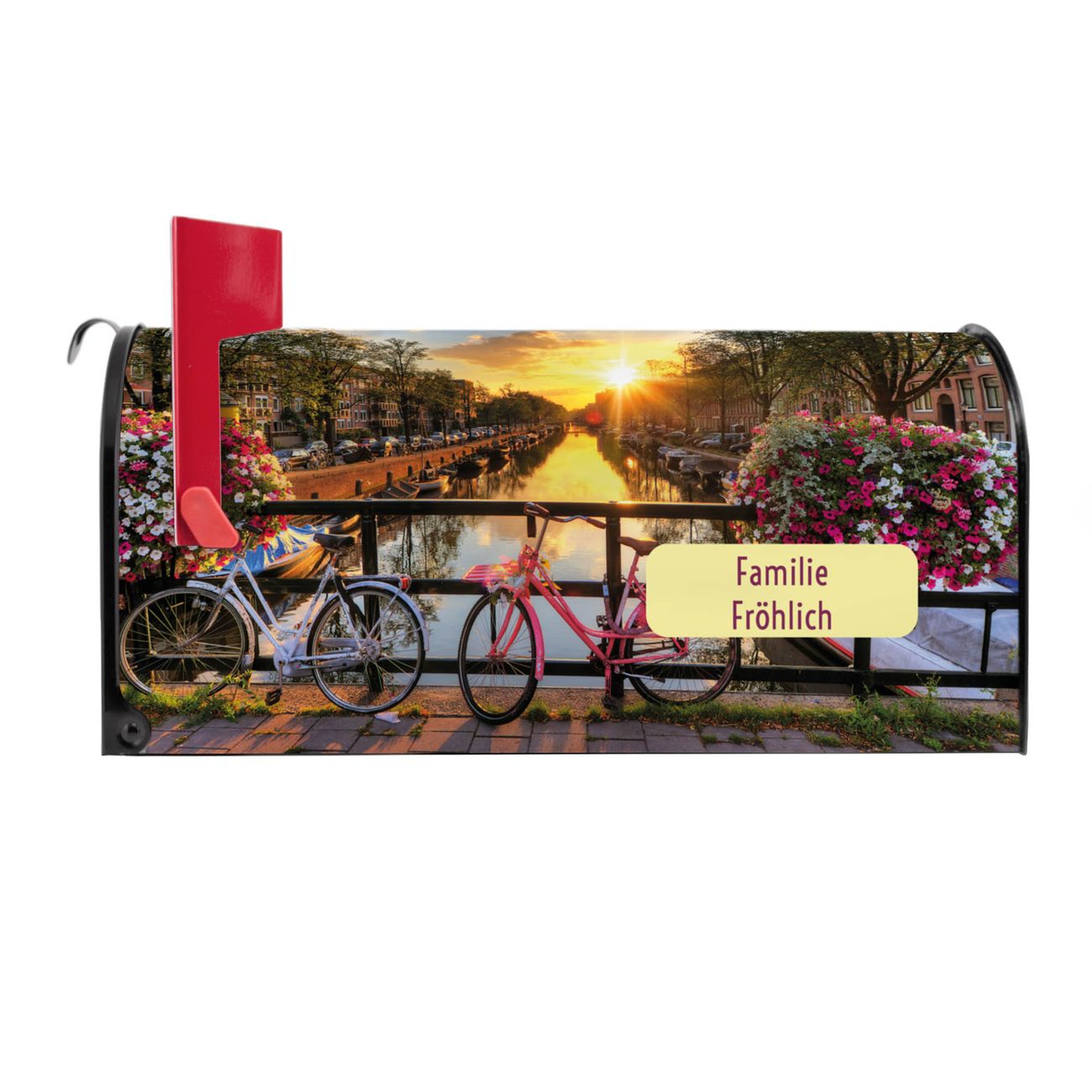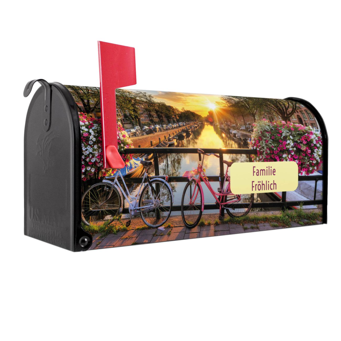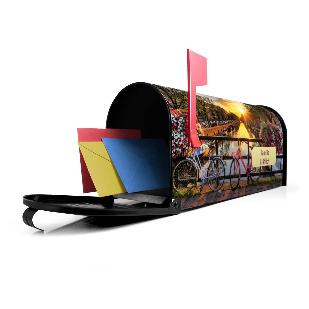 Unser amerikanischer Briefkasten mit dem Motiv Amsterdam Mit Rad hat ein sehr ansprechendes und ausgefallenes Design, ist in der Grundfarbe weiß, grün oder schwarz erhältlich. Damit entlocken Sie Ihren Nachbarn und dem Postboten immer wieder ein Lächeln. Die Mailbox ist ein Original Import aus Mississippi USA und wird von unserer kleinen Manufaktur in Sachsen von Hand veredelt. Die US-Mailbox bietet ausreichend Platz auch für große Sendungen, eine Fahne die Ihnen Post anzeigt, wetterfestes und äußerst stabiles Material - so macht Post empfangen Freude.