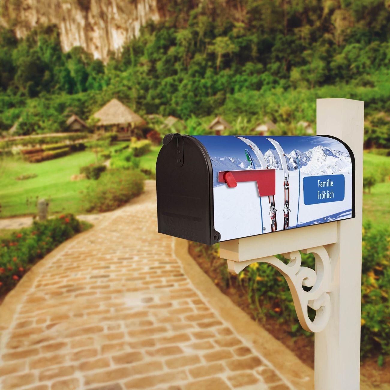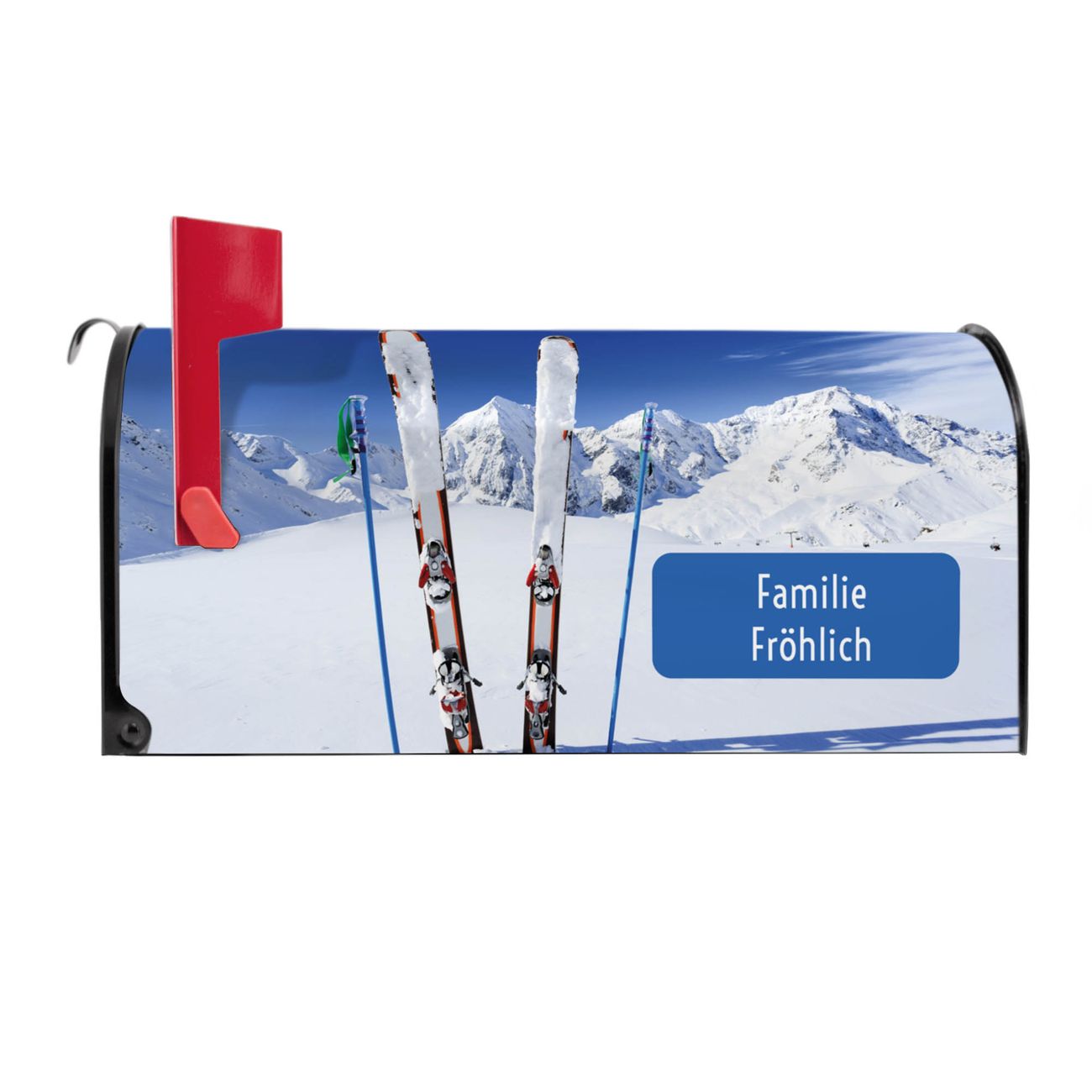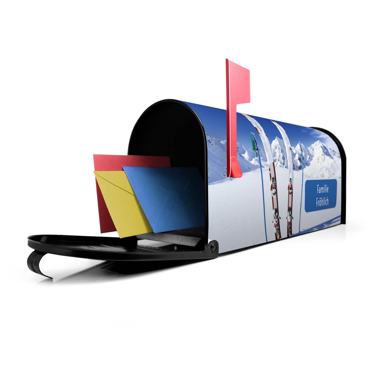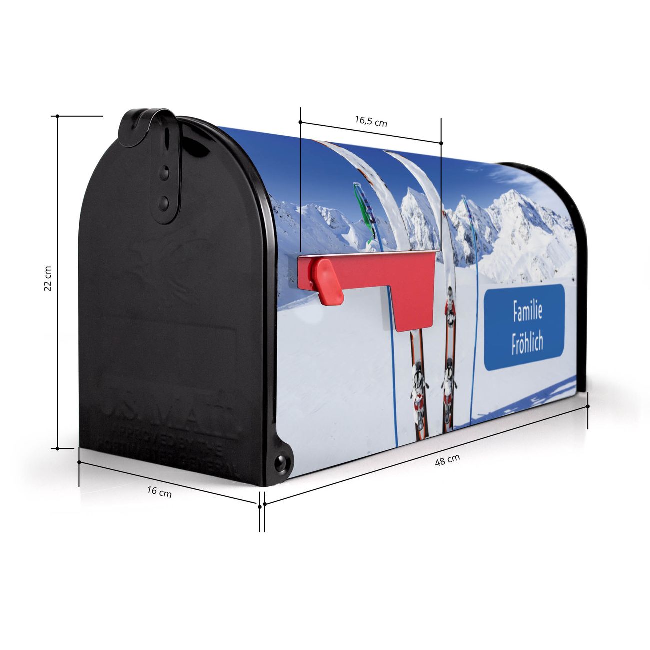 Der amerikanische Briefkasten von banjado mit Apres Ski Motiv bietet Ihnen ausreichend Fassungsvermögen, um große A4 Sendungen und Zeitschriften zu empfangen. Die typisch amerikanische rote Fahne zeigt Ihnen an, wenn Sie Post erhalten haben. Die US-Mailbox besteht aus verzinktem Stahlblech welches lackiert wurde und ist 48 x 22 x 16 CM (BxHxT) groß. Die Folie mit Motiv Apres Ski besteht aus einer wetter- und UV-resistenten Folie, die mit einem Schutzlaminat überzogen ist, sodass die US Mailbox zusätzlich vor Kratzern geschützt ist. An der Unterkante sind 4 Löcher je Seite um die Mailbox, typisch amerikanisch, an einem Holzpfahl oder einem Zaun zu befestigen. Auf Wunsch können Sie bei uns den passenden Standfuß oder die passende Wandhalterung kaufen um die US-Mailbox sicher zu befestigen. Wir bieten Ihnen ebenfalls Namensschilder, bereits beschriftet oder frei zu beschriften, und verschiedene selbst gestaltete Bitte-Keine-Werbung-Aufkleber.