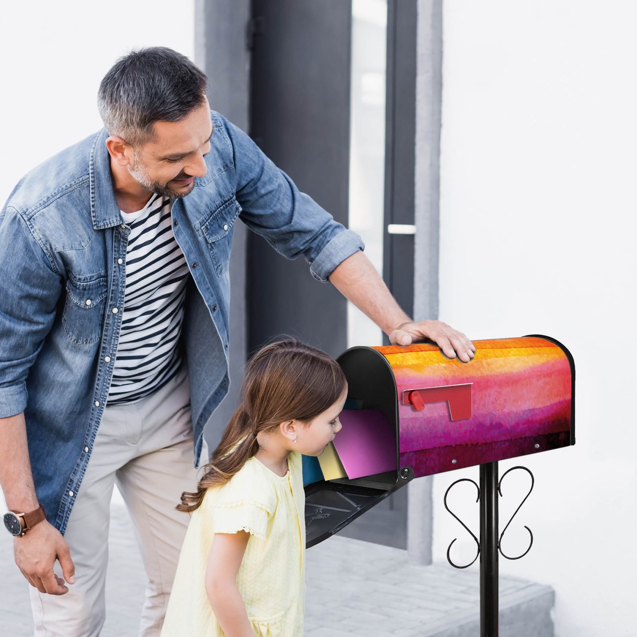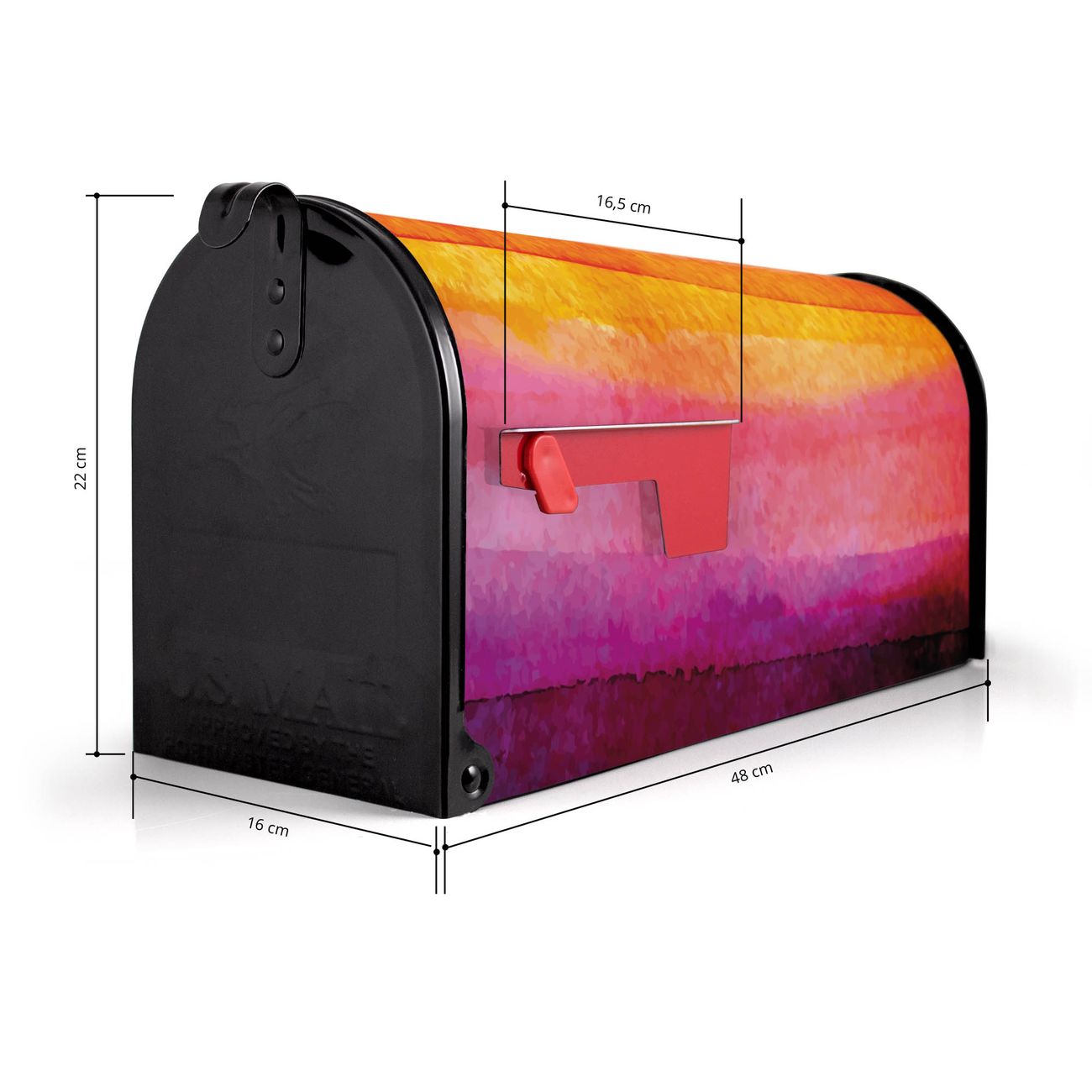 Der amerikanische Briefkasten von banjado mit Aquarell Motiv bietet Ihnen ausreichend Fassungsvermögen, um große A4 Sendungen und Zeitschriften zu empfangen. Die typisch amerikanische rote Fahne zeigt Ihnen an, wenn Sie Post erhalten haben. Die US-Mailbox besteht aus verzinktem Stahlblech welches lackiert wurde und ist 48 x 22 x 16 CM (BxHxT) groß. Die Folie mit Motiv Aquarell besteht aus einer wetter- und UV-resistenten Folie, die mit einem Schutzlaminat überzogen ist, sodass die US Mailbox zusätzlich vor Kratzern geschützt ist. An der Unterkante sind 4 Löcher je Seite um die Mailbox, typisch amerikanisch, an einem Holzpfahl oder einem Zaun zu befestigen. Auf Wunsch können Sie bei uns den passenden Standfuß oder die passende Wandhalterung kaufen um die US-Mailbox sicher zu befestigen. Wir bieten Ihnen ebenfalls Namensschilder, bereits beschriftet oder frei zu beschriften, und verschiedene selbst gestaltete Bitte-Keine-Werbung-Aufkleber.