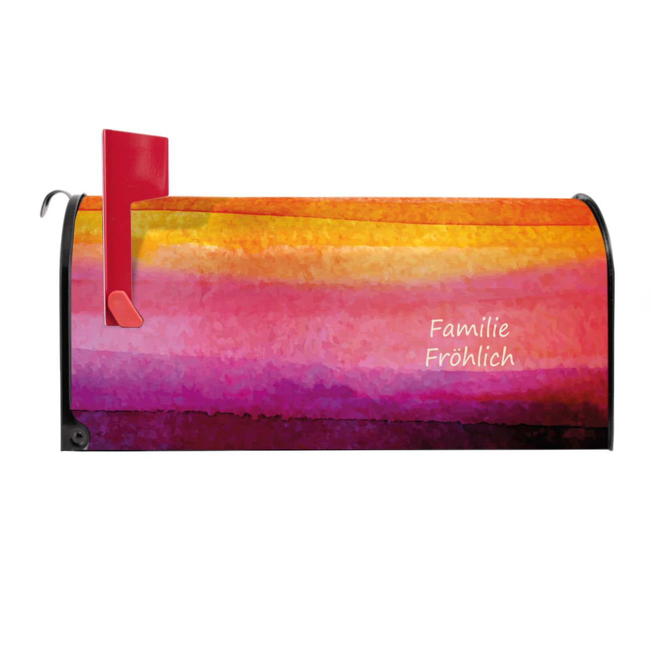 Der amerikanische Briefkasten von banjado mit Aquarell Motiv bietet Ihnen ausreichend Fassungsvermögen, um große A4 Sendungen und Zeitschriften zu empfangen. Die typisch amerikanische rote Fahne zeigt Ihnen an, wenn Sie Post erhalten haben. Die US-Mailbox besteht aus verzinktem Stahlblech welches lackiert wurde und ist 48 x 22 x 16 CM (BxHxT) groß. Die Folie mit Motiv Aquarell besteht aus einer wetter- und UV-resistenten Folie, die mit einem Schutzlaminat überzogen ist, sodass die US Mailbox zusätzlich vor Kratzern geschützt ist. An der Unterkante sind 4 Löcher je Seite um die Mailbox, typisch amerikanisch, an einem Holzpfahl oder einem Zaun zu befestigen. Auf Wunsch können Sie bei uns den passenden Standfuß oder die passende Wandhalterung kaufen um die US-Mailbox sicher zu befestigen. Wir bieten Ihnen ebenfalls Namensschilder, bereits beschriftet oder frei zu beschriften, und verschiedene selbst gestaltete Bitte-Keine-Werbung-Aufkleber.