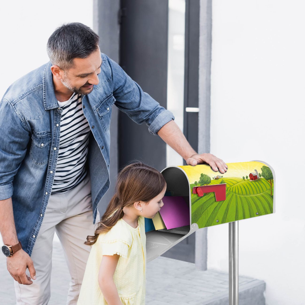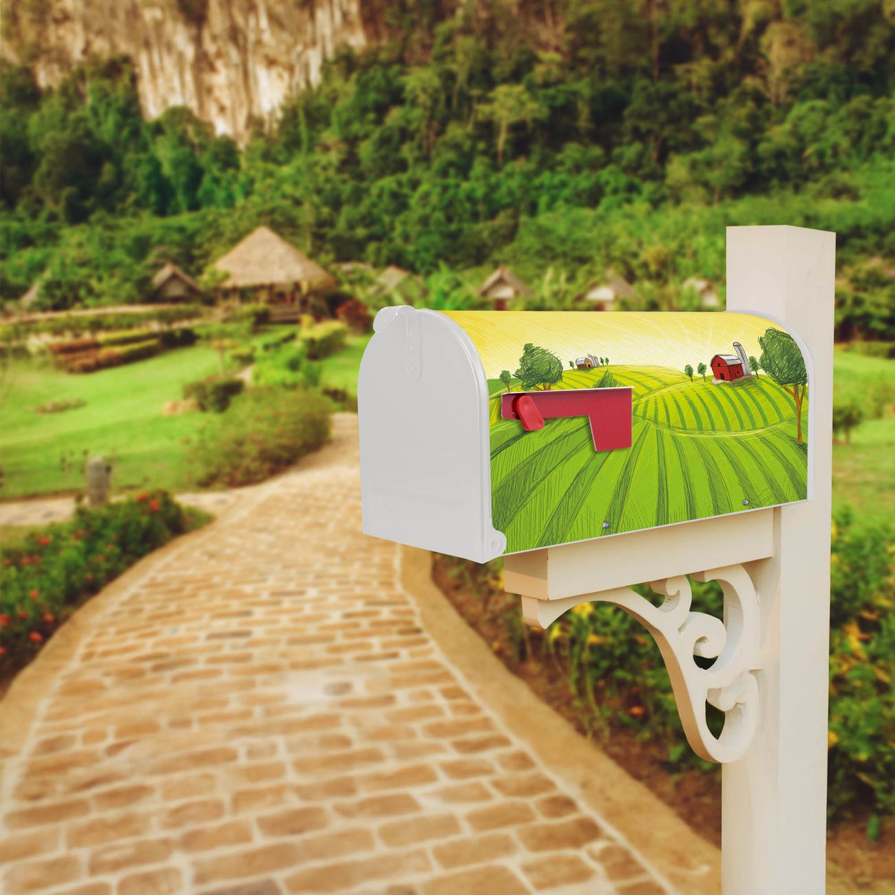 Der amerikanische Briefkasten von banjado mit Auf dem Land Motiv bietet Ihnen ausreichend Fassungsvermögen, um große A4 Sendungen und Zeitschriften zu empfangen. Die typisch amerikanische rote Fahne zeigt Ihnen an, wenn Sie Post erhalten haben. Die US-Mailbox besteht aus verzinktem Stahlblech welches lackiert wurde und ist 48 x 22 x 16 CM (BxHxT) groß. Die Folie mit Motiv Auf dem Land besteht aus einer wetter- und UV-resistenten Folie, die mit einem Schutzlaminat überzogen ist, sodass die US Mailbox zusätzlich vor Kratzern geschützt ist. An der Unterkante sind 4 Löcher je Seite um die Mailbox, typisch amerikanisch, an einem Holzpfahl oder einem Zaun zu befestigen. Auf Wunsch können Sie bei uns den passenden Standfuß oder die passende Wandhalterung kaufen um die US-Mailbox sicher zu befestigen. Wir bieten Ihnen ebenfalls Namensschilder, bereits beschriftet oder frei zu beschriften, und verschiedene selbst gestaltete Bitte-Keine-Werbung-Aufkleber.