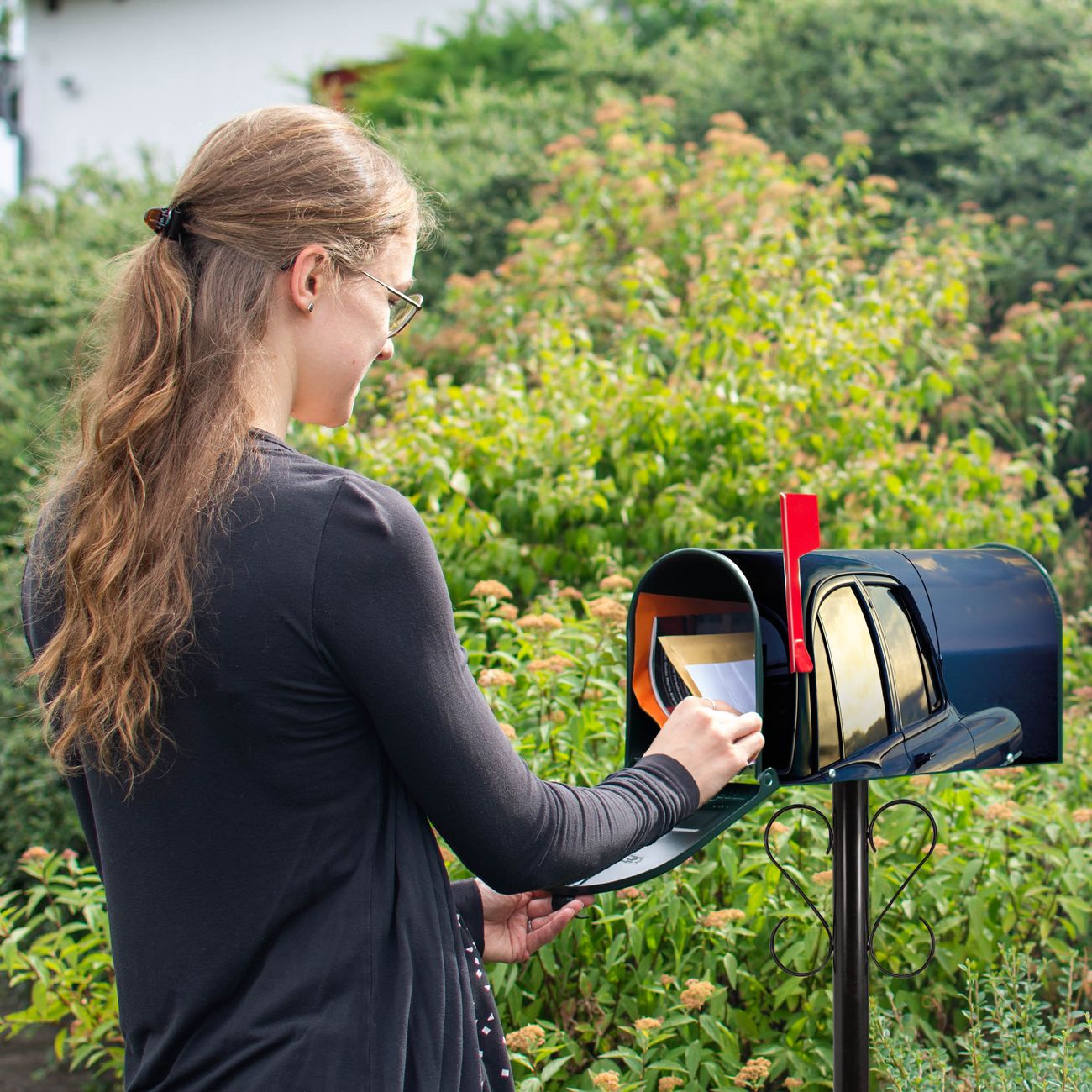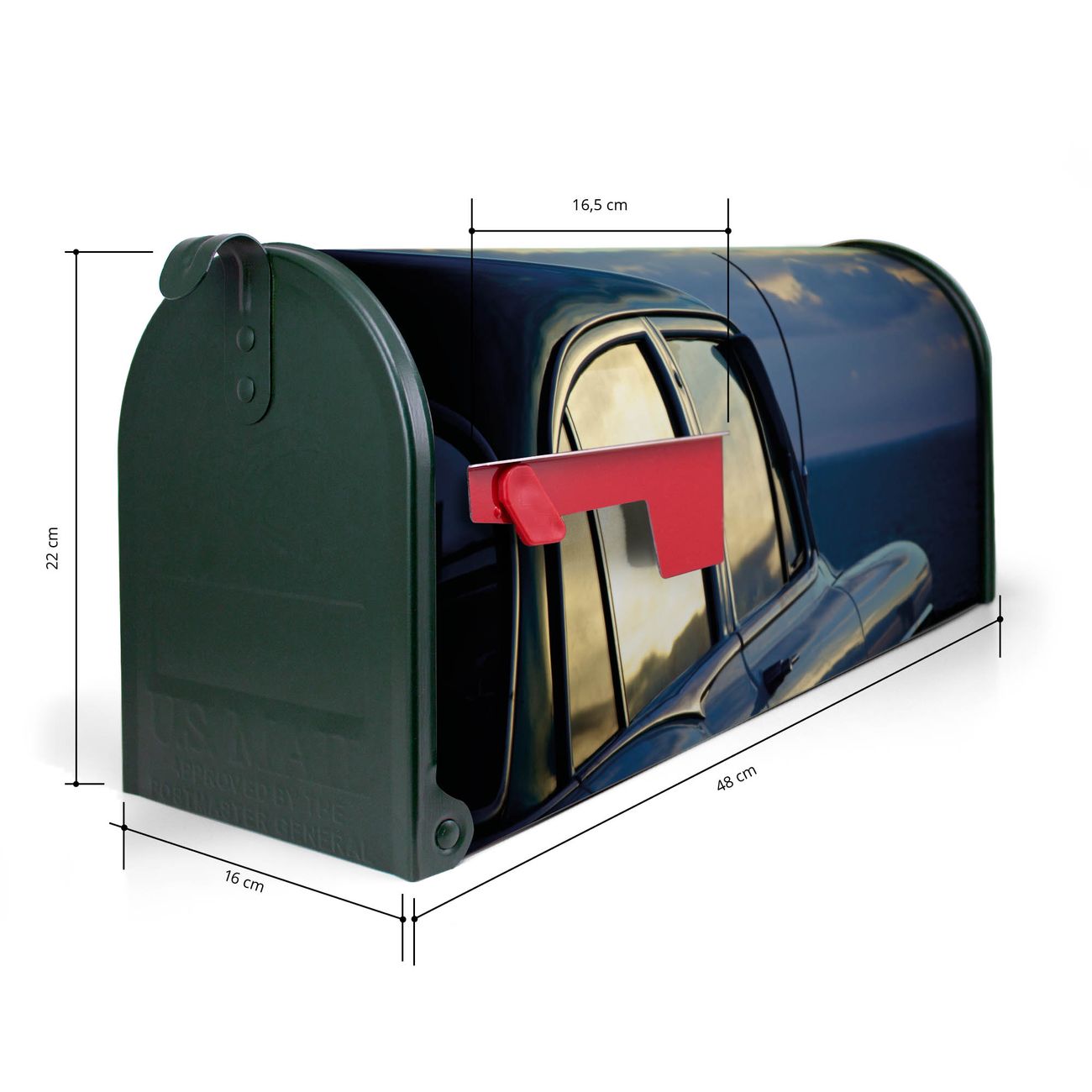 Der amerikanische Briefkasten von banjado mit Auto am Strand Motiv bietet Ihnen ausreichend Fassungsvermögen, um große A4 Sendungen und Zeitschriften zu empfangen. Die typisch amerikanische rote Fahne zeigt Ihnen an, wenn Sie Post erhalten haben. Die US-Mailbox besteht aus verzinktem Stahlblech welches lackiert wurde und ist 48 x 22 x 16 CM (BxHxT) groß. Die Folie mit Motiv Auto am Strand besteht aus einer wetter- und UV-resistenten Folie, die mit einem Schutzlaminat überzogen ist, sodass die US Mailbox zusätzlich vor Kratzern geschützt ist. An der Unterkante sind 4 Löcher je Seite um die Mailbox, typisch amerikanisch, an einem Holzpfahl oder einem Zaun zu befestigen. Auf Wunsch können Sie bei uns den passenden Standfuß oder die passende Wandhalterung kaufen um die US-Mailbox sicher zu befestigen. Wir bieten Ihnen ebenfalls Namensschilder, bereits beschriftet oder frei zu beschriften, und verschiedene selbst gestaltete Bitte-Keine-Werbung-Aufkleber.