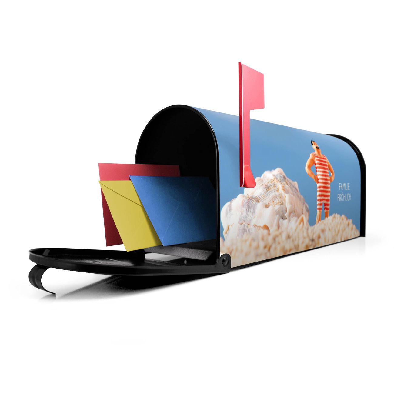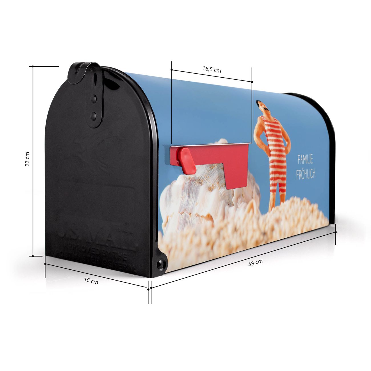 Der amerikanische Briefkasten von banjado mit Bademeister Motiv bietet Ihnen ausreichend Fassungsvermögen, um große A4 Sendungen und Zeitschriften zu empfangen. Die typisch amerikanische rote Fahne zeigt Ihnen an, wenn Sie Post erhalten haben. Die US-Mailbox besteht aus verzinktem Stahlblech welches lackiert wurde und ist 48 x 22 x 16 CM (BxHxT) groß. Die Folie mit Motiv Bademeister besteht aus einer wetter- und UV-resistenten Folie, die mit einem Schutzlaminat überzogen ist, sodass die US Mailbox zusätzlich vor Kratzern geschützt ist. An der Unterkante sind 4 Löcher je Seite um die Mailbox, typisch amerikanisch, an einem Holzpfahl oder einem Zaun zu befestigen. Auf Wunsch können Sie bei uns den passenden Standfuß oder die passende Wandhalterung kaufen um die US-Mailbox sicher zu befestigen. Wir bieten Ihnen ebenfalls Namensschilder, bereits beschriftet oder frei zu beschriften, und verschiedene selbst gestaltete Bitte-Keine-Werbung-Aufkleber.