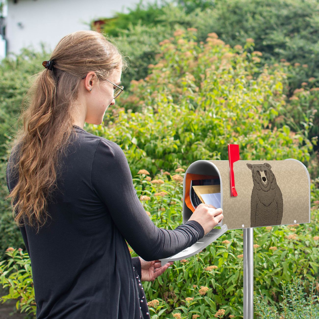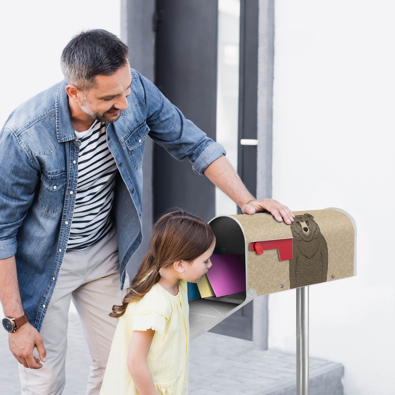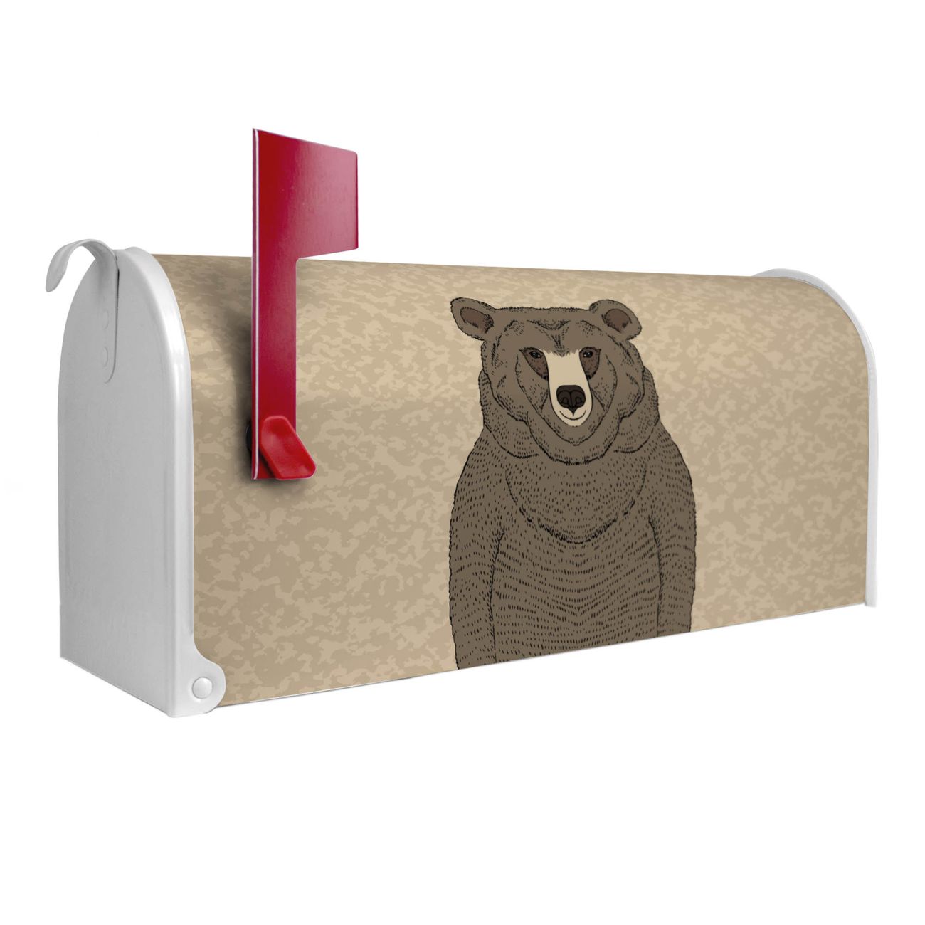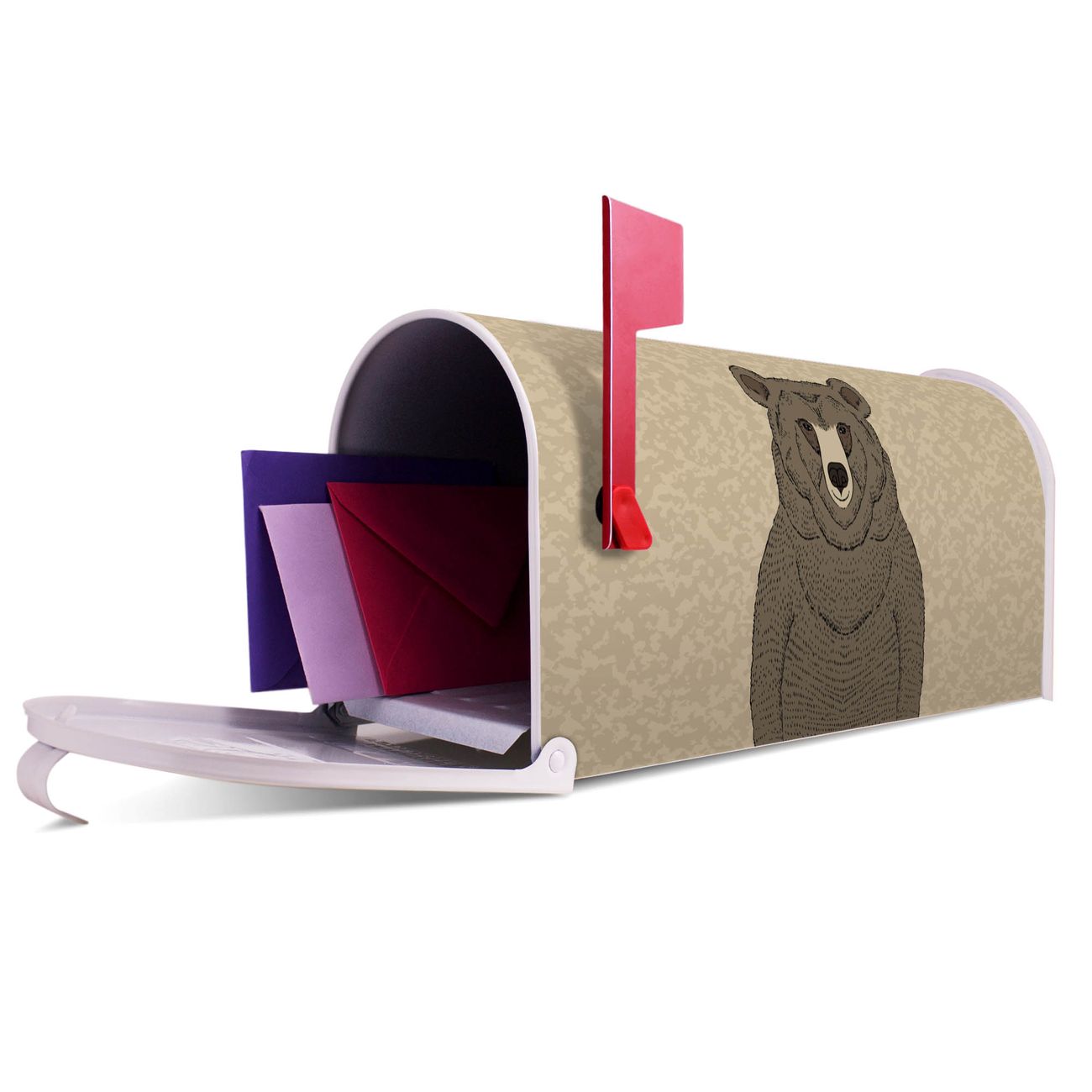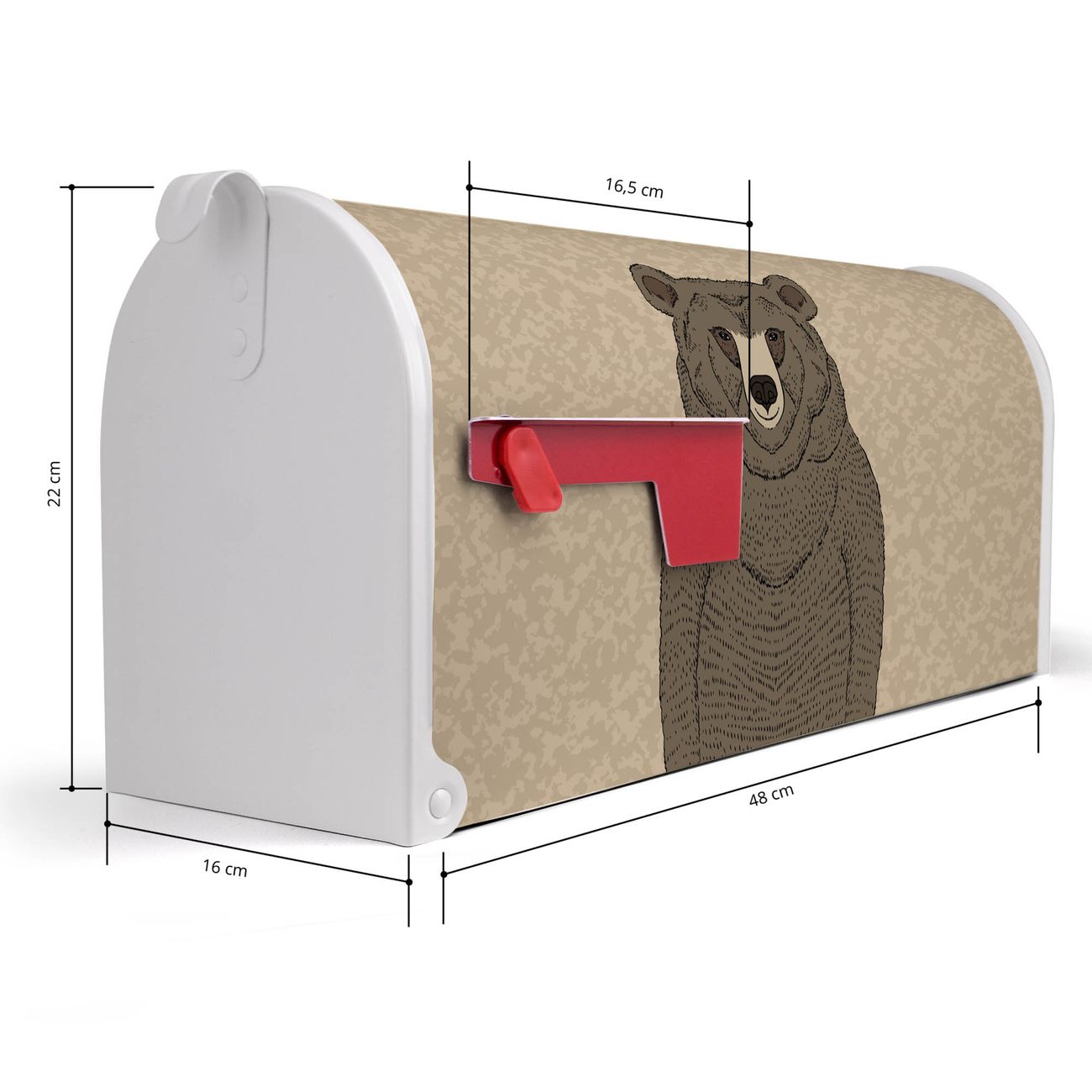 Der amerikanische Briefkasten von banjado mit Bär Ohne Brille Motiv bietet Ihnen ausreichend Fassungsvermögen, um große A4 Sendungen und Zeitschriften zu empfangen. Die typisch amerikanische rote Fahne zeigt Ihnen an, wenn Sie Post erhalten haben. Die US-Mailbox besteht aus verzinktem Stahlblech welches lackiert wurde und ist 48 x 22 x 16 CM (BxHxT) groß. Die Folie mit Motiv Bär Ohne Brille besteht aus einer wetter- und UV-resistenten Folie, die mit einem Schutzlaminat überzogen ist, sodass die US Mailbox zusätzlich vor Kratzern geschützt ist. An der Unterkante sind 4 Löcher je Seite um die Mailbox, typisch amerikanisch, an einem Holzpfahl oder einem Zaun zu befestigen. Auf Wunsch können Sie bei uns den passenden Standfuß oder die passende Wandhalterung kaufen um die US-Mailbox sicher zu befestigen. Wir bieten Ihnen ebenfalls Namensschilder, bereits beschriftet oder frei zu beschriften, und verschiedene selbst gestaltete Bitte-Keine-Werbung-Aufkleber.