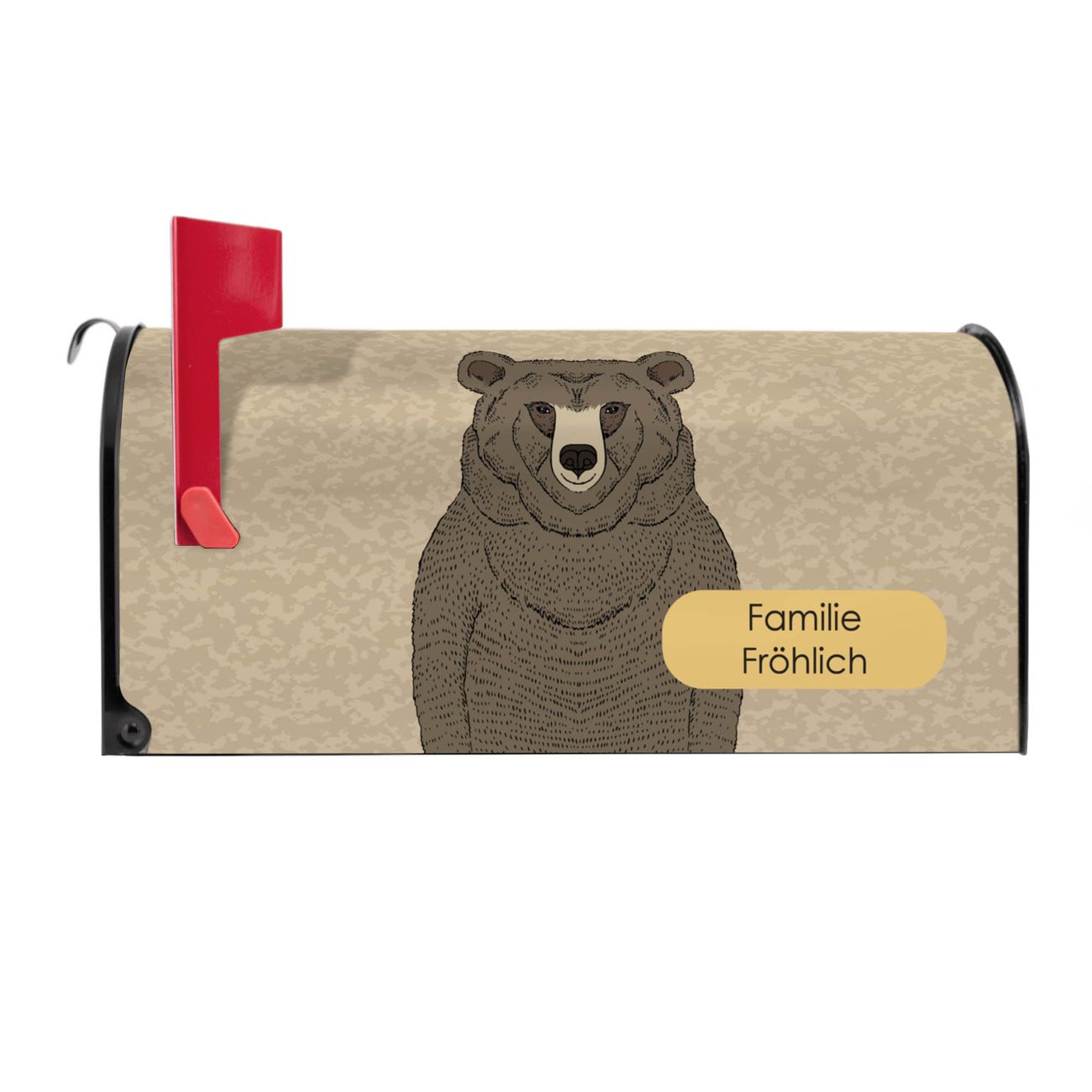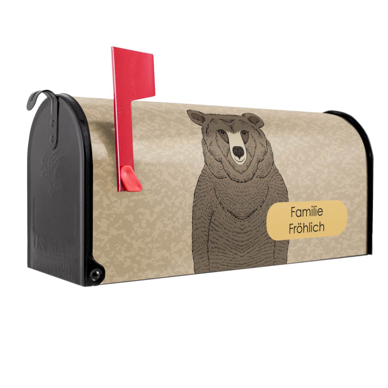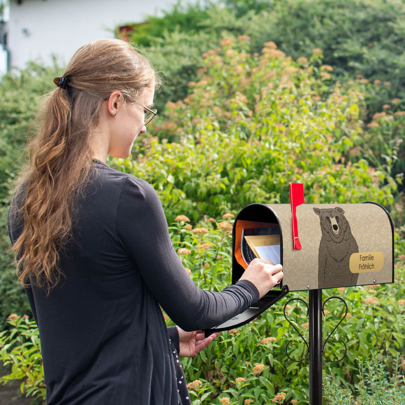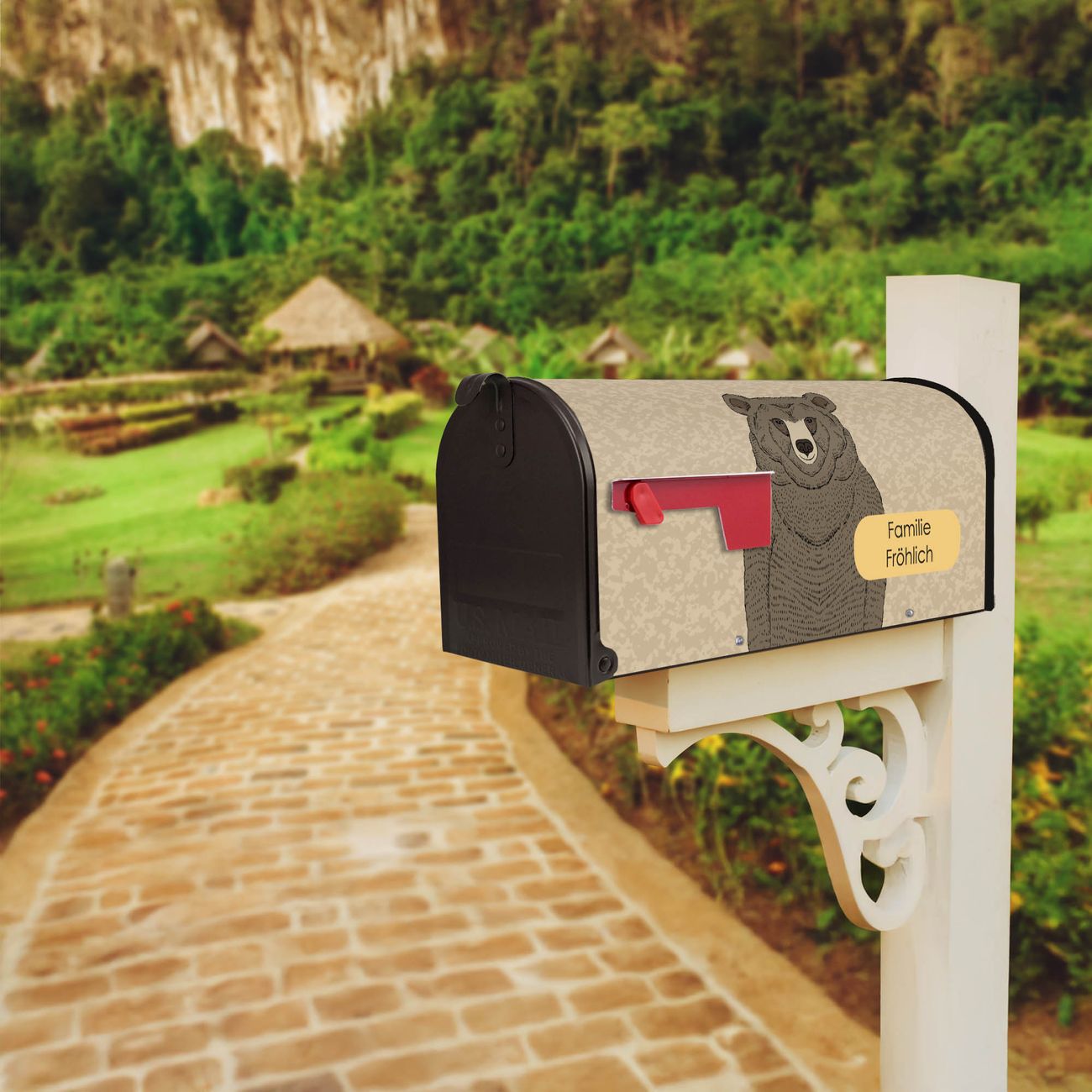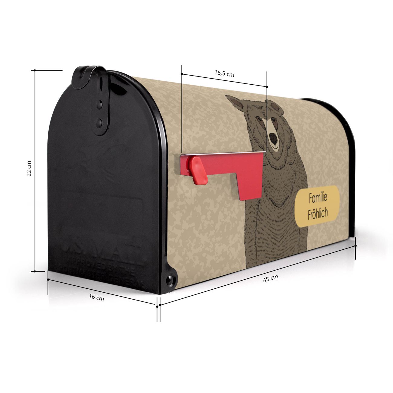 Der amerikanische Briefkasten von banjado mit Bär Ohne Brille Motiv bietet Ihnen ausreichend Fassungsvermögen, um große A4 Sendungen und Zeitschriften zu empfangen. Die typisch amerikanische rote Fahne zeigt Ihnen an, wenn Sie Post erhalten haben. Die US-Mailbox besteht aus verzinktem Stahlblech welches lackiert wurde und ist 48 x 22 x 16 CM (BxHxT) groß. Die Folie mit Motiv Bär Ohne Brille besteht aus einer wetter- und UV-resistenten Folie, die mit einem Schutzlaminat überzogen ist, sodass die US Mailbox zusätzlich vor Kratzern geschützt ist. An der Unterkante sind 4 Löcher je Seite um die Mailbox, typisch amerikanisch, an einem Holzpfahl oder einem Zaun zu befestigen. Auf Wunsch können Sie bei uns den passenden Standfuß oder die passende Wandhalterung kaufen um die US-Mailbox sicher zu befestigen. Wir bieten Ihnen ebenfalls Namensschilder, bereits beschriftet oder frei zu beschriften, und verschiedene selbst gestaltete Bitte-Keine-Werbung-Aufkleber.