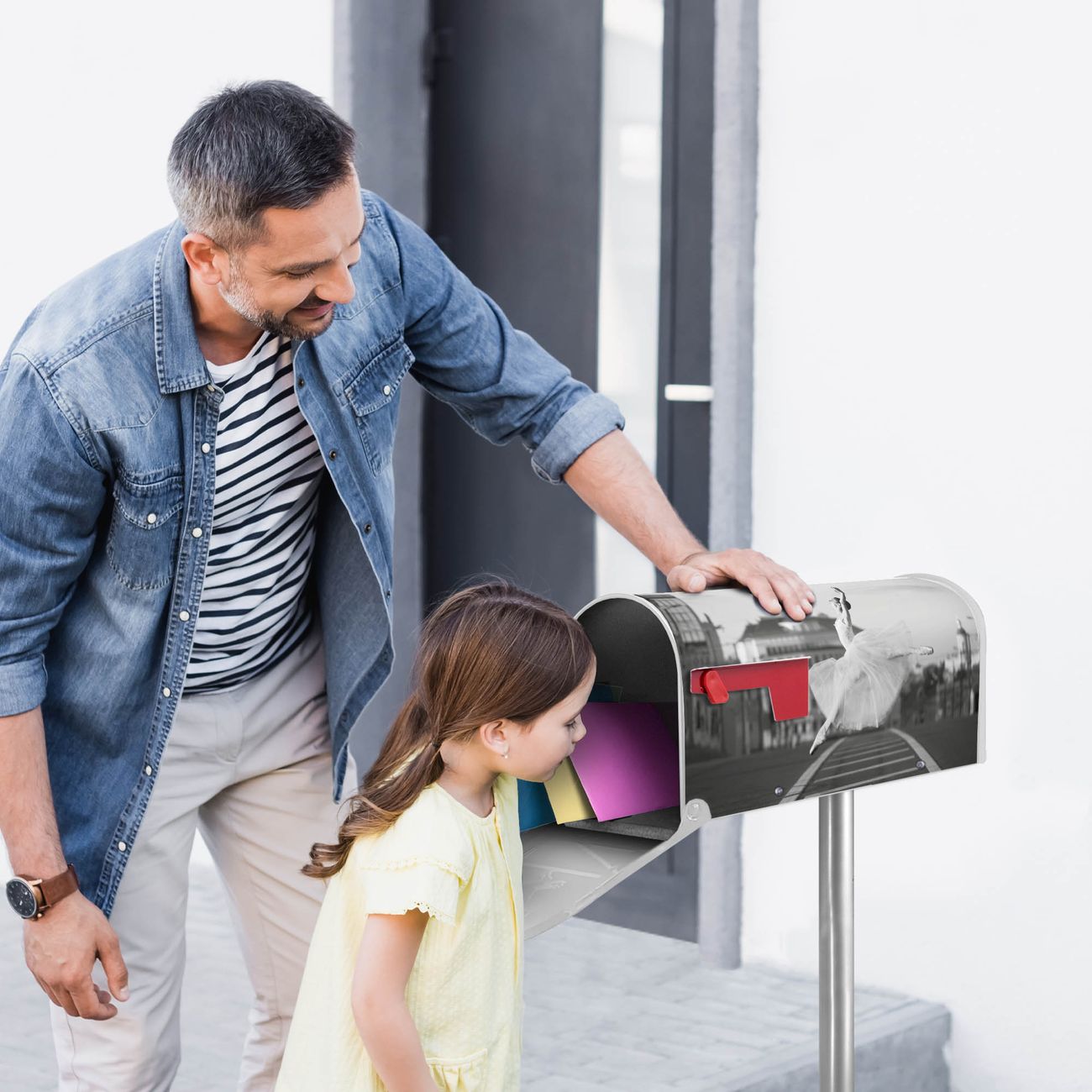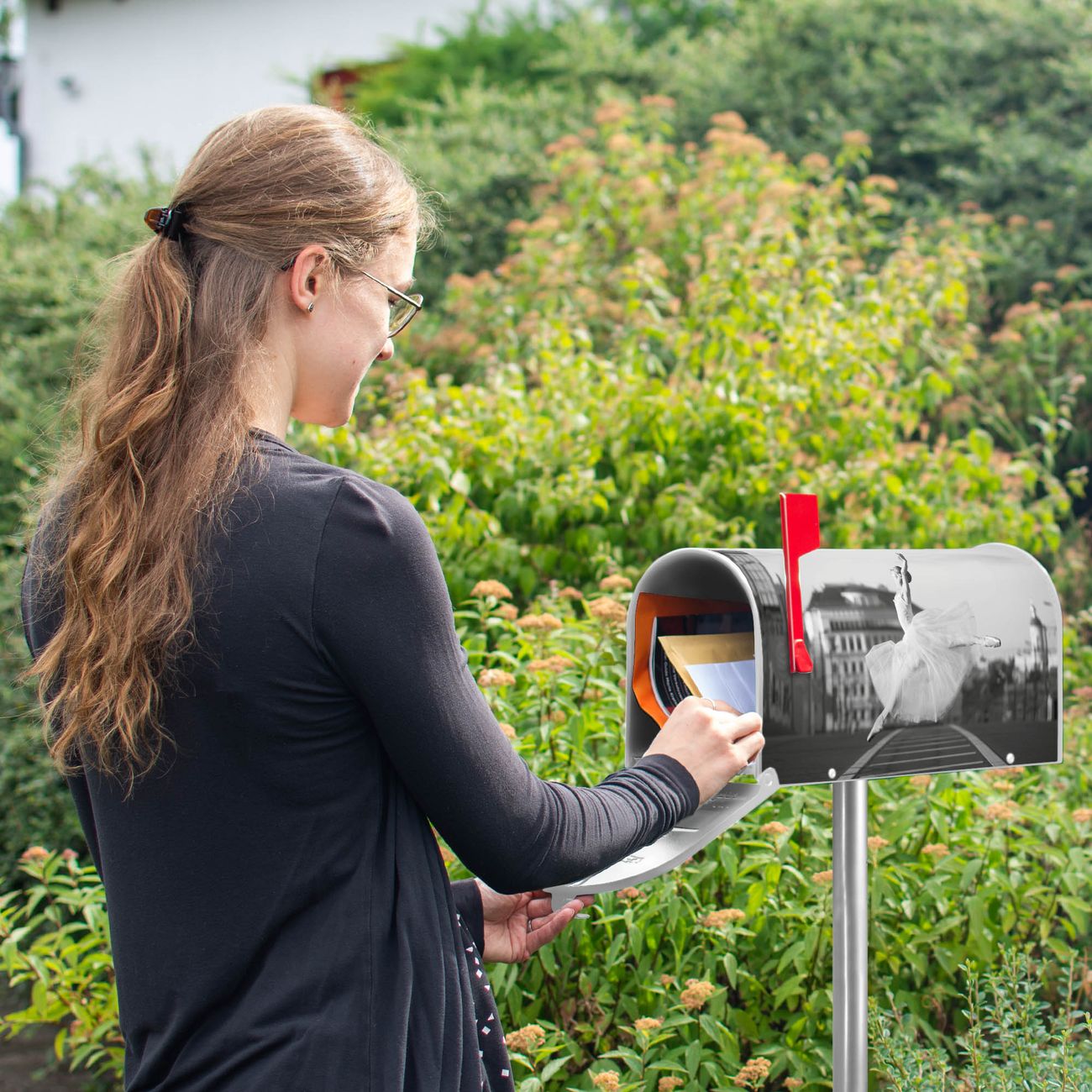 Der amerikanische Briefkasten von banjado mit Ballerina In Moskau Motiv bietet Ihnen ausreichend Fassungsvermögen, um große A4 Sendungen und Zeitschriften zu empfangen. Die typisch amerikanische rote Fahne zeigt Ihnen an, wenn Sie Post erhalten haben. Die US-Mailbox besteht aus verzinktem Stahlblech welches lackiert wurde und ist 48 x 22 x 16 CM (BxHxT) groß. Die Folie mit Motiv Ballerina In Moskau besteht aus einer wetter- und UV-resistenten Folie, die mit einem Schutzlaminat überzogen ist, sodass die US Mailbox zusätzlich vor Kratzern geschützt ist. An der Unterkante sind 4 Löcher je Seite um die Mailbox, typisch amerikanisch, an einem Holzpfahl oder einem Zaun zu befestigen. Auf Wunsch können Sie bei uns den passenden Standfuß oder die passende Wandhalterung kaufen um die US-Mailbox sicher zu befestigen. Wir bieten Ihnen ebenfalls Namensschilder, bereits beschriftet oder frei zu beschriften, und verschiedene selbst gestaltete Bitte-Keine-Werbung-Aufkleber.