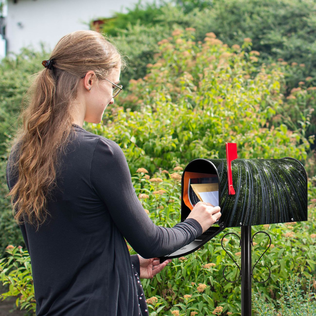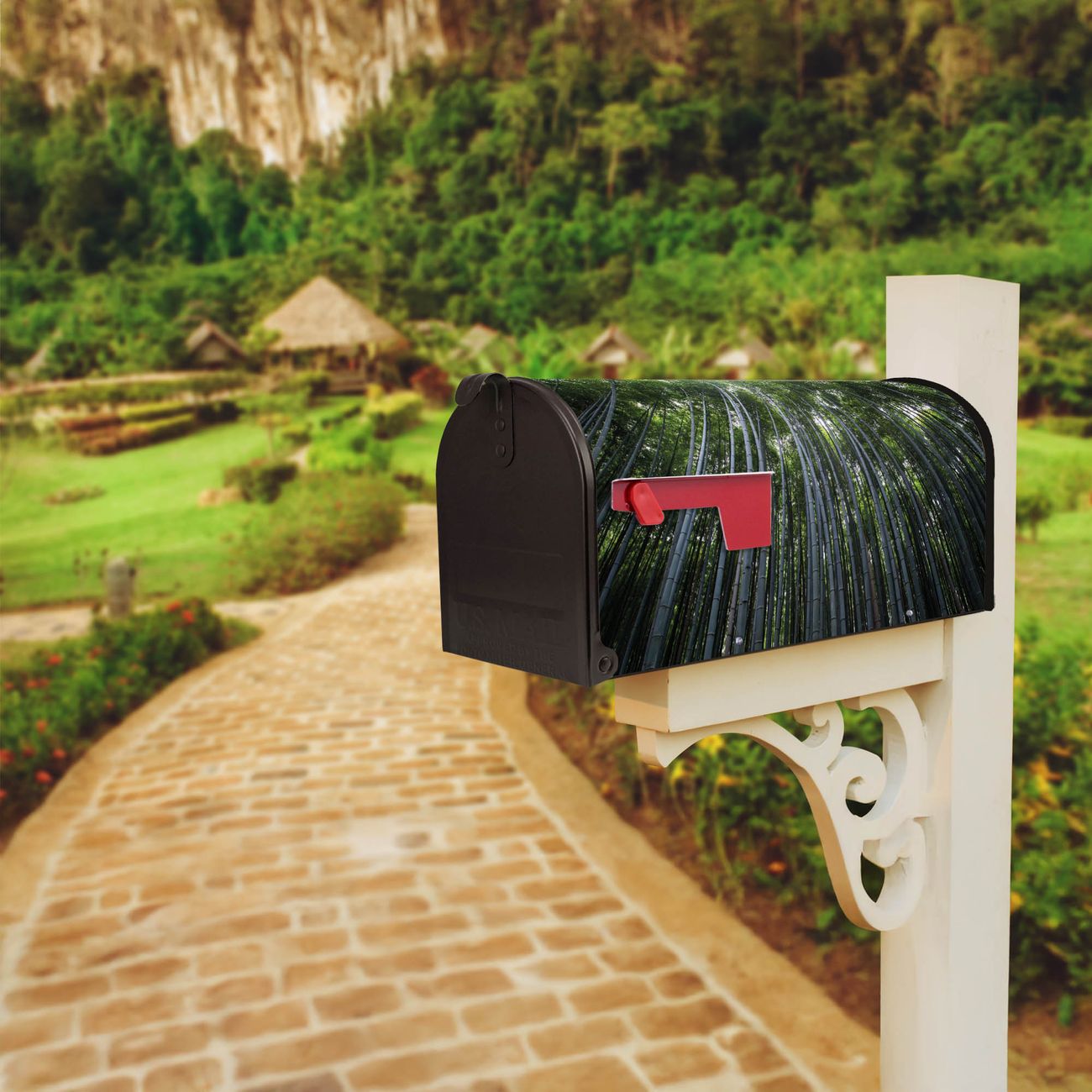 Der amerikanische Briefkasten von banjado mit Bambuswald Motiv bietet Ihnen ausreichend Fassungsvermögen, um große A4 Sendungen und Zeitschriften zu empfangen. Die typisch amerikanische rote Fahne zeigt Ihnen an, wenn Sie Post erhalten haben. Die US-Mailbox besteht aus verzinktem Stahlblech welches lackiert wurde und ist 48 x 22 x 16 CM (BxHxT) groß. Die Folie mit Motiv Bambuswald besteht aus einer wetter- und UV-resistenten Folie, die mit einem Schutzlaminat überzogen ist, sodass die US Mailbox zusätzlich vor Kratzern geschützt ist. An der Unterkante sind 4 Löcher je Seite um die Mailbox, typisch amerikanisch, an einem Holzpfahl oder einem Zaun zu befestigen. Auf Wunsch können Sie bei uns den passenden Standfuß oder die passende Wandhalterung kaufen um die US-Mailbox sicher zu befestigen. Wir bieten Ihnen ebenfalls Namensschilder, bereits beschriftet oder frei zu beschriften, und verschiedene selbst gestaltete Bitte-Keine-Werbung-Aufkleber.