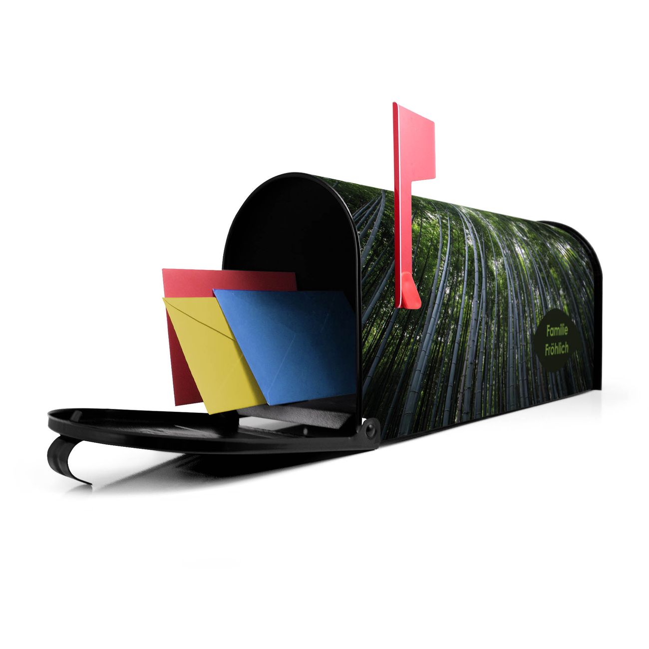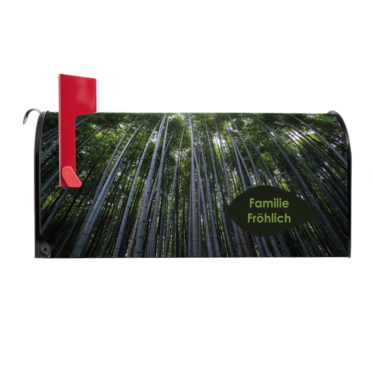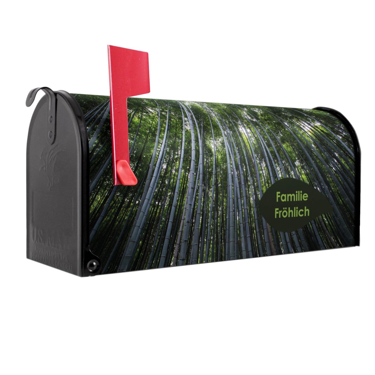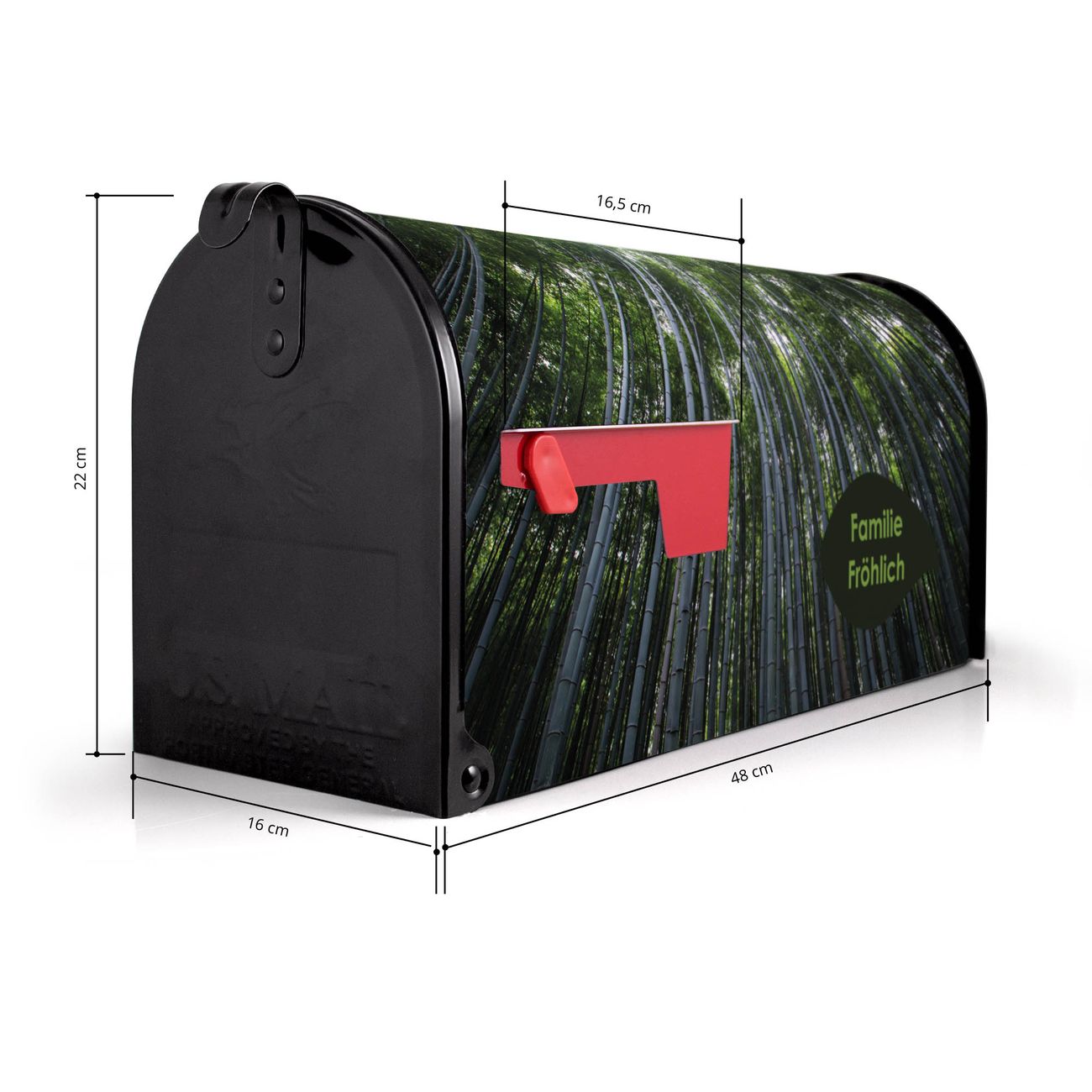 Der amerikanische Briefkasten von banjado mit Bambuswald Motiv bietet Ihnen ausreichend Fassungsvermögen, um große A4 Sendungen und Zeitschriften zu empfangen. Die typisch amerikanische rote Fahne zeigt Ihnen an, wenn Sie Post erhalten haben. Die US-Mailbox besteht aus verzinktem Stahlblech welches lackiert wurde und ist 48 x 22 x 16 CM (BxHxT) groß. Die Folie mit Motiv Bambuswald besteht aus einer wetter- und UV-resistenten Folie, die mit einem Schutzlaminat überzogen ist, sodass die US Mailbox zusätzlich vor Kratzern geschützt ist. An der Unterkante sind 4 Löcher je Seite um die Mailbox, typisch amerikanisch, an einem Holzpfahl oder einem Zaun zu befestigen. Auf Wunsch können Sie bei uns den passenden Standfuß oder die passende Wandhalterung kaufen um die US-Mailbox sicher zu befestigen. Wir bieten Ihnen ebenfalls Namensschilder, bereits beschriftet oder frei zu beschriften, und verschiedene selbst gestaltete Bitte-Keine-Werbung-Aufkleber.