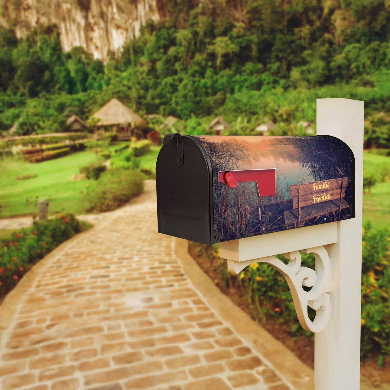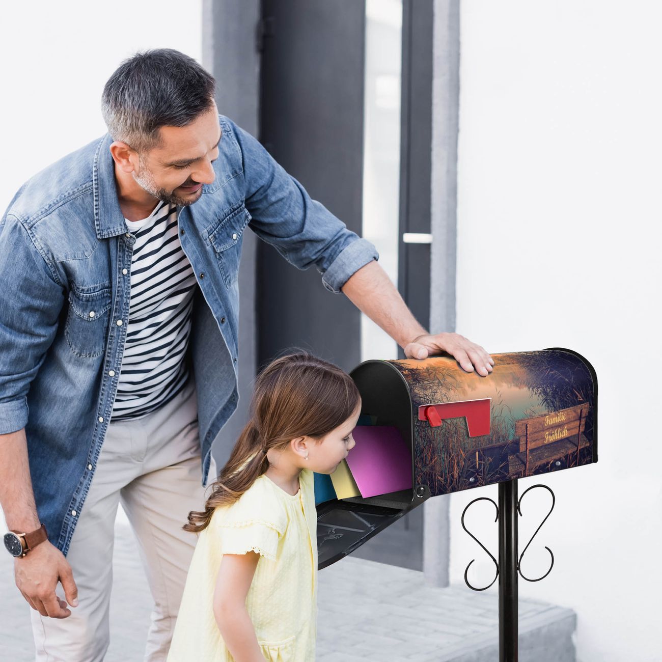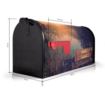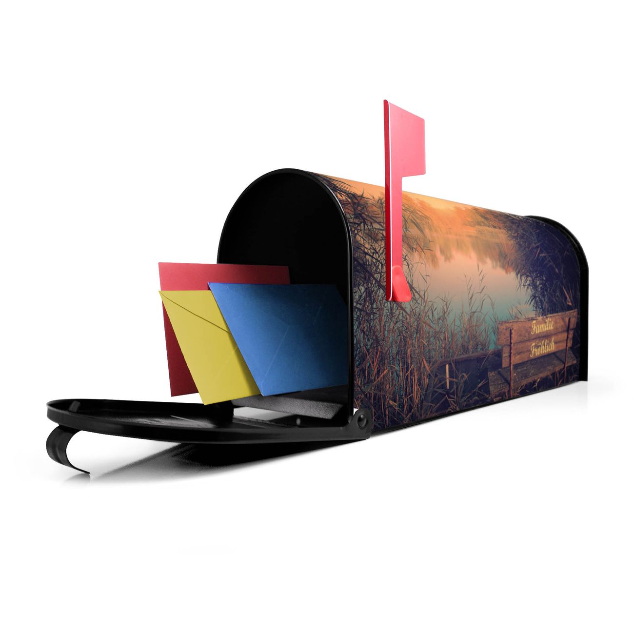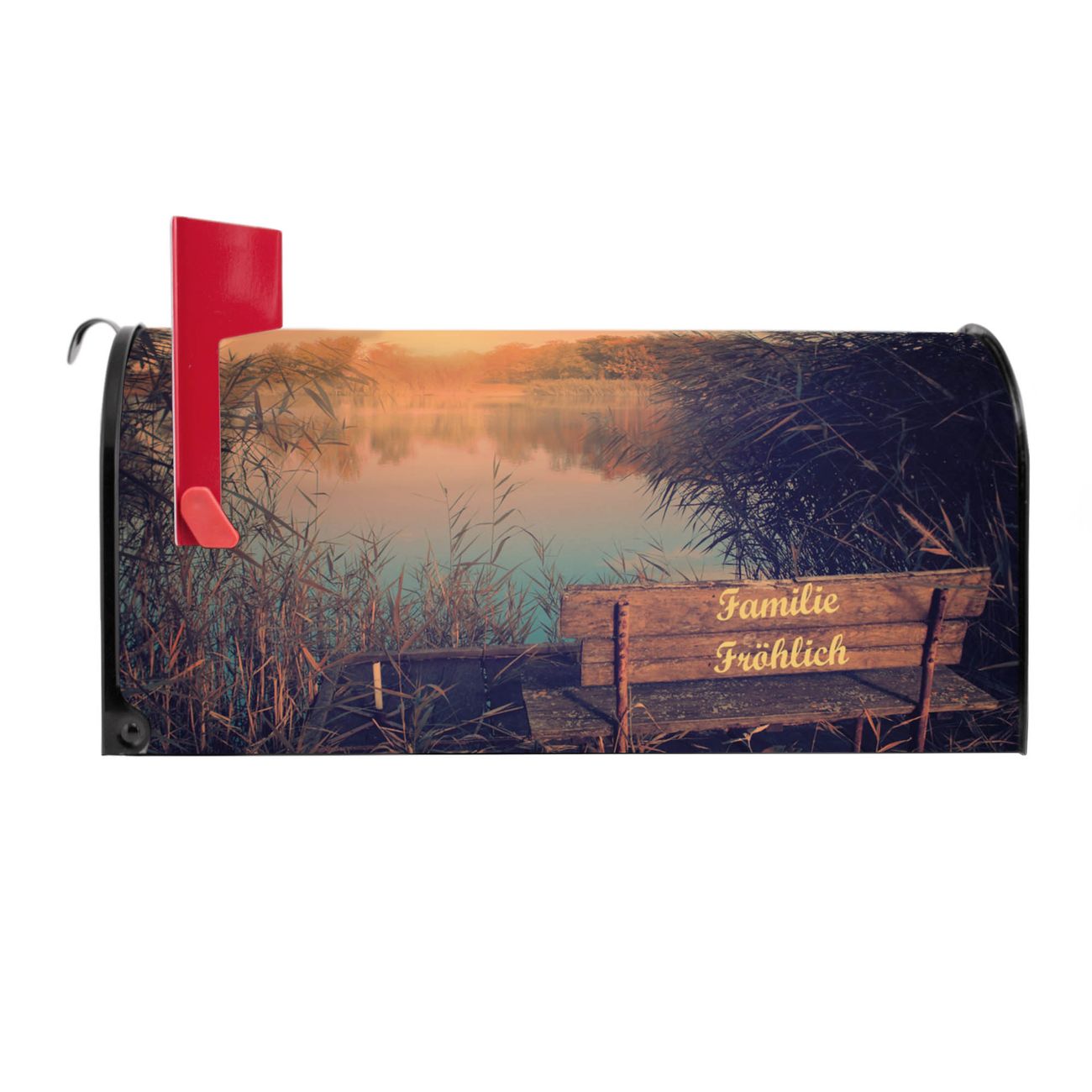 Der amerikanische Briefkasten von banjado mit Bank Am See Motiv bietet Ihnen ausreichend Fassungsvermögen, um große A4 Sendungen und Zeitschriften zu empfangen. Die typisch amerikanische rote Fahne zeigt Ihnen an, wenn Sie Post erhalten haben. Die US-Mailbox besteht aus verzinktem Stahlblech welches lackiert wurde und ist 48 x 22 x 16 CM (BxHxT) groß. Die Folie mit Motiv Bank Am See besteht aus einer wetter- und UV-resistenten Folie, die mit einem Schutzlaminat überzogen ist, sodass die US Mailbox zusätzlich vor Kratzern geschützt ist. An der Unterkante sind 4 Löcher je Seite um die Mailbox, typisch amerikanisch, an einem Holzpfahl oder einem Zaun zu befestigen. Auf Wunsch können Sie bei uns den passenden Standfuß oder die passende Wandhalterung kaufen um die US-Mailbox sicher zu befestigen. Wir bieten Ihnen ebenfalls Namensschilder, bereits beschriftet oder frei zu beschriften, und verschiedene selbst gestaltete Bitte-Keine-Werbung-Aufkleber.