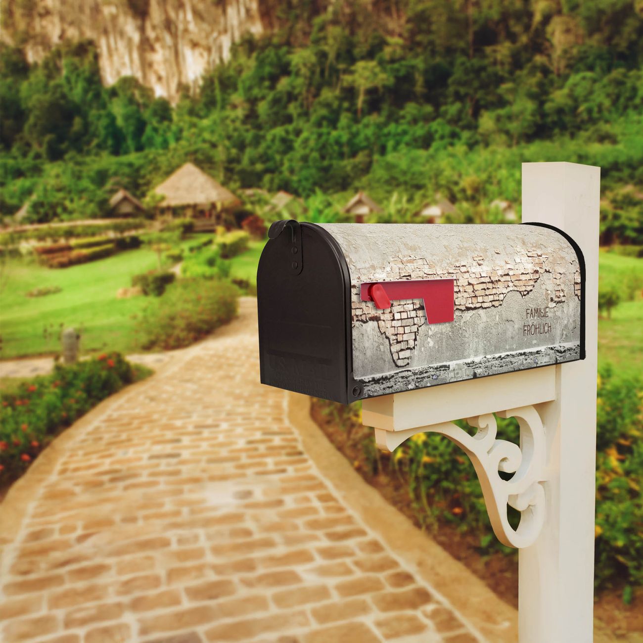 Der amerikanische Briefkasten von banjado mit Baulücke Motiv bietet Ihnen ausreichend Fassungsvermögen, um große A4 Sendungen und Zeitschriften zu empfangen. Die typisch amerikanische rote Fahne zeigt Ihnen an, wenn Sie Post erhalten haben. Die US-Mailbox besteht aus verzinktem Stahlblech welches lackiert wurde und ist 48 x 22 x 16 CM (BxHxT) groß. Die Folie mit Motiv Baulücke besteht aus einer wetter- und UV-resistenten Folie, die mit einem Schutzlaminat überzogen ist, sodass die US Mailbox zusätzlich vor Kratzern geschützt ist. An der Unterkante sind 4 Löcher je Seite um die Mailbox, typisch amerikanisch, an einem Holzpfahl oder einem Zaun zu befestigen. Auf Wunsch können Sie bei uns den passenden Standfuß oder die passende Wandhalterung kaufen um die US-Mailbox sicher zu befestigen. Wir bieten Ihnen ebenfalls Namensschilder, bereits beschriftet oder frei zu beschriften, und verschiedene selbst gestaltete Bitte-Keine-Werbung-Aufkleber.