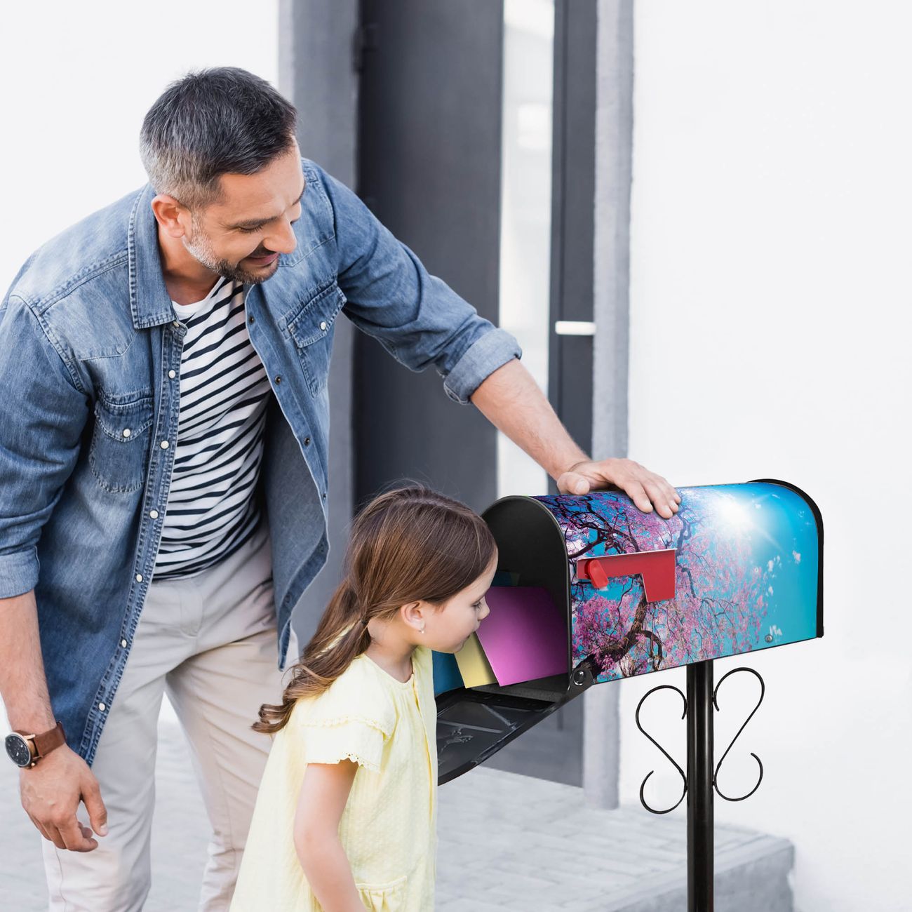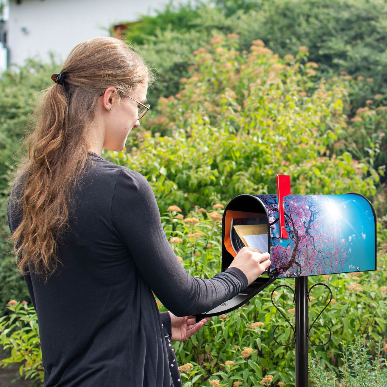 Der amerikanische Briefkasten von banjado mit Baumkrone 2 Motiv bietet Ihnen ausreichend Fassungsvermögen, um große A4 Sendungen und Zeitschriften zu empfangen. Die typisch amerikanische rote Fahne zeigt Ihnen an, wenn Sie Post erhalten haben. Die US-Mailbox besteht aus verzinktem Stahlblech welches lackiert wurde und ist 48 x 22 x 16 CM (BxHxT) groß. Die Folie mit Motiv Baumkrone 2 besteht aus einer wetter- und UV-resistenten Folie, die mit einem Schutzlaminat überzogen ist, sodass die US Mailbox zusätzlich vor Kratzern geschützt ist. An der Unterkante sind 4 Löcher je Seite um die Mailbox, typisch amerikanisch, an einem Holzpfahl oder einem Zaun zu befestigen. Auf Wunsch können Sie bei uns den passenden Standfuß oder die passende Wandhalterung kaufen um die US-Mailbox sicher zu befestigen. Wir bieten Ihnen ebenfalls Namensschilder, bereits beschriftet oder frei zu beschriften, und verschiedene selbst gestaltete Bitte-Keine-Werbung-Aufkleber.