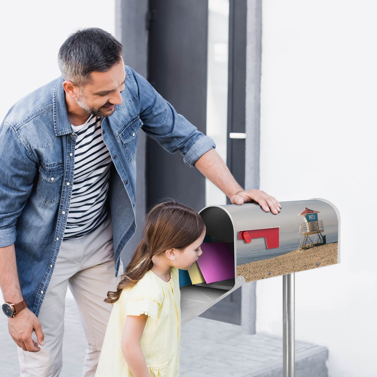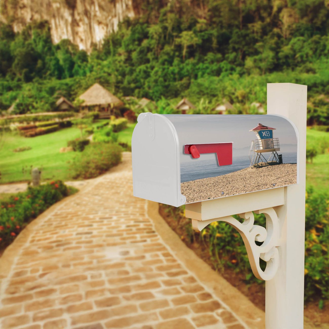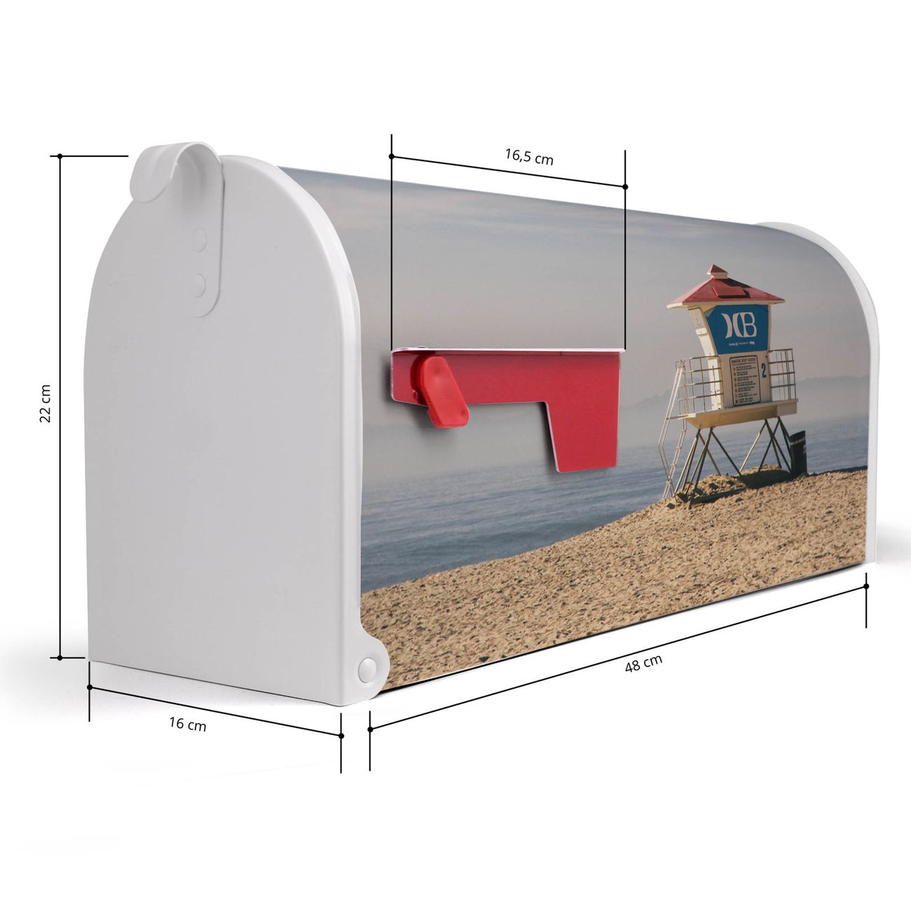 Der amerikanische Briefkasten von banjado mit Beach Section Motiv bietet Ihnen ausreichend Fassungsvermögen, um große A4 Sendungen und Zeitschriften zu empfangen. Die typisch amerikanische rote Fahne zeigt Ihnen an, wenn Sie Post erhalten haben. Die US-Mailbox besteht aus verzinktem Stahlblech welches lackiert wurde und ist 48 x 22 x 16 CM (BxHxT) groß. Die Folie mit Motiv Beach Section besteht aus einer wetter- und UV-resistenten Folie, die mit einem Schutzlaminat überzogen ist, sodass die US Mailbox zusätzlich vor Kratzern geschützt ist. An der Unterkante sind 4 Löcher je Seite um die Mailbox, typisch amerikanisch, an einem Holzpfahl oder einem Zaun zu befestigen. Auf Wunsch können Sie bei uns den passenden Standfuß oder die passende Wandhalterung kaufen um die US-Mailbox sicher zu befestigen. Wir bieten Ihnen ebenfalls Namensschilder, bereits beschriftet oder frei zu beschriften, und verschiedene selbst gestaltete Bitte-Keine-Werbung-Aufkleber.