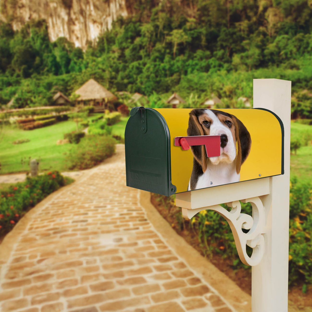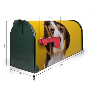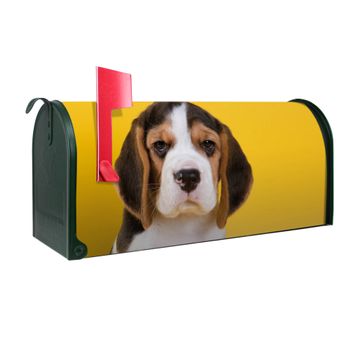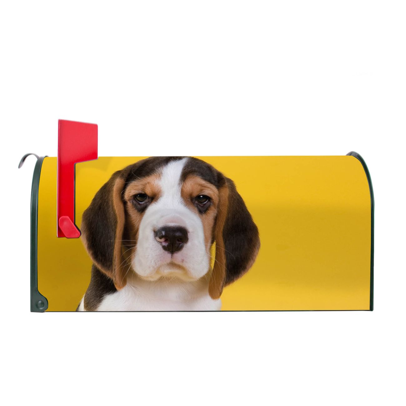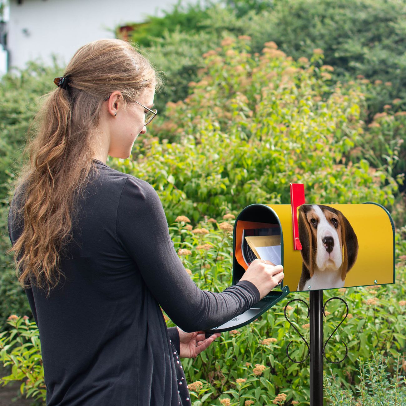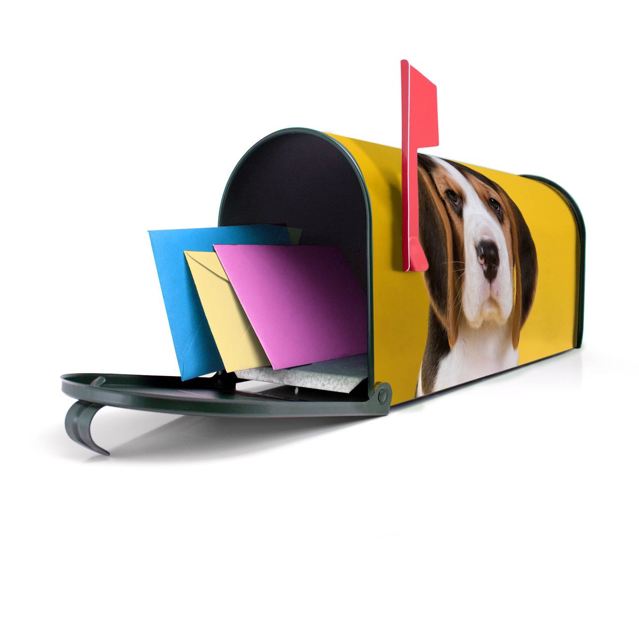 Der amerikanische Briefkasten von banjado mit Beagle Motiv bietet Ihnen ausreichend Fassungsvermögen, um große A4 Sendungen und Zeitschriften zu empfangen. Die typisch amerikanische rote Fahne zeigt Ihnen an, wenn Sie Post erhalten haben. Die US-Mailbox besteht aus verzinktem Stahlblech welches lackiert wurde und ist 48 x 22 x 16 CM (BxHxT) groß. Die Folie mit Motiv Beagle besteht aus einer wetter- und UV-resistenten Folie, die mit einem Schutzlaminat überzogen ist, sodass die US Mailbox zusätzlich vor Kratzern geschützt ist. An der Unterkante sind 4 Löcher je Seite um die Mailbox, typisch amerikanisch, an einem Holzpfahl oder einem Zaun zu befestigen. Auf Wunsch können Sie bei uns den passenden Standfuß oder die passende Wandhalterung kaufen um die US-Mailbox sicher zu befestigen. Wir bieten Ihnen ebenfalls Namensschilder, bereits beschriftet oder frei zu beschriften, und verschiedene selbst gestaltete Bitte-Keine-Werbung-Aufkleber.