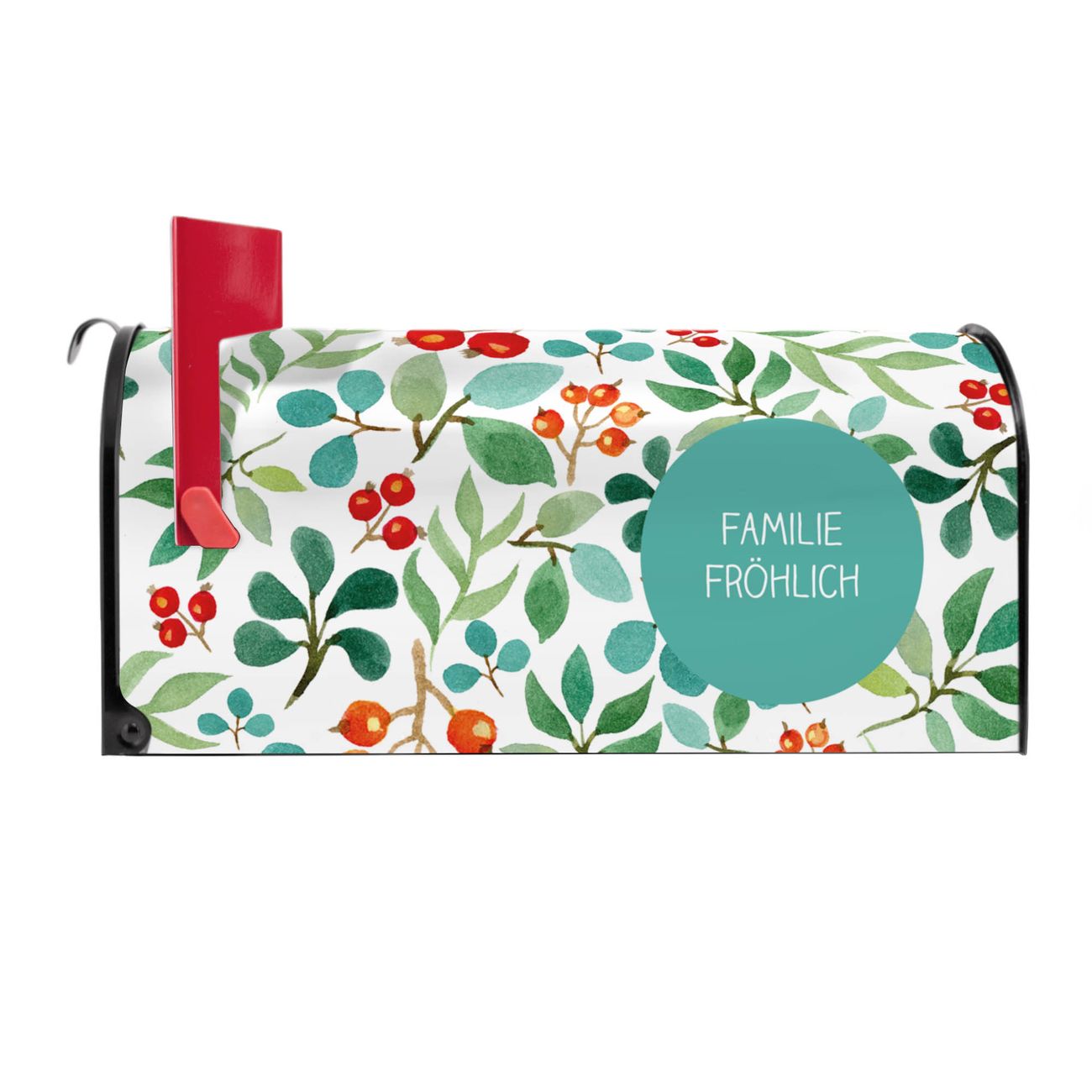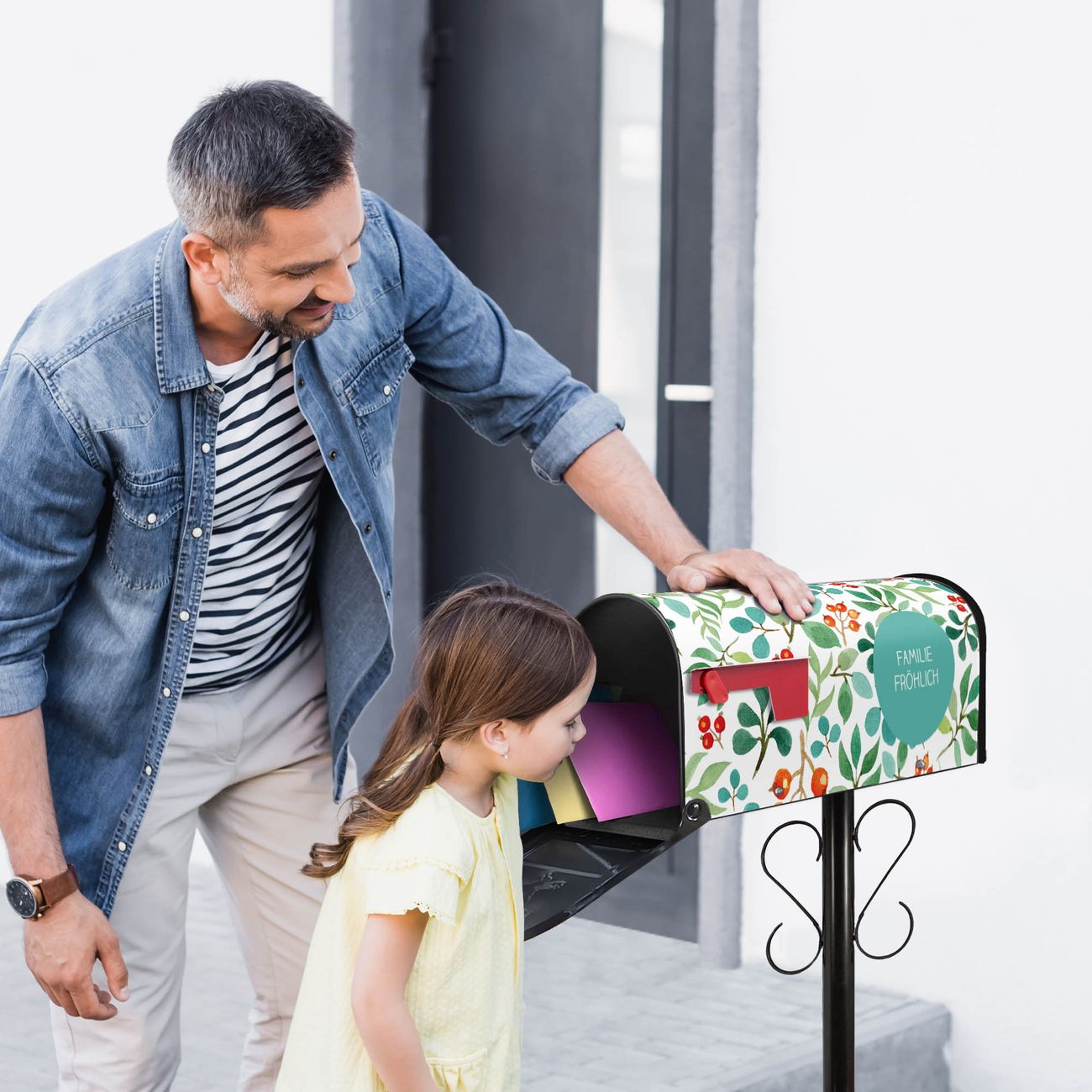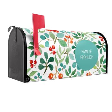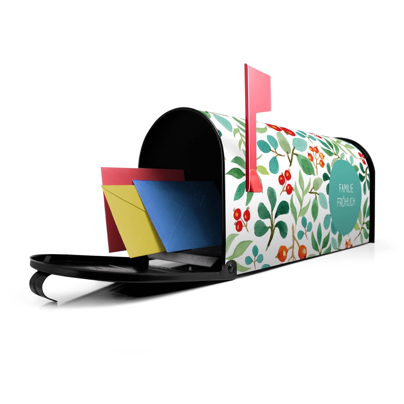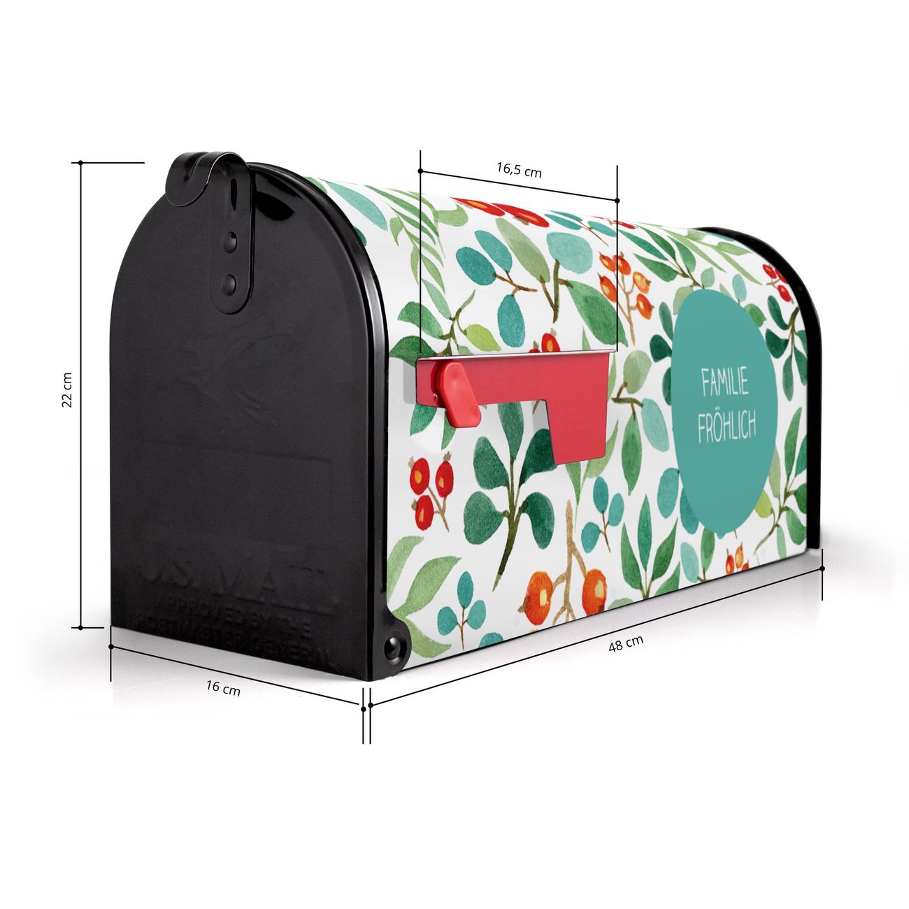 Der amerikanische Briefkasten von banjado mit Beeren und Blätter Motiv bietet Ihnen ausreichend Fassungsvermögen, um große A4 Sendungen und Zeitschriften zu empfangen. Die typisch amerikanische rote Fahne zeigt Ihnen an, wenn Sie Post erhalten haben. Die US-Mailbox besteht aus verzinktem Stahlblech welches lackiert wurde und ist 48 x 22 x 16 CM (BxHxT) groß. Die Folie mit Motiv Beeren und Blätter besteht aus einer wetter- und UV-resistenten Folie, die mit einem Schutzlaminat überzogen ist, sodass die US Mailbox zusätzlich vor Kratzern geschützt ist. An der Unterkante sind 4 Löcher je Seite um die Mailbox, typisch amerikanisch, an einem Holzpfahl oder einem Zaun zu befestigen. Auf Wunsch können Sie bei uns den passenden Standfuß oder die passende Wandhalterung kaufen um die US-Mailbox sicher zu befestigen. Wir bieten Ihnen ebenfalls Namensschilder, bereits beschriftet oder frei zu beschriften, und verschiedene selbst gestaltete Bitte-Keine-Werbung-Aufkleber.