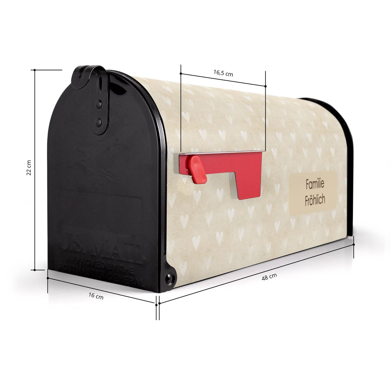 Der amerikanische Briefkasten von banjado mit Beige Herzen Motiv bietet Ihnen ausreichend Fassungsvermögen, um große A4 Sendungen und Zeitschriften zu empfangen. Die typisch amerikanische rote Fahne zeigt Ihnen an, wenn Sie Post erhalten haben. Die US-Mailbox besteht aus verzinktem Stahlblech welches lackiert wurde und ist 48 x 22 x 16 CM (BxHxT) groß. Die Folie mit Motiv Beige Herzen besteht aus einer wetter- und UV-resistenten Folie, die mit einem Schutzlaminat überzogen ist, sodass die US Mailbox zusätzlich vor Kratzern geschützt ist. An der Unterkante sind 4 Löcher je Seite um die Mailbox, typisch amerikanisch, an einem Holzpfahl oder einem Zaun zu befestigen. Auf Wunsch können Sie bei uns den passenden Standfuß oder die passende Wandhalterung kaufen um die US-Mailbox sicher zu befestigen. Wir bieten Ihnen ebenfalls Namensschilder, bereits beschriftet oder frei zu beschriften, und verschiedene selbst gestaltete Bitte-Keine-Werbung-Aufkleber.
