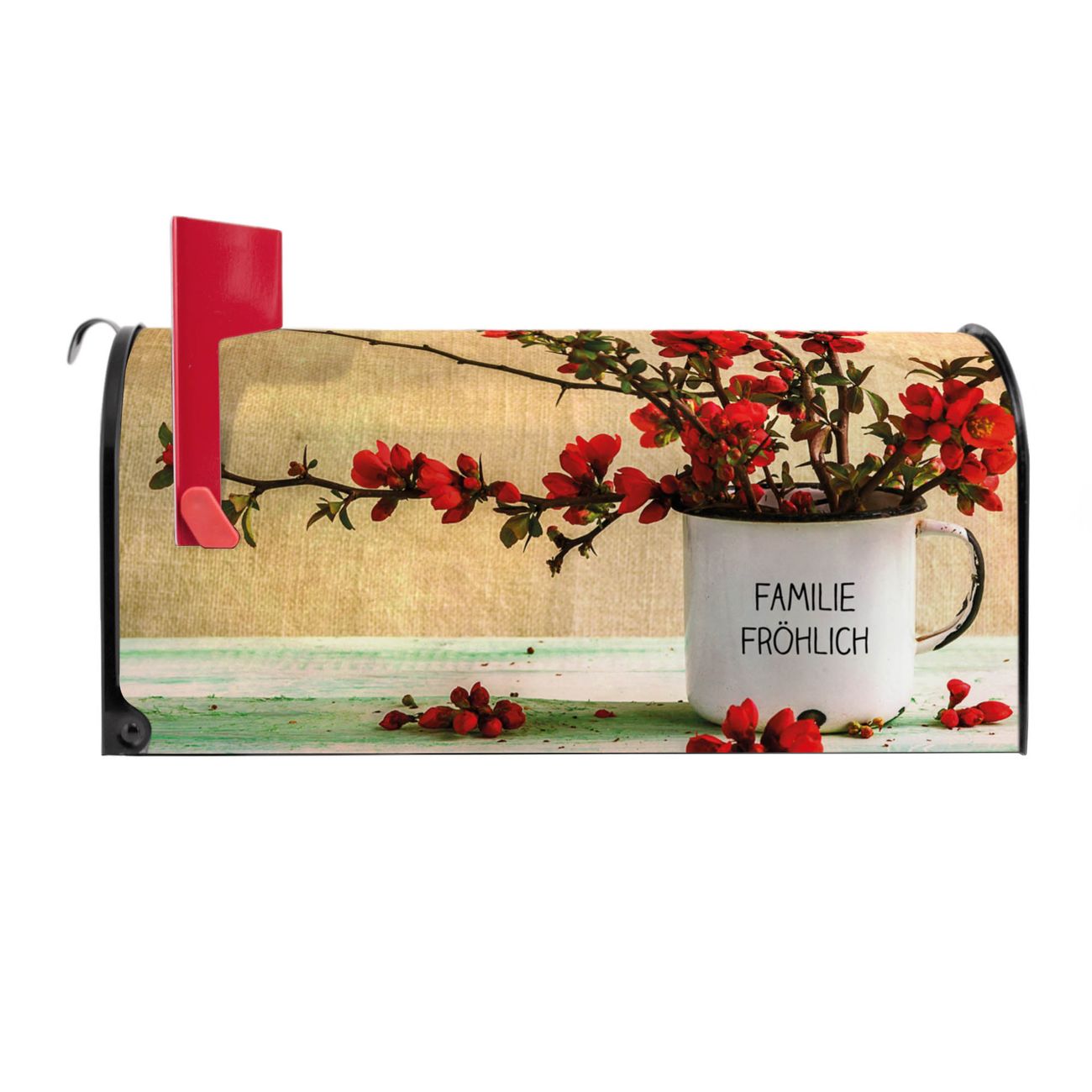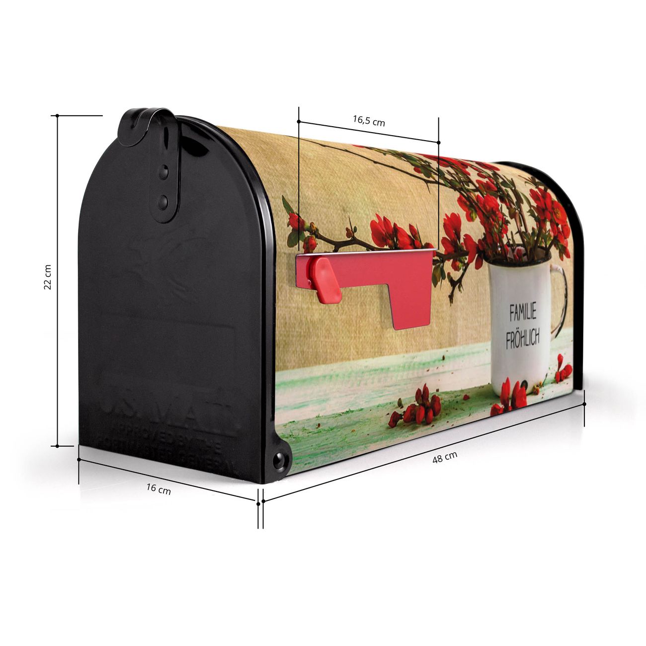 Der amerikanische Briefkasten von banjado mit Berberitzen Motiv bietet Ihnen ausreichend Fassungsvermögen, um große A4 Sendungen und Zeitschriften zu empfangen. Die typisch amerikanische rote Fahne zeigt Ihnen an, wenn Sie Post erhalten haben. Die US-Mailbox besteht aus verzinktem Stahlblech welches lackiert wurde und ist 48 x 22 x 16 CM (BxHxT) groß. Die Folie mit Motiv Berberitzen besteht aus einer wetter- und UV-resistenten Folie, die mit einem Schutzlaminat überzogen ist, sodass die US Mailbox zusätzlich vor Kratzern geschützt ist. An der Unterkante sind 4 Löcher je Seite um die Mailbox, typisch amerikanisch, an einem Holzpfahl oder einem Zaun zu befestigen. Auf Wunsch können Sie bei uns den passenden Standfuß oder die passende Wandhalterung kaufen um die US-Mailbox sicher zu befestigen. Wir bieten Ihnen ebenfalls Namensschilder, bereits beschriftet oder frei zu beschriften, und verschiedene selbst gestaltete Bitte-Keine-Werbung-Aufkleber.