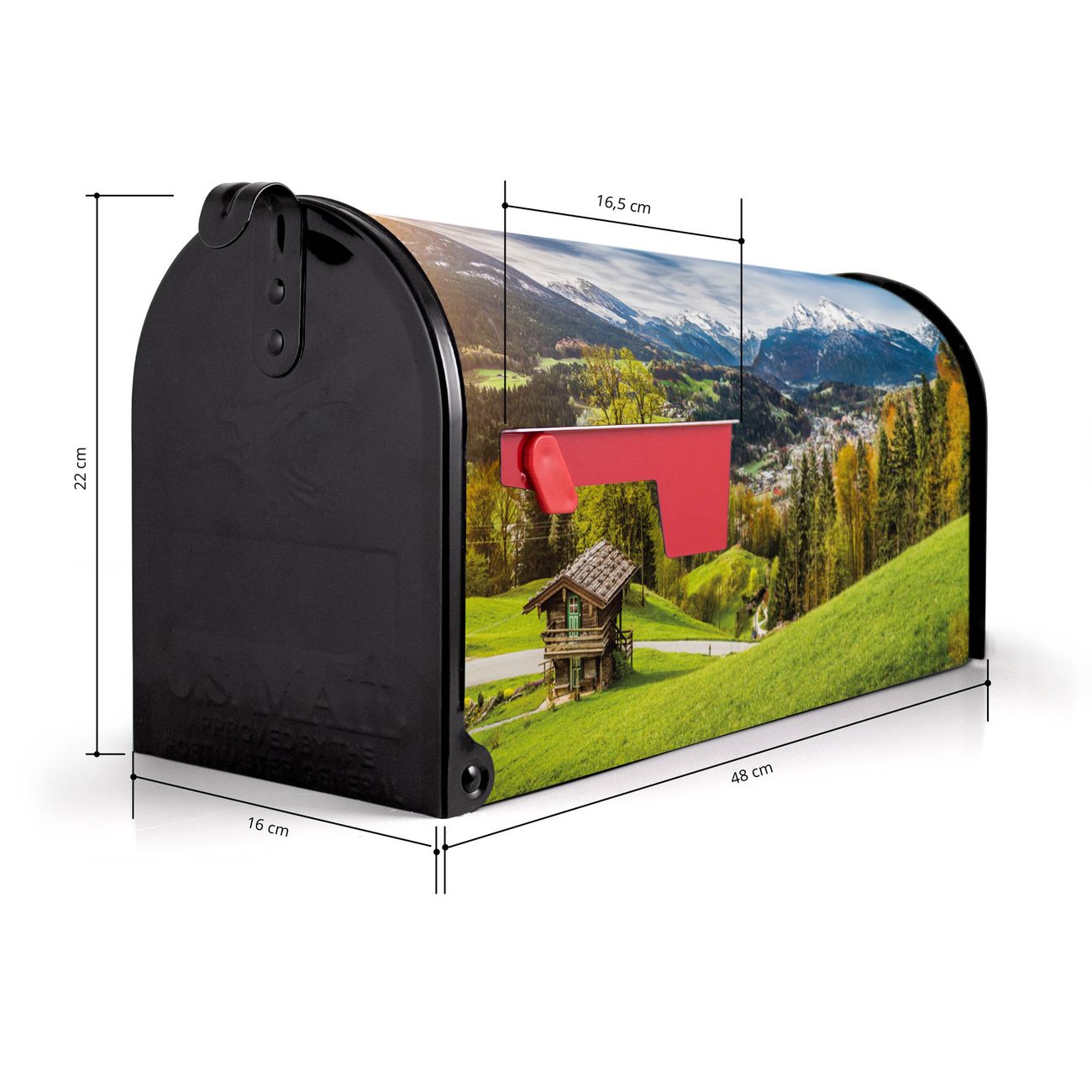 Der amerikanische Briefkasten von banjado mit Berchtesgadener Land Motiv bietet Ihnen ausreichend Fassungsvermögen, um große A4 Sendungen und Zeitschriften zu empfangen. Die typisch amerikanische rote Fahne zeigt Ihnen an, wenn Sie Post erhalten haben. Die US-Mailbox besteht aus verzinktem Stahlblech welches lackiert wurde und ist 48 x 22 x 16 CM (BxHxT) groß. Die Folie mit Motiv Berchtesgadener Land besteht aus einer wetter- und UV-resistenten Folie, die mit einem Schutzlaminat überzogen ist, sodass die US Mailbox zusätzlich vor Kratzern geschützt ist. An der Unterkante sind 4 Löcher je Seite um die Mailbox, typisch amerikanisch, an einem Holzpfahl oder einem Zaun zu befestigen. Auf Wunsch können Sie bei uns den passenden Standfuß oder die passende Wandhalterung kaufen um die US-Mailbox sicher zu befestigen. Wir bieten Ihnen ebenfalls Namensschilder, bereits beschriftet oder frei zu beschriften, und verschiedene selbst gestaltete Bitte-Keine-Werbung-Aufkleber.