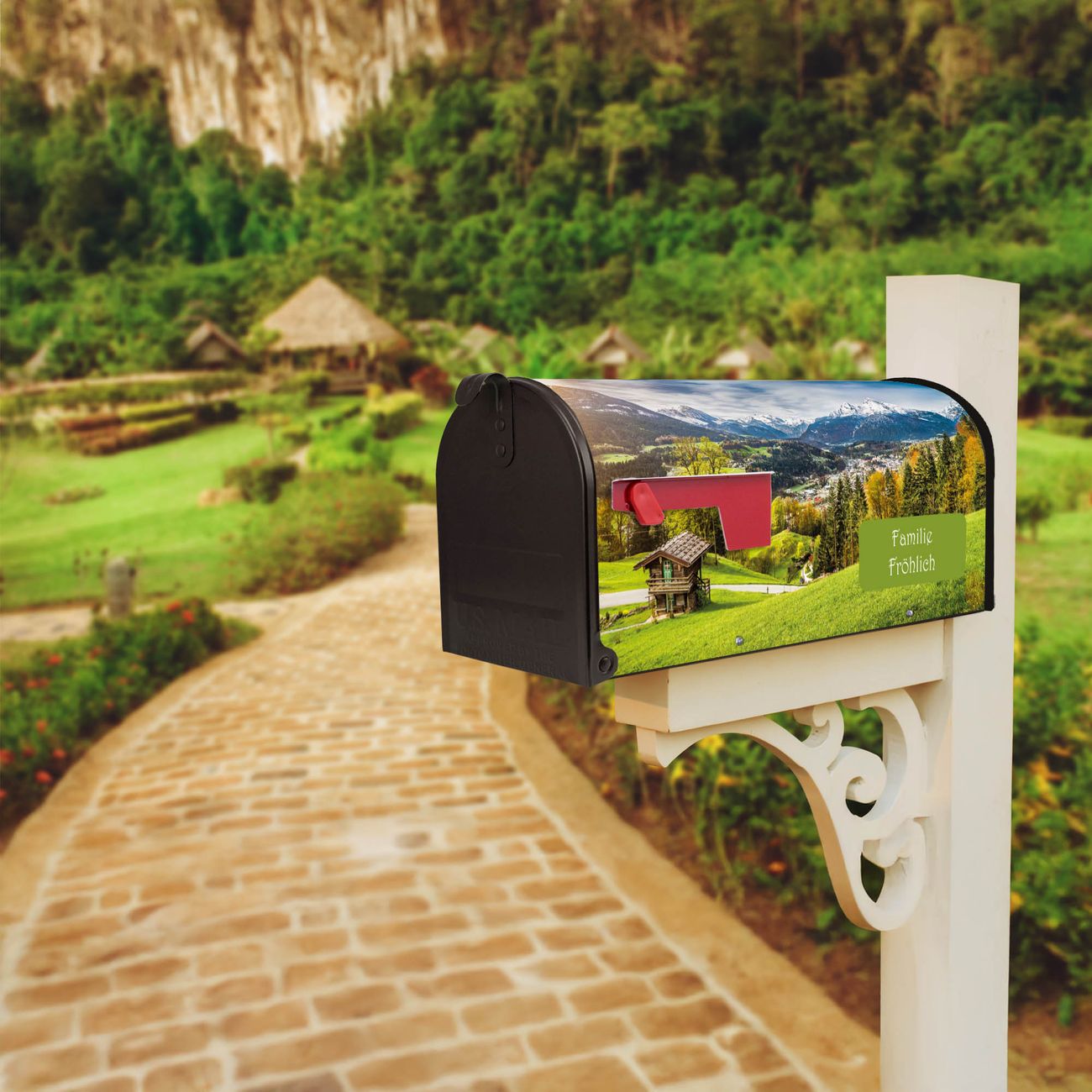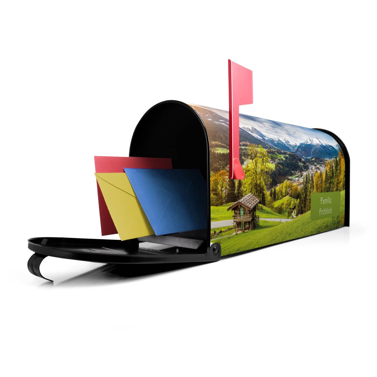 Der amerikanische Briefkasten von banjado mit Berchtesgadener Land Motiv bietet Ihnen ausreichend Fassungsvermögen, um große A4 Sendungen und Zeitschriften zu empfangen. Die typisch amerikanische rote Fahne zeigt Ihnen an, wenn Sie Post erhalten haben. Die US-Mailbox besteht aus verzinktem Stahlblech welches lackiert wurde und ist 48 x 22 x 16 CM (BxHxT) groß. Die Folie mit Motiv Berchtesgadener Land besteht aus einer wetter- und UV-resistenten Folie, die mit einem Schutzlaminat überzogen ist, sodass die US Mailbox zusätzlich vor Kratzern geschützt ist. An der Unterkante sind 4 Löcher je Seite um die Mailbox, typisch amerikanisch, an einem Holzpfahl oder einem Zaun zu befestigen. Auf Wunsch können Sie bei uns den passenden Standfuß oder die passende Wandhalterung kaufen um die US-Mailbox sicher zu befestigen. Wir bieten Ihnen ebenfalls Namensschilder, bereits beschriftet oder frei zu beschriften, und verschiedene selbst gestaltete Bitte-Keine-Werbung-Aufkleber.