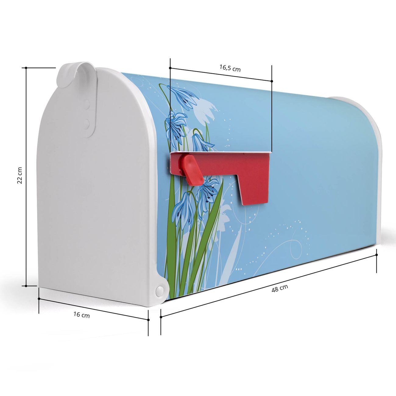 Der amerikanische Briefkasten von banjado mit Bergblaulilie Motiv bietet Ihnen ausreichend Fassungsvermögen, um große A4 Sendungen und Zeitschriften zu empfangen. Die typisch amerikanische rote Fahne zeigt Ihnen an, wenn Sie Post erhalten haben. Die US-Mailbox besteht aus verzinktem Stahlblech welches lackiert wurde und ist 48 x 22 x 16 CM (BxHxT) groß. Die Folie mit Motiv Bergblaulilie besteht aus einer wetter- und UV-resistenten Folie, die mit einem Schutzlaminat überzogen ist, sodass die US Mailbox zusätzlich vor Kratzern geschützt ist. An der Unterkante sind 4 Löcher je Seite um die Mailbox, typisch amerikanisch, an einem Holzpfahl oder einem Zaun zu befestigen. Auf Wunsch können Sie bei uns den passenden Standfuß oder die passende Wandhalterung kaufen um die US-Mailbox sicher zu befestigen. Wir bieten Ihnen ebenfalls Namensschilder, bereits beschriftet oder frei zu beschriften, und verschiedene selbst gestaltete Bitte-Keine-Werbung-Aufkleber.