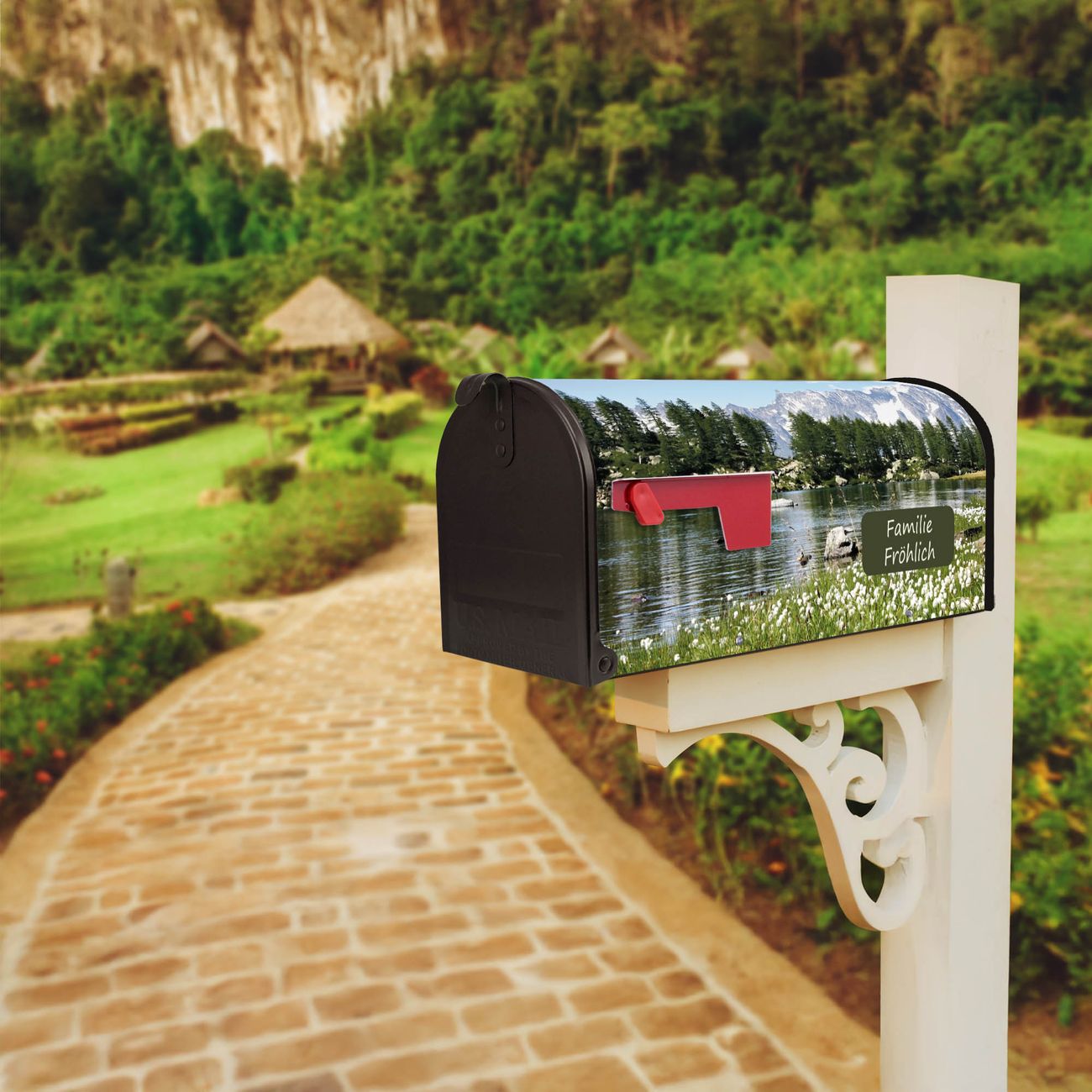 Der amerikanische Briefkasten von banjado mit Bergidylle Motiv bietet Ihnen ausreichend Fassungsvermögen, um große A4 Sendungen und Zeitschriften zu empfangen. Die typisch amerikanische rote Fahne zeigt Ihnen an, wenn Sie Post erhalten haben. Die US-Mailbox besteht aus verzinktem Stahlblech welches lackiert wurde und ist 48 x 22 x 16 CM (BxHxT) groß. Die Folie mit Motiv Bergidylle besteht aus einer wetter- und UV-resistenten Folie, die mit einem Schutzlaminat überzogen ist, sodass die US Mailbox zusätzlich vor Kratzern geschützt ist. An der Unterkante sind 4 Löcher je Seite um die Mailbox, typisch amerikanisch, an einem Holzpfahl oder einem Zaun zu befestigen. Auf Wunsch können Sie bei uns den passenden Standfuß oder die passende Wandhalterung kaufen um die US-Mailbox sicher zu befestigen. Wir bieten Ihnen ebenfalls Namensschilder, bereits beschriftet oder frei zu beschriften, und verschiedene selbst gestaltete Bitte-Keine-Werbung-Aufkleber.