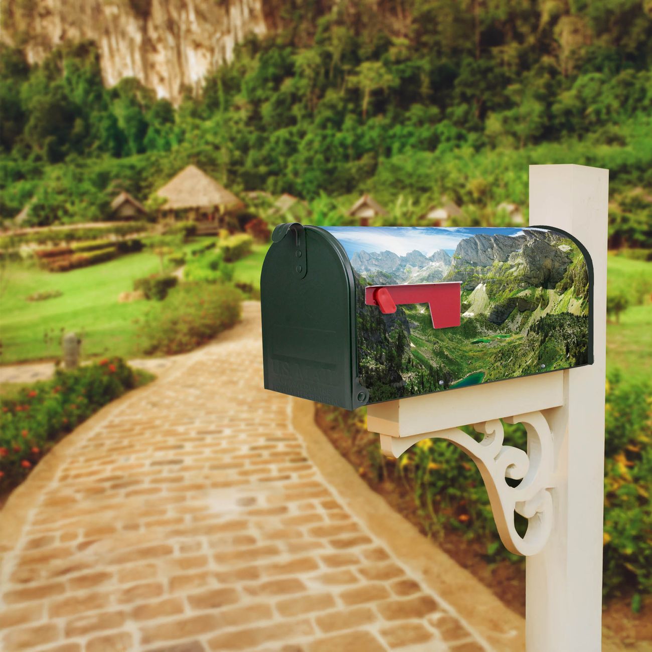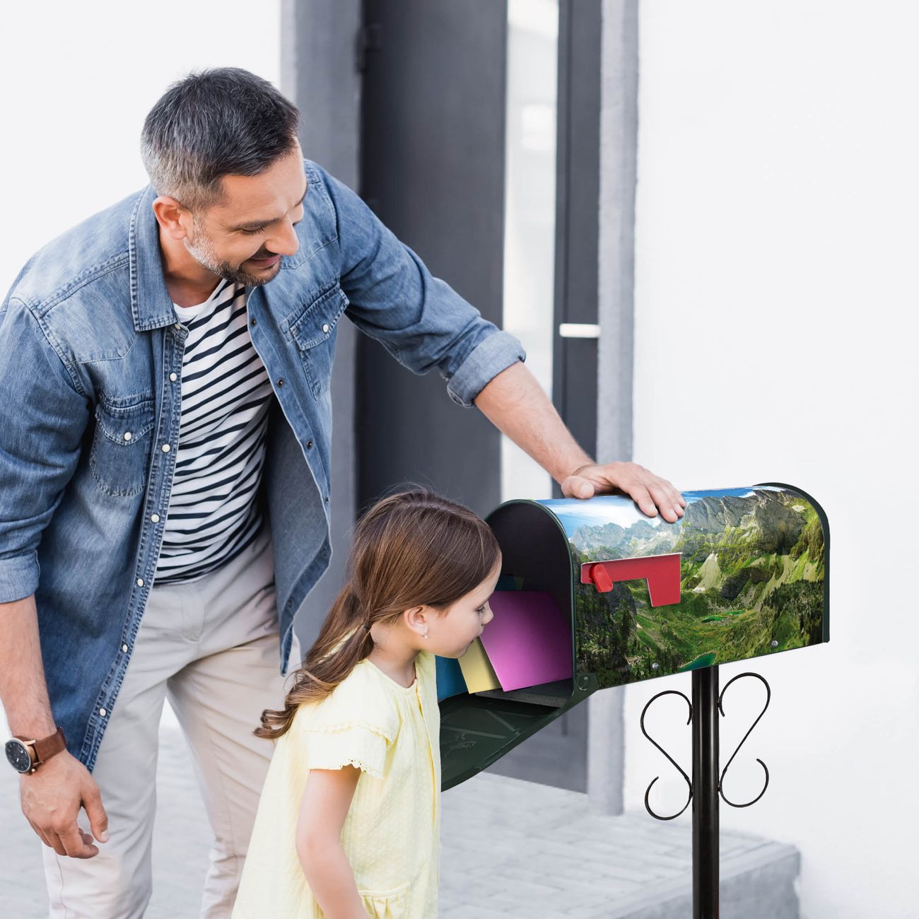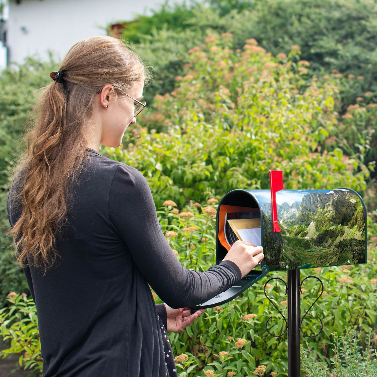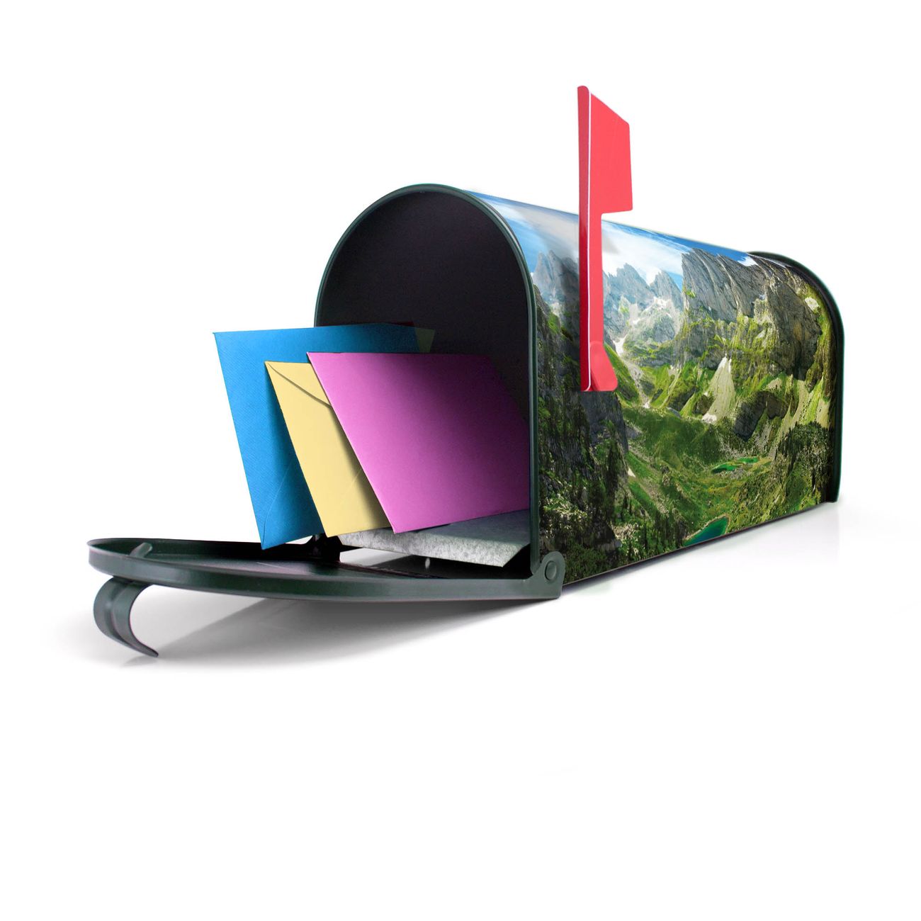Der amerikanische Briefkasten von banjado mit Bergsee Alpen Motiv bietet Ihnen ausreichend Fassungsvermögen, um große A4 Sendungen und Zeitschriften zu empfangen. Die typisch amerikanische rote Fahne zeigt Ihnen an, wenn Sie Post erhalten haben. Die US-Mailbox besteht aus verzinktem Stahlblech welches lackiert wurde und ist 48 x 22 x 16 CM (BxHxT) groß. Die Folie mit Motiv Bergsee Alpen besteht aus einer wetter- und UV-resistenten Folie, die mit einem Schutzlaminat überzogen ist, sodass die US Mailbox zusätzlich vor Kratzern geschützt ist. An der Unterkante sind 4 Löcher je Seite um die Mailbox, typisch amerikanisch, an einem Holzpfahl oder einem Zaun zu befestigen. Auf Wunsch können Sie bei uns den passenden Standfuß oder die passende Wandhalterung kaufen um die US-Mailbox sicher zu befestigen. Wir bieten Ihnen ebenfalls Namensschilder, bereits beschriftet oder frei zu beschriften, und verschiedene selbst gestaltete Bitte-Keine-Werbung-Aufkleber.