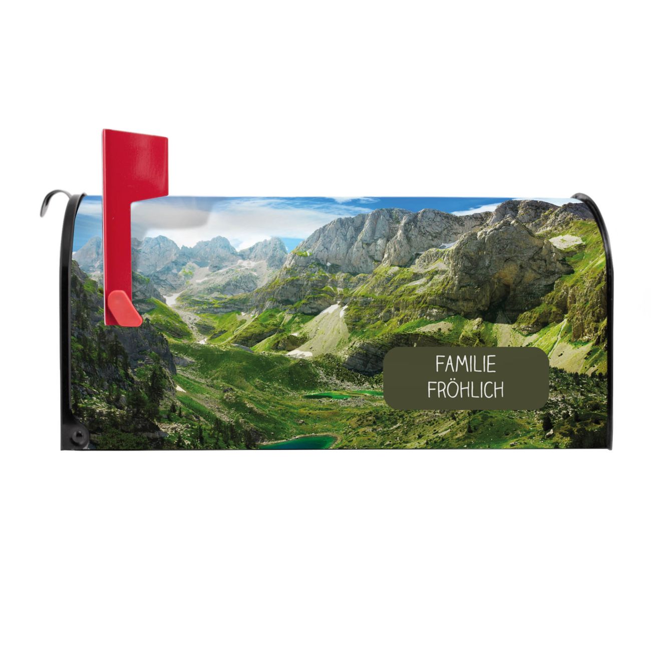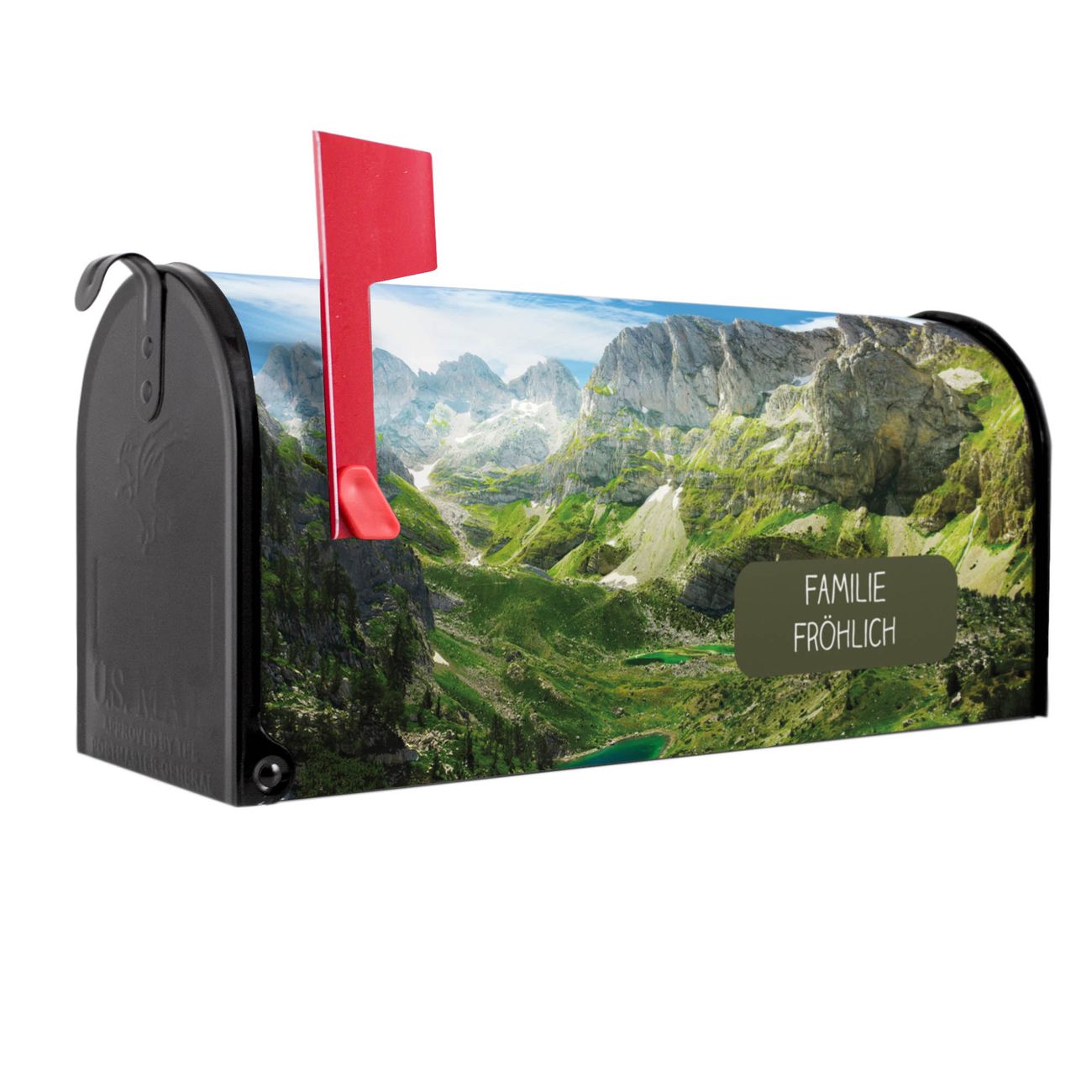Unser amerikanischer Briefkasten mit dem Motiv Bergsee Alpen hat ein sehr ansprechendes und ausgefallenes Design, ist in der Grundfarbe weiß, grün oder schwarz erhältlich. Damit entlocken Sie Ihren Nachbarn und dem Postboten immer wieder ein Lächeln. Die Mailbox ist ein Original Import aus Mississippi USA und wird von unserer kleinen Manufaktur in Sachsen von Hand veredelt. Die US-Mailbox bietet ausreichend Platz auch für große Sendungen, eine Fahne die Ihnen Post anzeigt, wetterfestes und äußerst stabiles Material - so macht Post empfangen Freude.