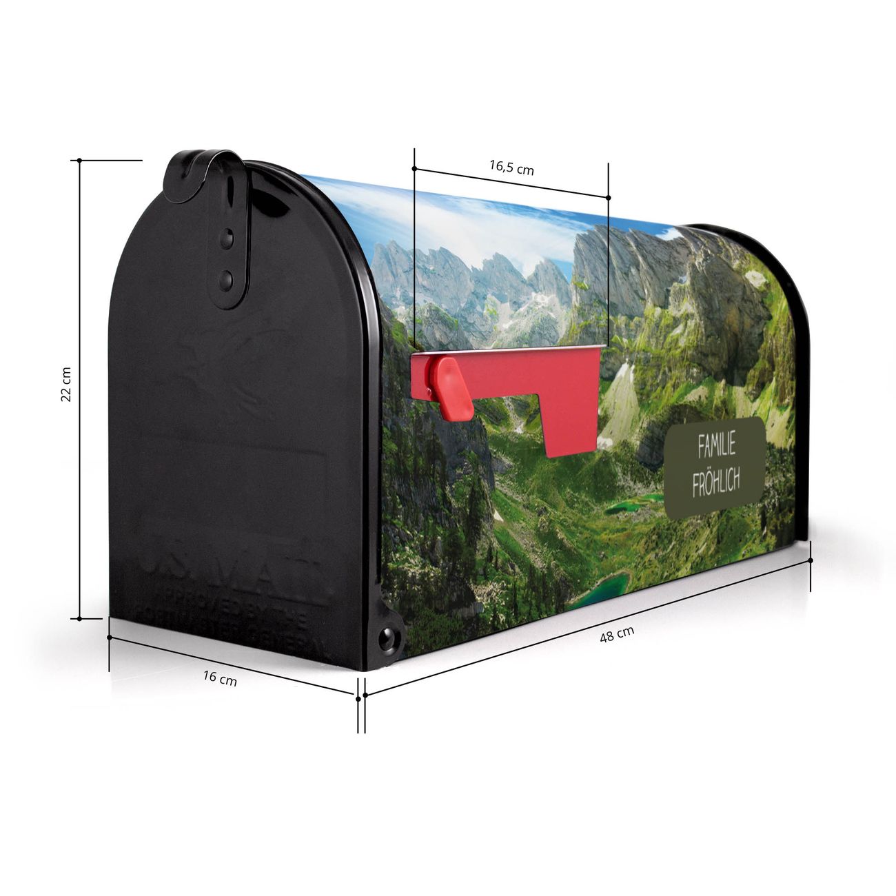 Der amerikanische Briefkasten von banjado mit Bergsee Alpen Motiv bietet Ihnen ausreichend Fassungsvermögen, um große A4 Sendungen und Zeitschriften zu empfangen. Die typisch amerikanische rote Fahne zeigt Ihnen an, wenn Sie Post erhalten haben. Die US-Mailbox besteht aus verzinktem Stahlblech welches lackiert wurde und ist 48 x 22 x 16 CM (BxHxT) groß. Die Folie mit Motiv Bergsee Alpen besteht aus einer wetter- und UV-resistenten Folie, die mit einem Schutzlaminat überzogen ist, sodass die US Mailbox zusätzlich vor Kratzern geschützt ist. An der Unterkante sind 4 Löcher je Seite um die Mailbox, typisch amerikanisch, an einem Holzpfahl oder einem Zaun zu befestigen. Auf Wunsch können Sie bei uns den passenden Standfuß oder die passende Wandhalterung kaufen um die US-Mailbox sicher zu befestigen. Wir bieten Ihnen ebenfalls Namensschilder, bereits beschriftet oder frei zu beschriften, und verschiedene selbst gestaltete Bitte-Keine-Werbung-Aufkleber.