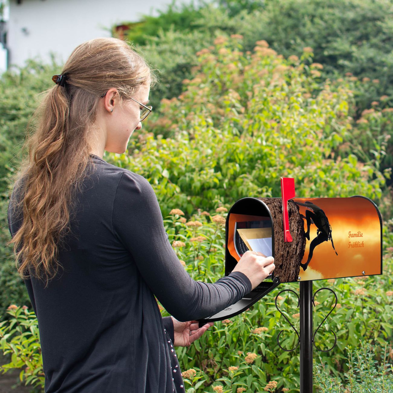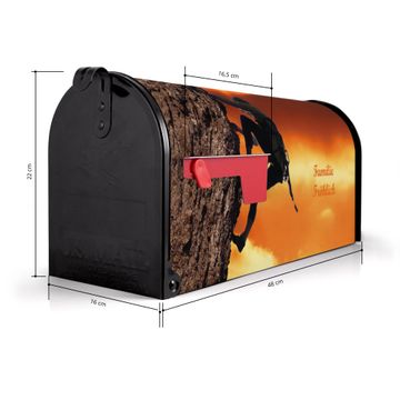 Der amerikanische Briefkasten von banjado mit Bergsteiger Motiv bietet Ihnen ausreichend Fassungsvermögen, um große A4 Sendungen und Zeitschriften zu empfangen. Die typisch amerikanische rote Fahne zeigt Ihnen an, wenn Sie Post erhalten haben. Die US-Mailbox besteht aus verzinktem Stahlblech welches lackiert wurde und ist 48 x 22 x 16 CM (BxHxT) groß. Die Folie mit Motiv Bergsteiger besteht aus einer wetter- und UV-resistenten Folie, die mit einem Schutzlaminat überzogen ist, sodass die US Mailbox zusätzlich vor Kratzern geschützt ist. An der Unterkante sind 4 Löcher je Seite um die Mailbox, typisch amerikanisch, an einem Holzpfahl oder einem Zaun zu befestigen. Auf Wunsch können Sie bei uns den passenden Standfuß oder die passende Wandhalterung kaufen um die US-Mailbox sicher zu befestigen. Wir bieten Ihnen ebenfalls Namensschilder, bereits beschriftet oder frei zu beschriften, und verschiedene selbst gestaltete Bitte-Keine-Werbung-Aufkleber.