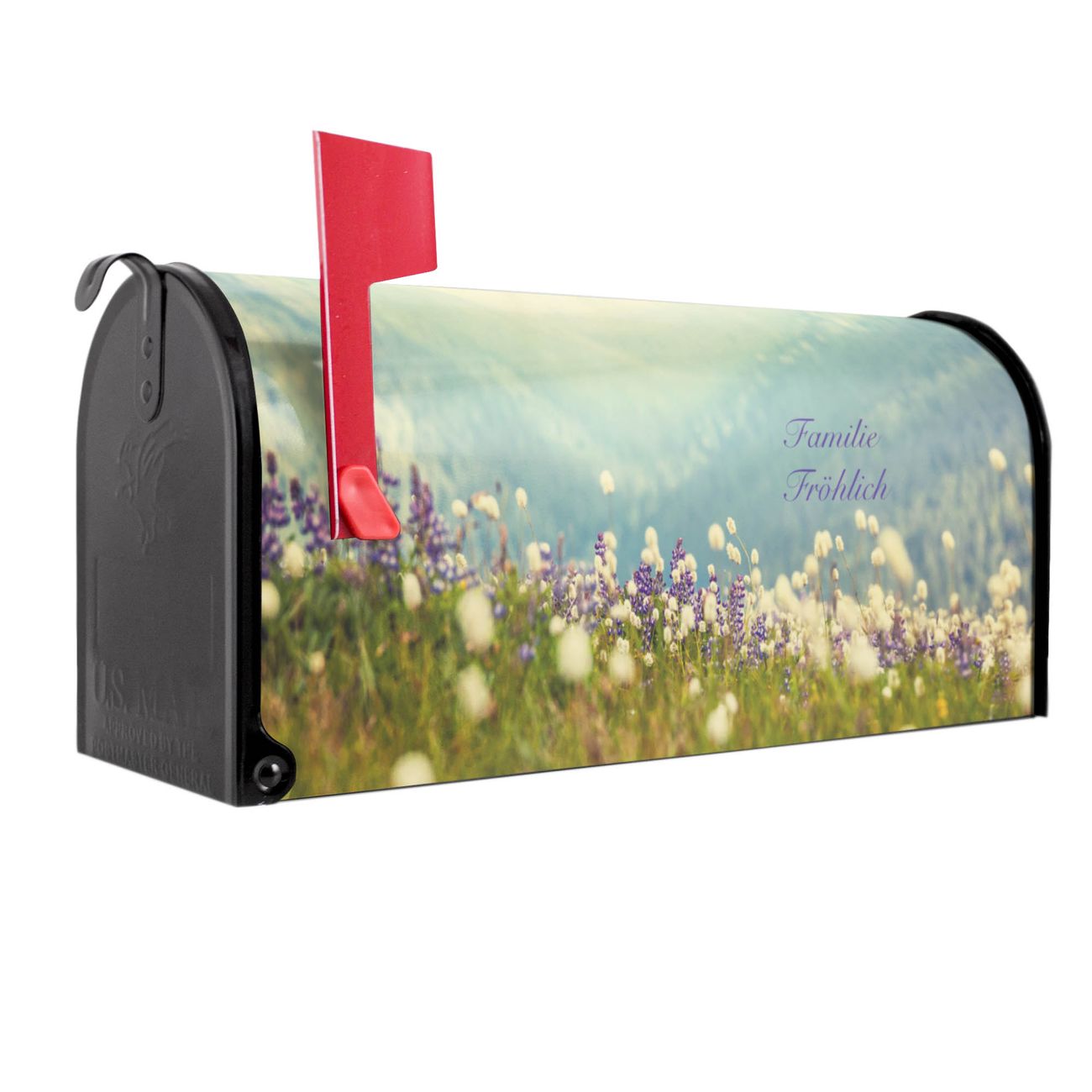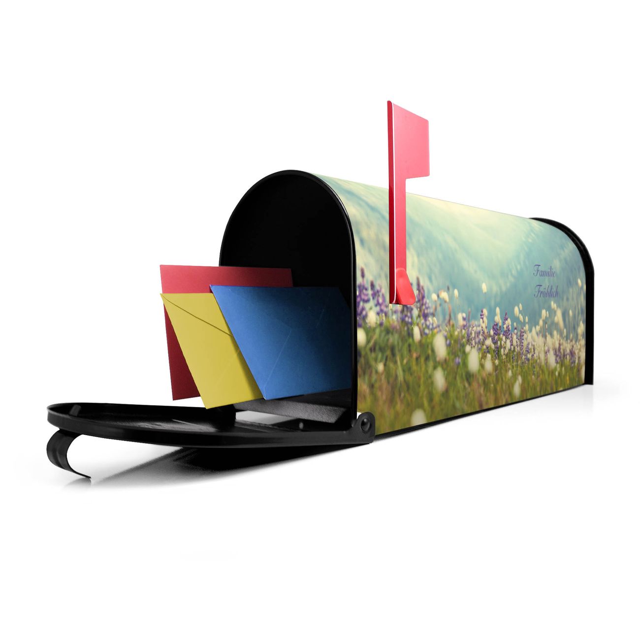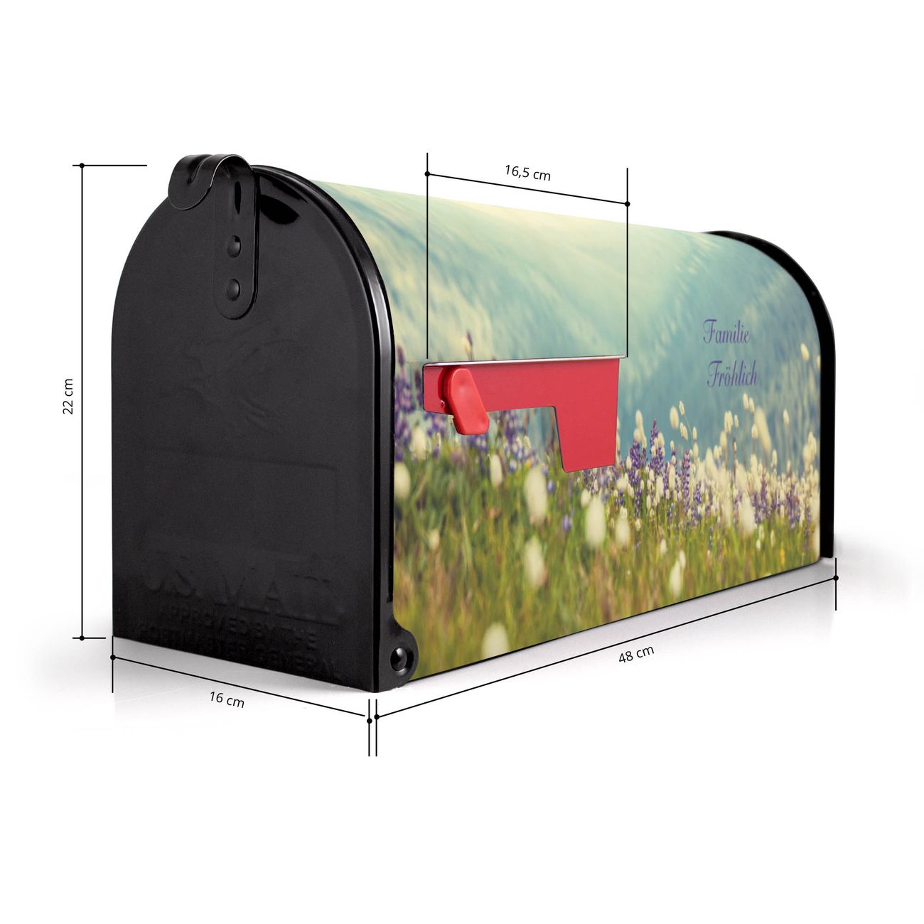 Der amerikanische Briefkasten von banjado mit Bergwiese Motiv bietet Ihnen ausreichend Fassungsvermögen, um große A4 Sendungen und Zeitschriften zu empfangen. Die typisch amerikanische rote Fahne zeigt Ihnen an, wenn Sie Post erhalten haben. Die US-Mailbox besteht aus verzinktem Stahlblech welches lackiert wurde und ist 48 x 22 x 16 CM (BxHxT) groß. Die Folie mit Motiv Bergwiese besteht aus einer wetter- und UV-resistenten Folie, die mit einem Schutzlaminat überzogen ist, sodass die US Mailbox zusätzlich vor Kratzern geschützt ist. An der Unterkante sind 4 Löcher je Seite um die Mailbox, typisch amerikanisch, an einem Holzpfahl oder einem Zaun zu befestigen. Auf Wunsch können Sie bei uns den passenden Standfuß oder die passende Wandhalterung kaufen um die US-Mailbox sicher zu befestigen. Wir bieten Ihnen ebenfalls Namensschilder, bereits beschriftet oder frei zu beschriften, und verschiedene selbst gestaltete Bitte-Keine-Werbung-Aufkleber.